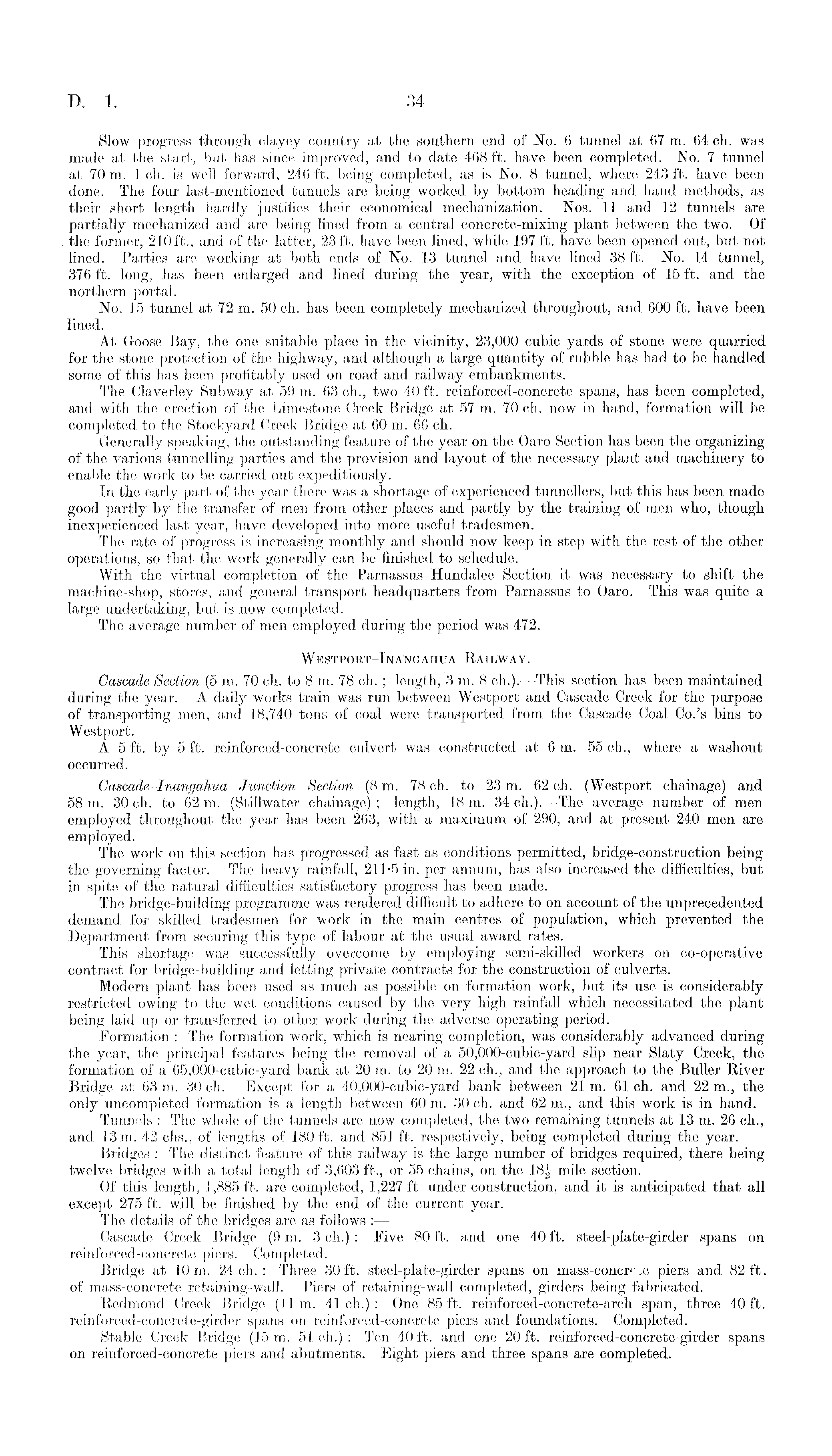 Slow progress through clayey country at the southern end of No. 6 tunnel at 67 m. 64 ch. was made at the start, but has since improved, and to date 468 ft. have been completed. No. 7 tunnel at 70 m. 1 ch. is well forward, 246 ft. being completed, as is No. 8 tunnel, where 243 ft. have been done. The four last-mentioned tunnels are being worked by bottom heading and hand methods, as their short length hardly justifies their economical mechanization. Nos. 11 and 12 tunnels are partially mechanized and are being lined from a central concrete-mixing plant between the two. Of the former, 210 ft., and of the latter, 23 ft. have been lined, while 197 ft. have been opened out, but not lined. Parties are working at both ends of No. 13 tunnel and have lined 38 ft. No. 14 tunnel, 376 ft. long, has been enlarged and lined during the year, with the exception of 15 ft. and the northern portal. No. 15 tunnel at 72 m. 50 ch. has been completely mechanized throughout, and 600 ft. have been lined. At Goose Bay, the one suitable place in the vicinity, 23,000 cubic yards of stone were quarried for the stone protection of the highway, and although a large quantity of rubble has had to be handled some of this has been profitably used on road and railway embankments. The Claverley Subway at 59 m. 63 ch., two 40 ft. reinforced-concrete spans, has been completed, and with the erection of the Limestone Creek Bridge at 57 m. 70 ch. now in hand, formation will be completed to the Stockyard Creek Bridge at 60 m. 66 ch. Generally speaking, the outstanding feature of the year on the Oaro Section has been the organizing of the various tunnelling parties and the provision and layout of the necessary plant and machinery to enable the work to be carried out expeditiously. In the early part of the year there was a shortage of experienced tunnellers, but this has been made good partly by the transfer of men from, other places and partly by the training of men who, though inexperienced last year, have developed into more useful tradesmen. The rate of progress is increasing monthly and should now keep in step with the rest of the other operations, so that the work generally can be finished to schedule. With the virtual completion of the Parnassus-Hundalee Section it was necessary to shift the machine-shop, stores, and general transport headquarters from Parnassus to Oaro. This was quite a large undertaking, but is now completed. The average number of men employed during the period was 472. Westport-Inangahua Railway. Cascade Section (5 m. 70 ch. to 8 m. 78 ch. ; length, 3 m. 8 ch.). —This section has been maintained during the year. A daily works train was run. between Westport and Cascade Creek for the purpose of transporting men, and 18,74.0 tons of coal were transported from the Cascade Coal Co.'s bins to Westport. A 5 ft. by 5 ft. reinforced-concrete culvert was constructed at 6m. 55 ch., where a washout occurred. Cascade-Inangahua Junction Section (8 m. 78 ch. to 23 m. 62 ch. (Westport chainage) and 58 m. 30 ch. to 62 m. (Stillwater chainage); length, 18 m. 34 ch.). The average number of men employed throughout the year has been 263, with a maximum of 290, and at present 240 men are employed. The work on this section has progressed as fast as conditions permitted, bridge-construction being the governing factor. The heavy rainfall, 211-5 in. per annum, has also increased the difficulties, but in spite of the natural difficulties satisfactory progress has been made. The bridge-building programme was rendered difficult to adhere to on account of the unprecedented demand for skilled tradesmen for work in the main centres of population, which prevented the Department from securing this type of labour at the usual award rates. This shortage was successfully overcome by employing semi-skilled workers on co-operative contract for bridge-building and letting private contracts for the construction of culverts. Modern plant has been used as much as possible on formation work, but its use is considerably restricted owing to the wet conditions caused by the very high rainfall which necessitated the plant being laid up or transferred to other work during the adverse operating period. Formation : The formation work, which is nearing completion, was considerably advanced during the year, the principal features being the removal of a 50,000-cubic-yard slip near Slaty Creek, the formation of a 65,000-cubic-yard bank at 20 m. to 20 m. 22 ch., and the approach to the Buller River Bridge at 63 m. 30 ch. Except for a 40,000-cubic-yard bank between 21 m. 61 ch. and 22 m., the only uncompleted formation is a length between 60 m. 30 ch. and 62 m., and this work is in hand. Tunnels : The whole of the tunnels are now completed, the two remaining tunnels at 13 m. 26 ch., and 13 m. 42 chs., of lengths of 180 ft. and 851 ft. respectively, being completed during the year. Bridges : The distinct feature of this railway is the large number of bridges required, there being twelve bridges with a total length of 3,603 ft., or 55 chains, on the 18| mile section. Of this length, 1,885 ft. are completed, 1,227 ft under construction, and it is anticipated that all except 275 ft. will be finished by the end. of the current year. The details of the bridges are as follows : — Cascade Creek Bridge (9 m. 3 ch.): Five 80 ft. and one 40 ft. steel-plate-girder spans on reinforced-concrete piers. Completed. Bridge at 10 m. 24 ch. : Three 30 ft. steel-plate-girder spans on mass-concr<- piers and 82 ft. of mass-concrete retaining-wall. Piers of retaining-wall completed, girders being fabricated. Redmond Creek Bridge (11m. 41 ch.) : One 85 ft. reinforced-concrete-arch span, three 40 ft. reinforced-concrete-girder spans on reinforced-concrete piers and foundations. Completed. Stable Creek Bridge (15 m. 51 ch.) : Ten 40 ft. and one 20 ft. reinforced-concrete-girder spans on reinforced-concrete jsiers and abutments. Eight piers and three spans are completed.
