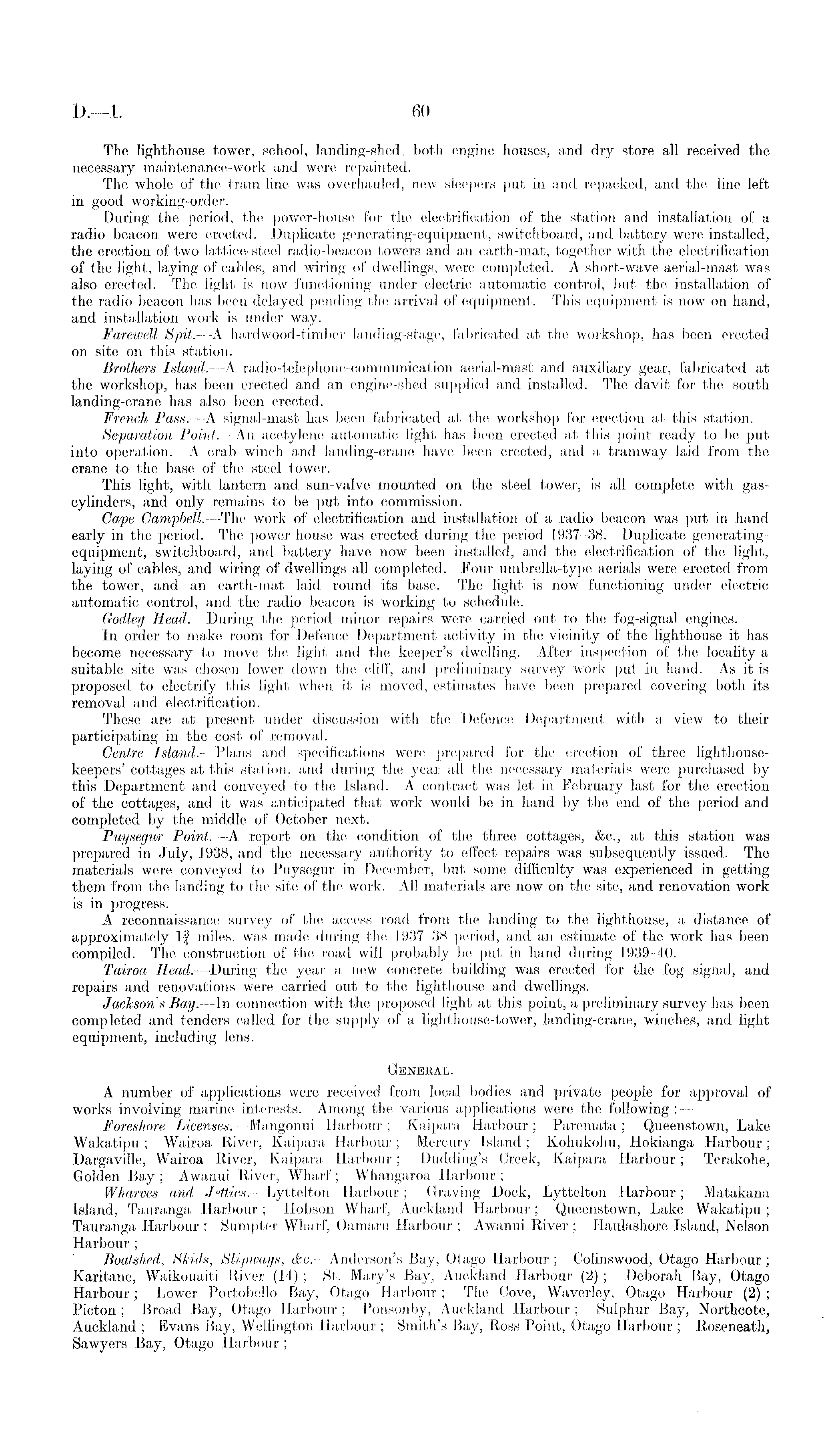 The lighthouse tower, school, landing-shed, both engine houses, and dry store all received the necessary maintenance-work and were repainted. The whole of the tram-line was overhauled, new sleepers put in and repacked, and the line left in good working-order. During the period, the power-house for the electrification of the station and installation of a radio beacon were erected. Duplicate generating-equipment, switchboard, and battery were installed, the erection of two lattice-steel radio-beacon towers and an earth-mat, together with the electrification of the light, laying of cables, and wiring of dwellings, were completed. A short-wave aerial-mast was also erected. The light is now functioning under electric automatic control, but the installation of the radio beacon has been delayed pending the arrival of equipment. This equipment is now on hand, and installation work is under way. Farewell Spit.—A hardwood-timber landing-stage, fabricated at the workshop, has been erected on site on this station. Brothers Island. —A radio-telephone-communication aerial-mast and auxiliary gear, fabricated at the workshop, has been erected and an engine-shed supplied and installed. The davit for the south landing-crane has also been erected. French Pass.—A signal-mast has been fabricated at the workshop for erection at this station. Separation Point.—An acetylene automatic light has been erected at this point ready to be put into operation. A crab winch and landing-crane have been erected, and a tramway laid from the crane to the base of the steel tower. This light, with lantern and sun-valve mounted on the steel tower, is all complete with gascylinders, and only remains to be put into commission. Cape Campbell. —-The work of electrification and installation of a radio beacon was put in hand early in the period. The power-house was erected during the period 1937-38. Duplicate generatingequipment, switchboard, and battery have now been installed, and the electrification of the light, laying of cables, and wiring of dwellings all completed. Four umbrella-type aerials were erected from the tower, and an earth-mat laid round its base. The light is now functioning under electric automatic control, and the radio beacon is working to schedule. Godley Head. —During the period minor repairs were carried out to the fog-signal engines. In order to make room for Defence Department activity in the vicinity of the lighthouse it has become necessary to move the light and the keeper's dwelling. After inspection of the locality a suitable site was chosen lower down the cliff, and preliminary survey work put in hand. As it is proposed to electrify this light when it is moved, estimates have been prepared covering both its removal and electrification. These are at present under discussion with the Defence Department with a view to their participating in the cost of removal. Centre Island. —Plans and specifications were prepared for the erection of three lighthousekeepers' cottages at this station, and during the year all the necessary materials were purchased by this Department and conveyed to the Island. A contract was let in February last for the erection of the cottages, and it was anticipated that work would be in hand by the end of the period and completed by the middle of October next. Puysegur Point. —A report on the condition of the three cottages, &c., at this station was prepared in July, 1938, and the necessary authority to effect repairs was subsequently issued. The materials were conveyed to Puysegur in December, but some difficulty was experienced in getting them from the landing to the site of the work. All materials are now on the site, and renovation work is in progress. A reconnaissance survey of the access road from the landing to the lighthouse, a distance of approximately If miles, was made during the 1937-38 period, and an estimate of the work has been compiled. The construction of the road will probably be put in hand during 1939-40. Tairoa Head. —During the year a new concrete building was erected for the fog signal, and repairs and renovations were carried out to the lighthouse and dwellings. Jackson s Bay. —In connection with the proposed light at this point, a preliminary survey has been completed and tenders called for the supply of a lighthouse-tower, landing-crane, winches, and light equipment, including lens. General. A number of applications were received from local bodies and private people for approval of works involving marine interests. Among the various applications were the following Foreshore Licenses. —Mangonui Harbour ; Kaipara Harbour ; Paremata ; Queenstown, Lake Wakatipu ; Wairoa River, Kaipara Harbour ; Mercury Island ; Kohukohu, Hokianga Harbour ; Dargaville, Wairoa River, Kaipara Harbour; Dudding's Creek, Kaipara Harbour; Terakohe, Golden Bay ; Awanui River, Wharf ; Whangaroa Harbour ; Wharves and Jetties. —Lyttelton Harbour ; Graving Dock, Lyttelton Harbour; Matakana Island, Tauranga Harbour ; Hobson Wharf, Auckland Harbour; Queenstown, Lake Wakatipu ; Tauranga Harbour ; Sumpter Wharf, Oamaru Harbour ; Awanui River : Ilaulashore Island, Nelson Harbour; Boatshed, Skids, Slipways, &c. —Anderson's Bay, Otago Harbour ; Colinswood, Otago Harbour ; Karitane, Waikouaiti River (14); St. Mary's Bay, Auckland Harbour (2) ; Deborah Bay, Otago Harbour; Lower Portobello Bay, Otago Harbour; The Cove, Waverley, Otago Harbour (2) ; Picton ; Broad Bay, Otago Harbour ; Ponsonby, Auckland Harbour ; Sulphur Bay, Northcote, Auckland ; Evans Bay, Wellington Harbour ; Smith's Bay, Ross Point, Otago Harbour ; Roseneath, Sawyers Bay, Otago Harbour ;