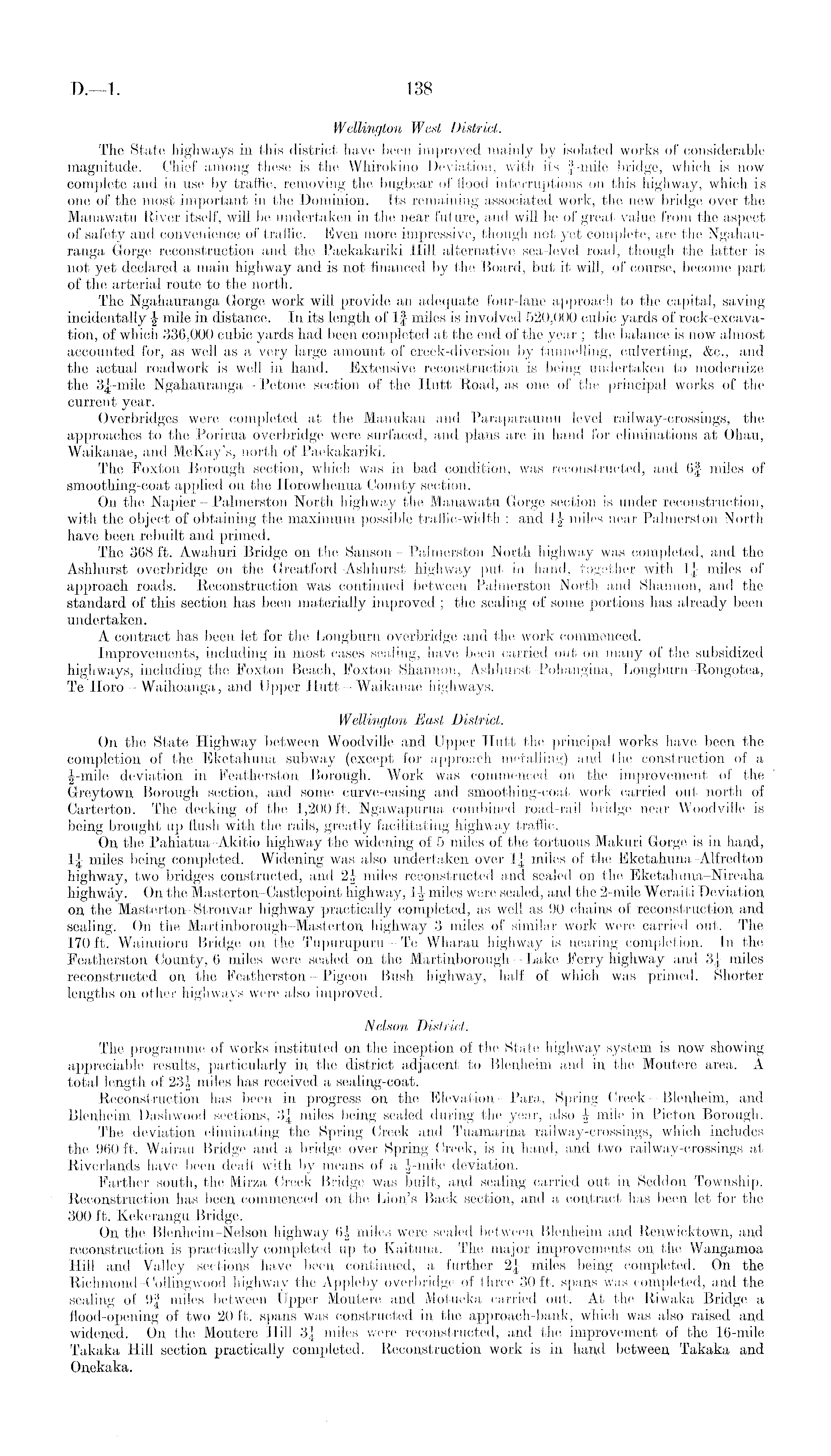 Wellington West District. The State highways in this district have been improved mainly by isolated works of considerable magnitude. Chief among these is the Whirokino Deviation, with its f-mile bridge, which is now complete and in use by traffic, removing the bugbear of flood interruptions on this highway, which is one of the most important in the Dominion. Its remaining associated work, the new bridge over the Manawatu River itself, will be undertaken in the near future, and will be of great value from the aspect of safety and convenience of traffic. Even more impressive, though not yet complete, are the Ngahauranga Gorge reconstruction and the Paekakariki Hill alternative sea-level road, though the latter is not yet declared a main highway and is not financed by the Board, but it will, of course, become part of the arterial route to the north. The Ngahauranga Gorge work will provide an adequate four-lane approach to the capital, saving incidentally J mile in distance. In its length of If miles is involved 520,000 ciibic yards of rock-excava-tion, of which 336,000 cubic yards had been completed at the end of the year ; the balance is now almost accounted for, as well as a very large amount of creek-diversion by tuunelling, culverting, &c., and the actual roadwork is well in hand. Extensive reconstruction is being undertaken to modernize the 3|-mile Ngahauranga - Petone section of the Hutt Road, as one of the principal works of the current year. Overbridges were completed at the Manukau and Paraparaumu level railway-crossings, the approaches to the Porirua overbridge were surfaced, and plans are in hand for eliminations at Ohau, Waikanae, and McKay's, north of Paekakariki. The Foxton Borough section, which was in bad condition, was reconstructed, and 6f miles of smoothing-coat applied on the Horowhenua County section. On the Napier - Palmerston North highway the Manawatu Gorge section is under reconstruction, with the object of obtaining the maximum possible traffic-width ; and 1| miles near Palmerston North have been rebuilt and primed. The 368 ft. Awahuri Bridge on the Sanson - Palmerston North highway was completed, and the Ashhurst overbridge on the Greatford-Ashhurst highway put in hand, together with IJ miles of approach roads. Reconstruction was continued between Palmerston North and Shannon, and the standard of this section has been materially improved ; the sealing of some portions has already been undertaken. A contract has been let for the Longburn overbridge and the work commenced. Improvements, including in most cases sealing, have been carried out on many of the subsidized highways, including the Foxton Beach, Foxton-Shannon, Ashhurst-Pohangina, Longburn-Rongotea, Te Horo - Waihoanga, and Upper Hutt - Waikanae highways. Wellington East District. On the State Highway between Woodville and Upper Hutt the principal works have been the completion of the Eketahuna subway (except for approach metalling) and the construction of a |-mile deviation in Feathorston Borough. Work was commenced on the improvement of the Greytown Borough section, and some curve-easing and. smoothing-coat work carried out north of Carterton. The decking of the 1,200 ft. Ngawapurua combined road-rail bridge near Woodville is being brought up flush with the rails, greatly facilitating highway traffic. On the Pahiatua-Akitio highway the widening of 5 miles of the tortuous Makuri Gorge is in hand, miles being completed. Widening was also undertaken over 1J miles of the Eketahuna-Alfredton highway, two bridges constructed, and 2| miles reconstructed and sealed on the Eketahuna-Nireaha highw&y. On the Masterton-Castlepoint highway, IJ miles were sealed, and the 2-mile Weraiti Deviation on the Masterton-Stronvar highway practically completed, as well as 90 chains of reconstruction and sealing. On the Martinborough-Masterton highway 3 miles of similar work were carried out. The 170 ft. Wainuioru Bridge on the Tupurupuru -Te Wharau highway is nearing completion. In the Featherston County, 6 miles were sealed on the Martinborough - Lake Ferry highway and 3J miles reconstructed on the Featherston - Pigeon Bush highway, half of which was primed. Shorter lengths on other highways were also improved. Nelson District. The programme of works instituted on the inception of the State highway system is now showing appreciable results, particularly in the district adjacent to Blenheim and in the Moutere" area. A total length of 23| miles has received a sealing-coat. Reconstruction has been in progress on the Elevation - Para, Spring Creek - Blenheim, and Blenheim-Dashwood sections, 3| miles being sealed during the year, also | mile in Picton Borough. The deviation eliminating the Spring Creek and Tuamarina railway-crossings, which includes the 960 ft. Wairau Bridge and a bridge over Spring Creek, is in hand, and two railway-crossings at Riverlands have been dealt with by means of a |-mile deviation. Farther south, the Mirza Creek Bridge was built, and sealing carried out in Seddon Township. Reconstruction has been commenced on the Lion's Back section, and a contract has been let for the 300 ft. Kekerangu Bridge. On the Blenheim-Nelson highway 6i miles were sealed between Blenheim and Renwicktown, and reconstruction is practically completed up to Kaituna. The major improvements on the Wangamoa Hill and Valley sections have been continued, a further 2|- miles being completed. On the Richmond-Collingwood highway the Appleby overbridge of three 30 ft. spans was completed, and the sealing of 9f miles between Upper Moutere and Motueka carried out. At the Riwaka Bridge a flood-opening of two 20 ft. spans was constructed in the approach-bank, which was also raised and widened. On the Moutere Hill 3J miles were reconstructed, and the improvement of the 16-mile Takaka Hill section practically completed. Reconstruction work is in hand between Takaka and Onekaka.