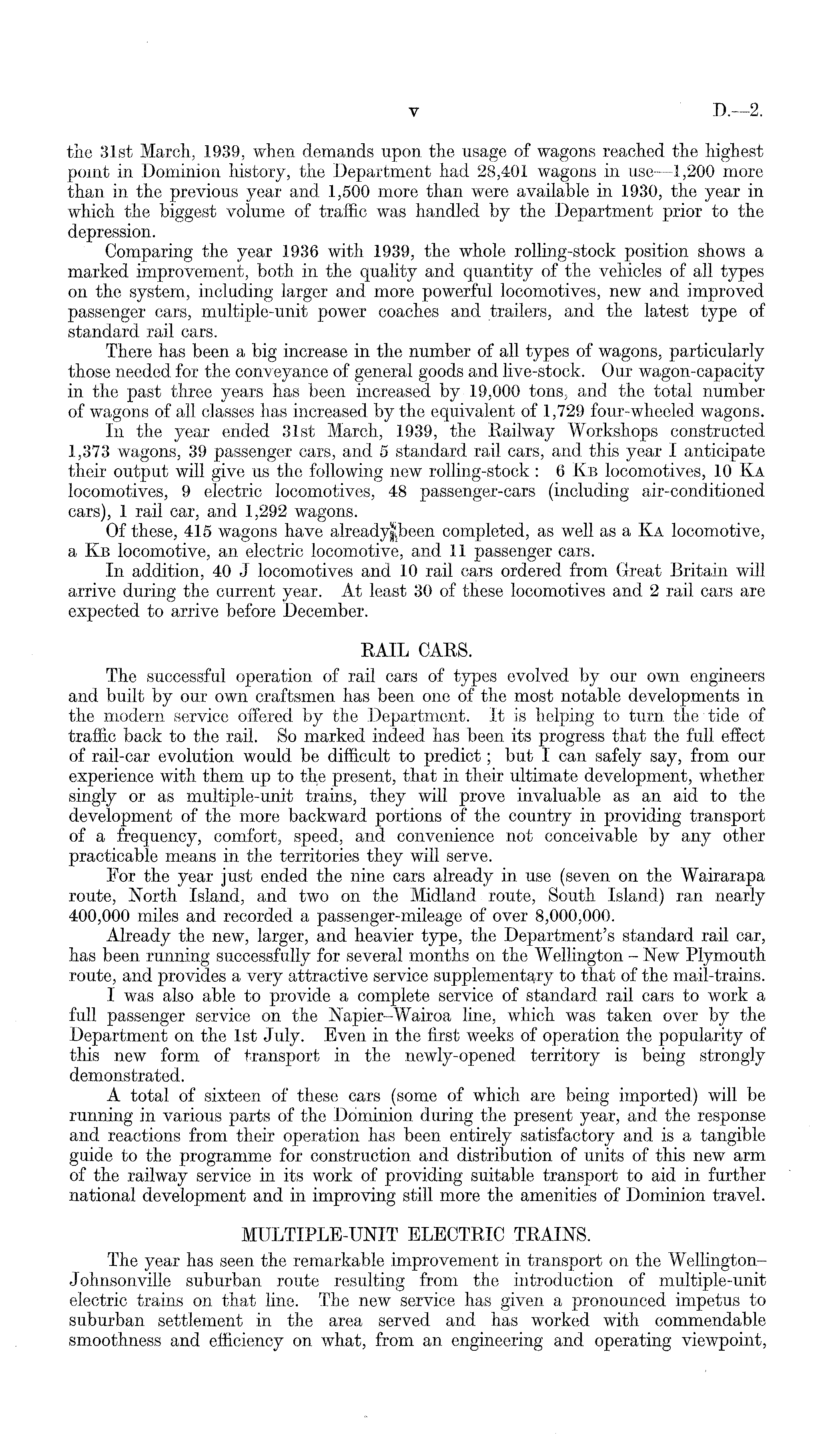 the 31st March, 1939, when demands upon the usage of wagons reached the highest point in Dominion history, the Department had 28,401 wagons in use —1,200 more than in the previous year and 1,500 more than were available in 1930, the year in which the biggest volume of traffic was handled by the Department prior to the depression. Comparing the year 1936 with 1939, the whole rolling-stock position shows a marked improvement, both in the quality and quantity of the vehicles of all types on the system, including larger and more powerful locomotives, new and improved passenger cars, multiple-unit power coaches and trailers, and the latest type of standard rail cars. There has been a big increase in the number of all types of wagons, particularly those needed for the conveyance of general goods and live-stock. Our wagon-capacity in the past three years has been increased by 19,000 tons, and the total number of wagons of all classes has increased by the equivalent of 1,729 four-wheeled wagons. In the year ended 31st March, 1939, the Railway Workshops constructed 1,373 wagons, 39 passenger cars, and 5 standard rail cars, and this year I anticipate their output will give us the following new rolling-stock : 6Kb locomotives, 10 Ka locomotives, 9 electric locomotives, 48 passenger-cars (including air-conditioned cars), 1 rail car, and 1,292 wagons. Of these, 415 wagons have already|been completed, as well as a Ka locomotive, a Kb locomotive, an electric locomotive, and 11 passenger cars. In addition, 40 J locomotives and 10 rail cars ordered from Great Britain will arrive during the current year. At least 30 of these locomotives and 2 rail cars are expected to arrive before December. RAIL CARS. The successful operation of rail cars of types evolved by our own engineers and built by our own craftsmen has been one of the most notable developments in the modern service offered by the Department. It is helping to turn the tide of traffic back to the rail. So marked indeed has been its progress that the full effect of rail-car evolution would be difficult to predict; but I can safely say, from our experience with them up to the present, that in their ultimate development, whether singly or as multiple-unit trains, they will prove invaluable as an aid to the development of the more backward portions of the country in providing transport of a frequency, comfort, speed, and convenience not conceivable by any other practicable means in the territories they will serve. For the year just ended the nine cars already in use (seven on the Wairarapa route, North Island, and two on the Midland route, South Island) ran nearly 400,000 miles and recorded a passenger-mileage of over 8,000,000. Already the new, larger, and heavier type, the Department's standard rail car, has been running successfully for several months on the Wellington - New Plymouth route, and provides a very attractive service supplementary to that of the mail-trains. I was also able to provide a complete service of standard rail cars to work a full passenger service on the Napier-Wairoa line, which was taken over by the Department on the Ist July. Even in the first weeks of operation the popularity of this new form of transport in the newly-opened territory is being strongly demonstrated. A total of sixteen of these cars (some of which are being imported) will be running in various parts of the Dominion during the present year, and the response and reactions from their operation has been entirely satisfactory and is a tangible guide to the programme for construction and distribution of units of this new arm of the railway service in its work of providing suitable transport to aid in further national development and in improving still more the amenities of Dominion travel. MULTIPLE-UNIT ELECTRIC TRAINS. The year has seen the remarkable improvement in transport on the WellingtonJohnson ville suburban route resulting from the introduction of multiple-unit electric trains on that line. The new service has given a pronounced impetus to suburban settlement in the area served and has worked with commendable smoothness and efficiency on what, from an engineering and operating viewpoint,