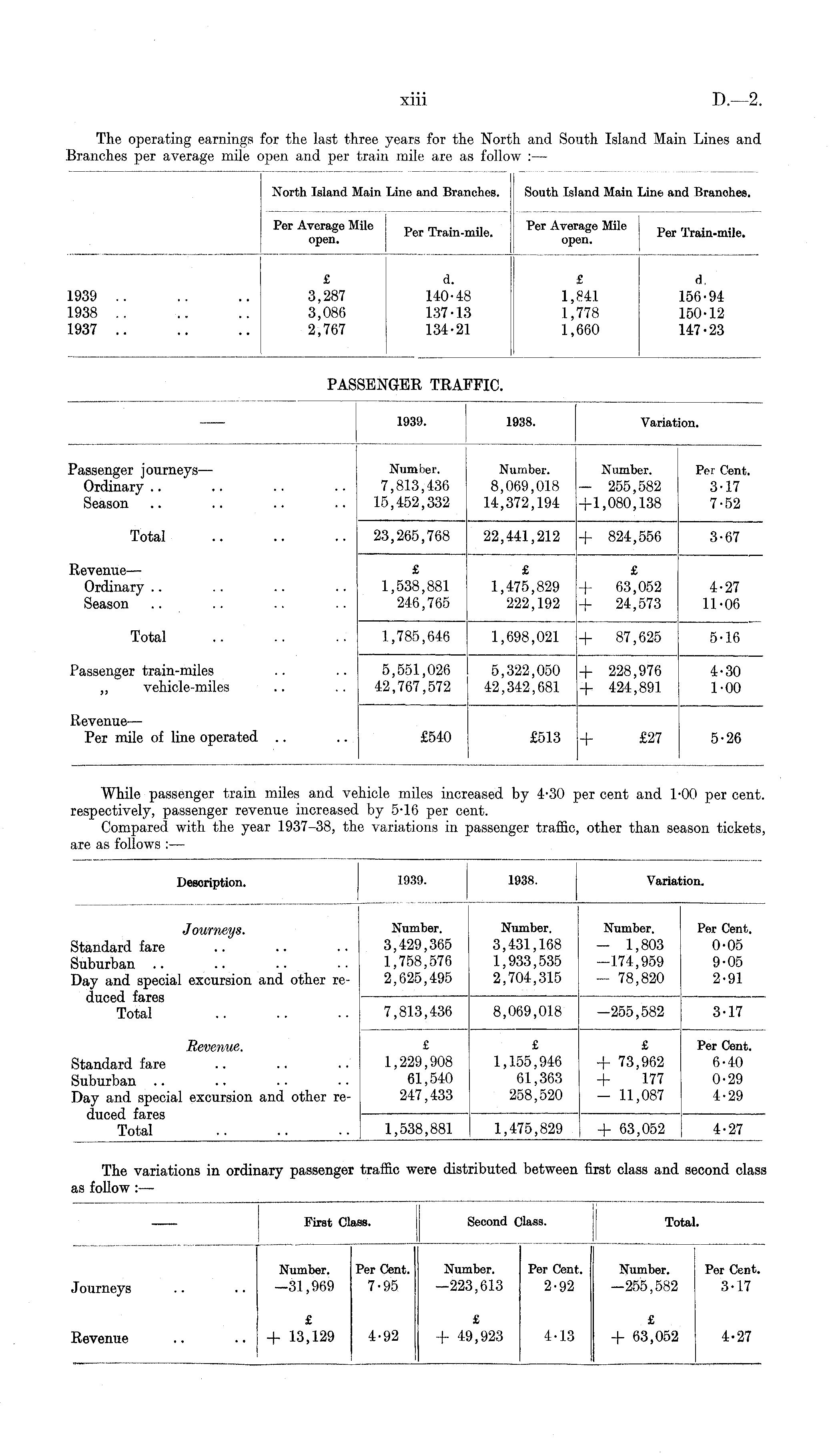 North Island Main Line and Branches. South Island Main Line and Branohes. Per Average Mile Per Train . mi]e . Per Average Mile Per Train . m1le . open. open. £ d. £ d. 1939 .. .. .. 3,287 140-48 1,841 156-94 1938 .. .. .. 3,086 137-13 1,778 150-12 1937 .. .. .. 2,767 134-21 1,660 147-23
