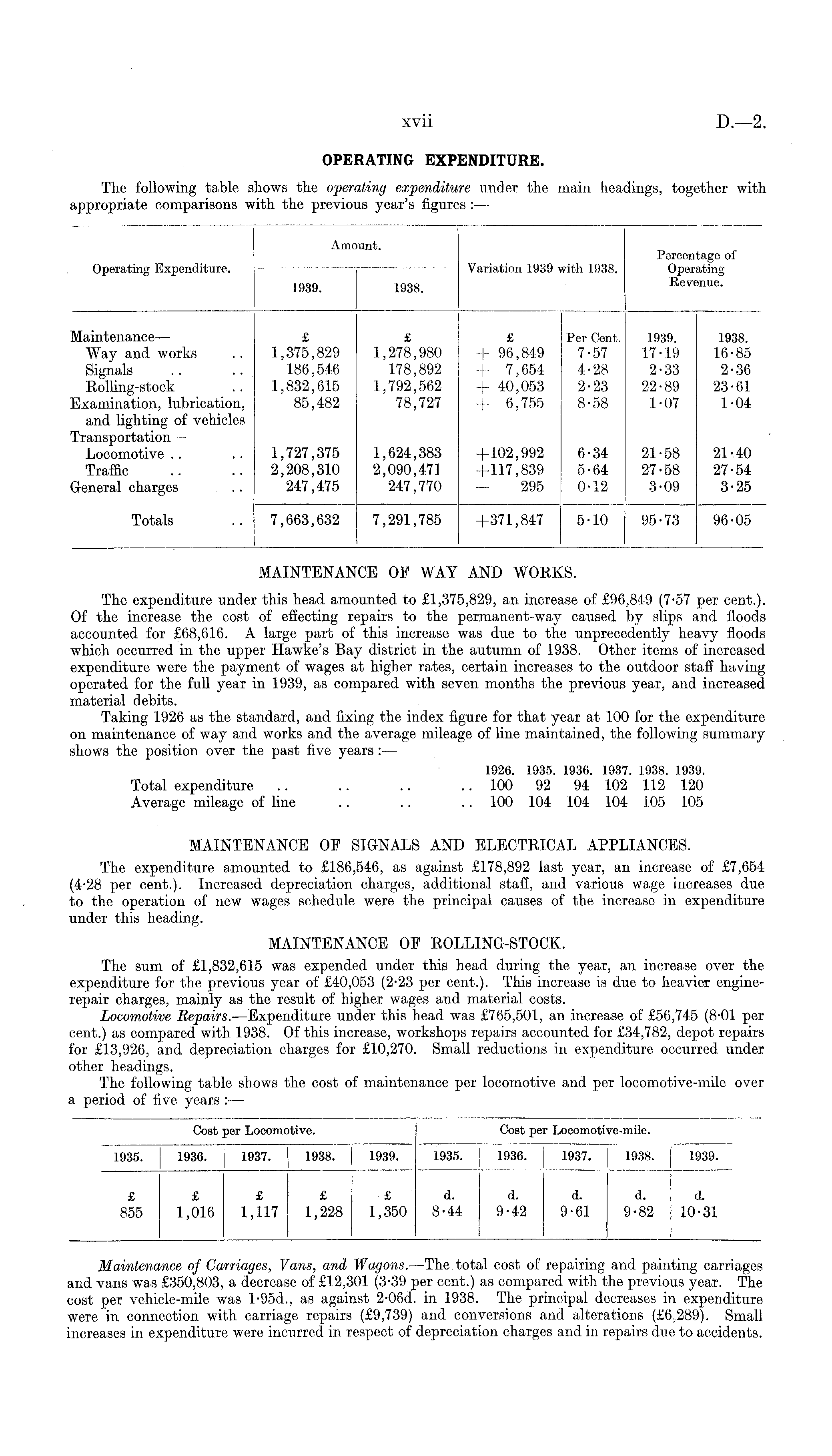 Amount. Percentage of Operating Expenditure. —— Variation 1939 with 1938. Operating 1939. 1938. Revenue. Maintenance— £ £ £ Per Cent. 1939. 1938. Way and works .. 1,375,829 1,278,980 + 96,849 7-57 17-19 16-85 Signals .. .. 186,546 178,892 + 7,654 4-28 2-33 2-36 Rolling-stock .. 1,832,615 1,792,562 + 40,053 2-23 22-89 23-61 Examination, lubrication, 85,482 78,727 + 6,755 8-58 1-07 1-04 and lighting of vehicles Transportation— Locomotive.. .. 1,727,375 1,624,383 +102,992 6-34 21-58 21-40 Traffic .. .. 2,208,310 2,090,471 +117,839 5-64 27-58 27-54 General charges .. 247,475 247,770 - 295 0-12 3-09 3-25 Totals .. 7,663,632 7,291,785 +371,847 5-10 95-73 96-05 !