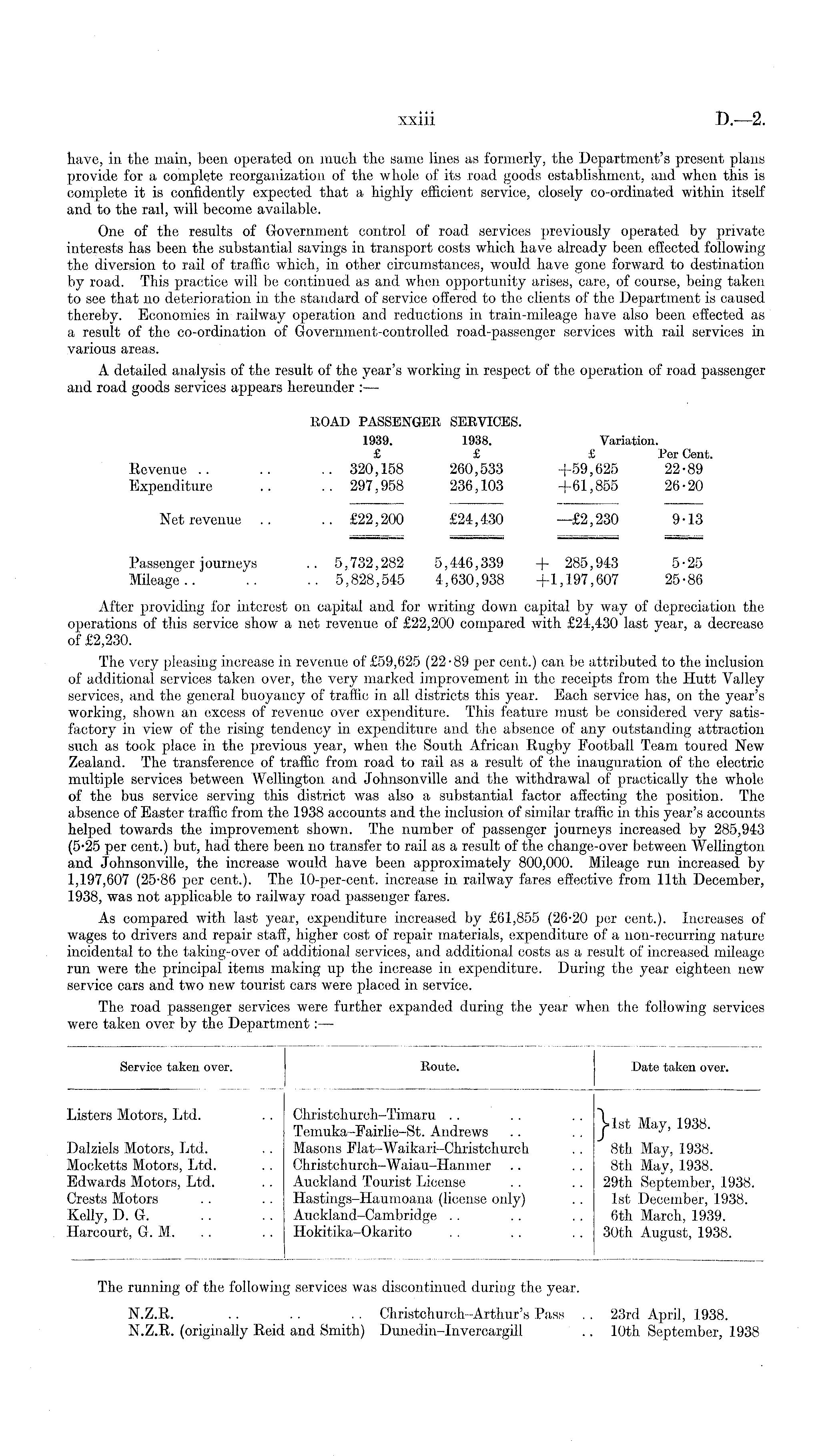 have, in the main, been operated on much the same lines as formerly, the Department's present plans provide for a complete reorganization of the whole of its road goods establishment, and when this is complete it is confidently expected that a highly efficient service, closely co-ordinated within itself and to the rail, will become available. One of the results of Government control of road services previously operated by private interests has been the substantial savings in transport costs which have already been effected following the diversion to rail of traffic which, in other circumstances, would have gone forward to destination by road. This practice will be continued as and when opportunity arises, care, of course, being taken to see that no deterioration in the standard of service offered to the clients of the Department is caused thereby. Economies in railway operation and reductions in train-mileage have also been effected as a result of the co-ordination of Government-controlled road-passenger services with rail services in various areas. A detailed analysis of the result of the year's working in respect of the operation of road passenger and road goods services appears hereunder :— ROAD PASSENGER SERVICES. 1939. 1938. Variation. £ £ £ Per Cent. Revenue .. .. .. 320,158 260,533 +59,625 22-89 Expenditure .. .. 297,958 236,103 +61,855 26-20 Net revenue .. .. £22,200 £24,430 —£2,230 9-13 Passenger journeys .. 5,732,282 5,446,339 + 285,943 5-25 Mileage.. .. .. 5,828,545 4,630,938 +1,197,607 25-86 After providing for interest on capital and for writing down capital by way of depreciation the operations of this service show a net revenue of £22,200 compared with £24,430 last vear, a decrease of £2,230. The very pleasing increase in revenue of £59,625 (22-89 per cent.) can be attributed to the iuclusion of additional services taken over, the very marked improvement in the receipts from the Hutt Valley services, and the general buoyancy of traffic in all districts this year. Each service has, on the year's working, shown an excess of revenue over expenditure. This feature must be considered very satisfactory in view of the rising tendency in expenditure and the absence of any outstanding attraction such as took place in the previous year, when the South African Rugby Football Team toured New Zealand. The transference of traffic from road to rail as a result of the inauguration of the electric multiple services between Wellington and Johnsonville and the withdrawal of practically the whole of the bus service serving this district was also a substantial factor affecting the position. The absence of Easter traffic from the 1938 accounts and the inclusion of similar traffic in this year's accounts helped towards the improvement shown. The number of passenger journeys increased by 285,943 (5-25 per cent.) but, had there been no transfer to rail as a result of the change-over between Wellington and Johnson ville, the increase would have been approximately 800,000. Mileage run increased by 1,197,607 (25-86 per cent.). The 10-per-cent. increase in railway fares effective from 11th December, 1938, was not applicable to railway road passenger fares. As compared with last year, expenditure increased by £61,855 (26-20 per cent.). Increases of wages to drivers and repair staff, higher cost of repair materials, expenditure of a non-recurring nature incidental to the taking-over of additional services, and additional costs as a result of increased mileage run were the principal items making up the increase in expenditure. During the year eighteen new service cars and two new tourist cars were placed in service. The road passenger services were further expanded during the year when the following services were taken over by the Department: —
