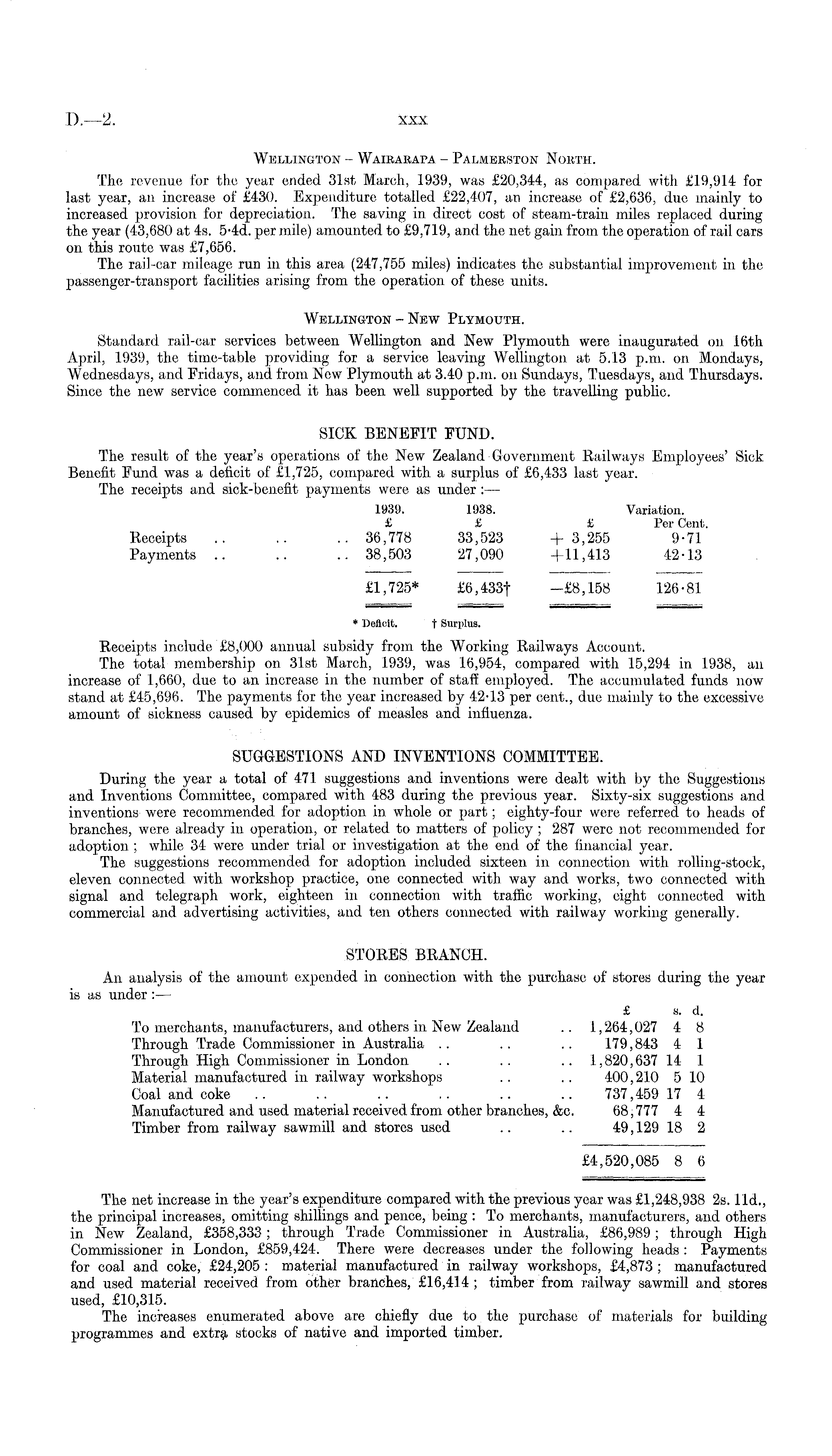 Wellington - Wairarapa - Palmerston North. The revenue for the year ended 31st March, 1939, was £20,344, as compared with £19,914 for last year, an increase of £430. Expenditure totalled £22,407, an increase of £2,636, due mainly to increased provision for depreciation. The saving in direct cost of steam-train miles replaced during the year (43,680 at 4s. 5-4 d. per mile) amounted to £9,719, and the net gain from the operation of rail cars on this route was £7,656. The rail-car mileage run in this area (247,755 miles) indicates the substantial improvement in the passenger-transport facilities arising from the operation of these units. Wellington - New Plymouth. Standard rail-car services between Wellington and New Plymouth were inaugurated on 16th April, 1939, the time-table providing for a service leaving Wellington at 5.13 p.m. on Mondays, Wednesdays, and Fridays, and from New Plymouth at 3.40 p.m. on Sundays, Tuesdays, and Thursdays. Since the new service commenced it has been well supported by the travelling public. SICK BENEFIT FUND. The result of the year's operations of the New Zealand Government Railways Employees' Sick Benefit Fund was a deficit of £1,725, compared with a surplus of £6,433 last year. The receipts and sick-benefit payments were as under : — 1939. 1938. Variation. £ £ £ Per Cent. Receipts .. .. .. 36,778 33,523 + 3,255 9-71 Payments .. .. ..38,503 27,090 +11,413 42-13 £1,725* £6,433f -£8,158 126-81 * Deficit. t Surplus. Receipts include £8,000 annual subsidy from the Working Railways Account. The total membership on 31st March, 1939, was 16,954, compared with 15,294 in 1938, an increase of 1,660, due to an increase in the number of staff employed. The accumulated funds now stand at £45,696. The payments for the year increased by 42-13 per cent., due mainly to the excessive amount of sickness caused by epidemics of measles and influenza. SUGGESTIONS AND INVENTIONS COMMITTEE. During the year a total of 471 suggestions and inventions were dealt with by the Suggestions and Inventions Committee, compared with 483 during the previous year. Sixty-six suggestions and inventions were recommended for adoption in whole or part; eighty-four were referred to heads of branches, were already in operation, or related to matters of policy ; 287 were not recommended for adoption; while 34- were under trial or investigation at the end of the financial year. The suggestions recommended for adoption included sixteen in connection with rolling-stock, eleven connected with workshop practice, one connected with way and works, two connected with signal and telegraph work, eighteen in connection with traffic working, eight connected with commercial and advertising activities, and ten others connected with railway working generally. STORES BRANCH. An analysis of the amount expended in connection with the purchase of stores during the year is as under :— £ s. d. To merchants, manufacturers, and others in New Zealand .. 1,264,027 4 8 Through Trade Commissioner in Australia .. .. .. 179,843 4 1 Through High Commissioner in London .. .. .. 1,820,637 14 1 Material manufactured in railway workshops .. .. 400,210 5 10 Coal and coke .. .. .. .. .. .. 737,459 17 4 Manufactured and used material received from other branches, &c. 68,777 4 4 Timber from railway sawmill and stores used .. .. 49,129 18 2 £4,520,085 8 6 The net increase in the year's expenditure compared with the previous year was £1,248,938 2s. lid., the principal increases, omitting shillings and pence, being : To merchants, manufacturers, and others in New Zealand, £358,333; through Trade Commissioner in Australia, £86,989; through High Commissioner in London, £859,424. There were decreases under the following heads : Payments for coal and coke, £24,205 : material manufactured in railway workshops, £4,873 ; manufactured and used material received from other branches, £16,414 ; timber from railway sawmill and stores used, £10,315. The increases enumerated above are chiefly due to the purchase of materials for building programmes and extry, stocks of native and imported timber.