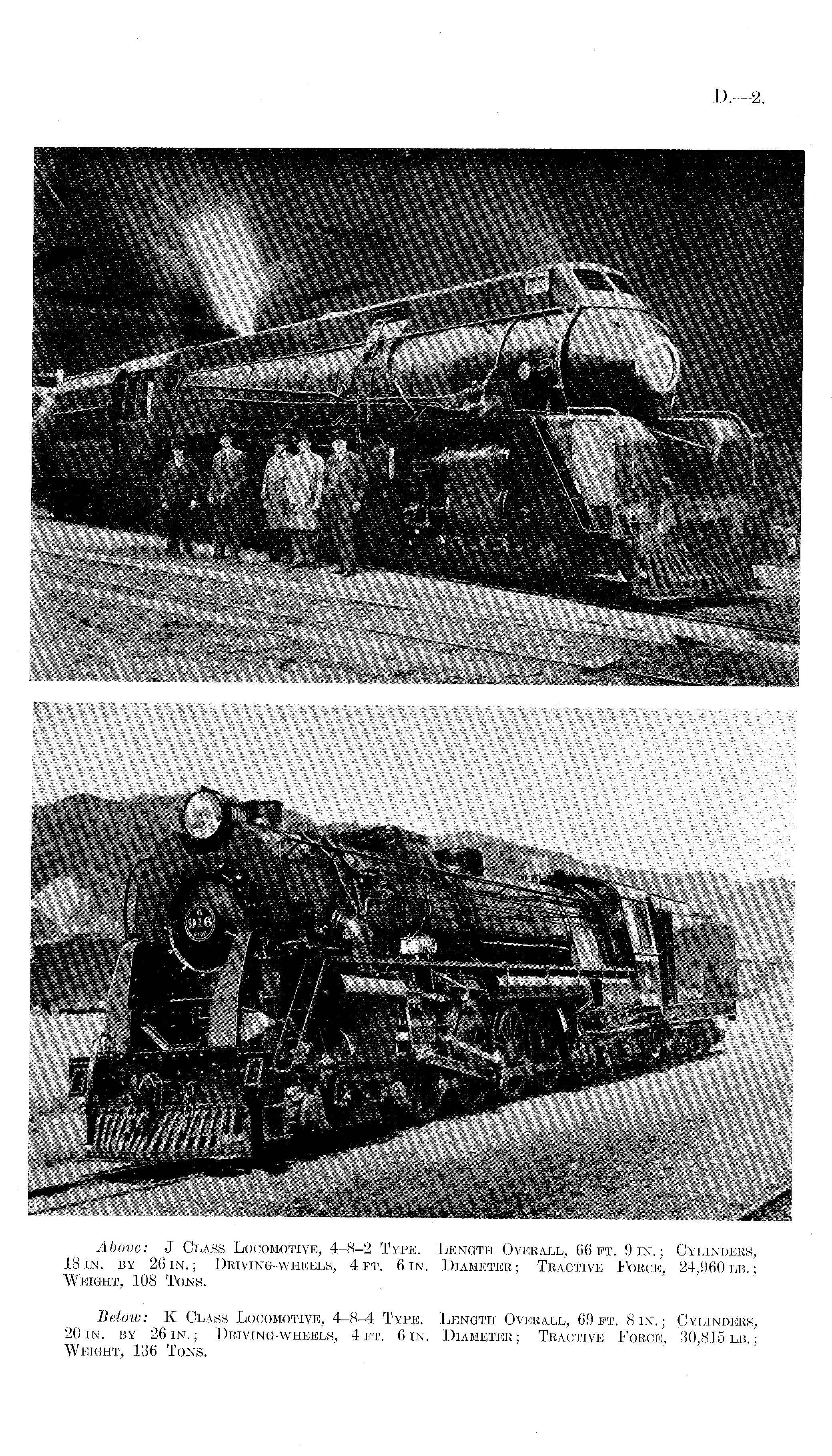 Below: K Class Locomotive, 4-8-4 Type. Length Overall, 69ft. 8in.; Cylinders, 20in. by 26in.; Driving-wheels, 4ft. 6in. Diameter; Tractive Force, 30,815lb.; Weight, 136 Tons.