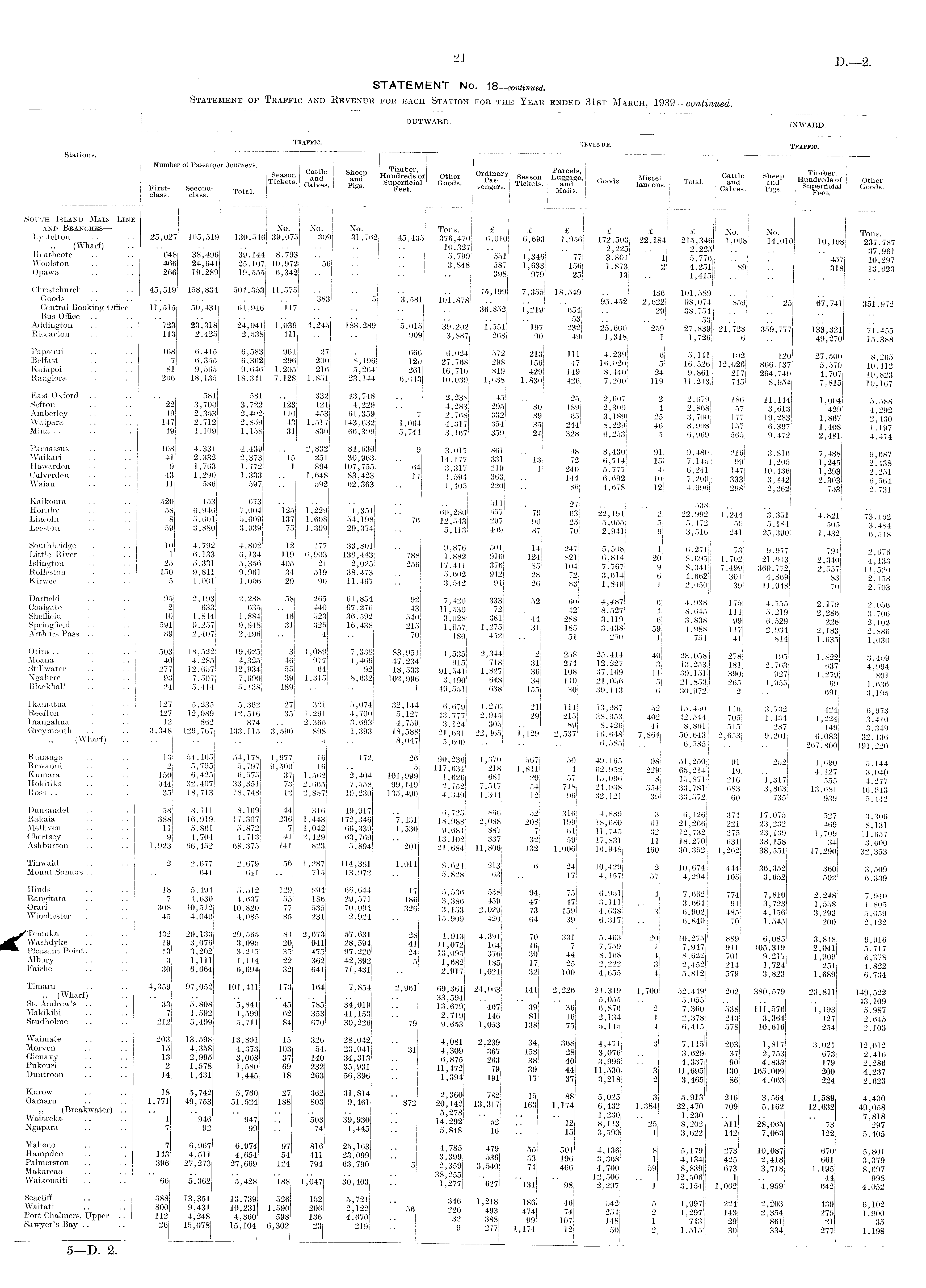 STATEMENT No. 18—continued. Statement of Traffic and Revenue for each Station for the Year ended 31st March, 1939—continued.