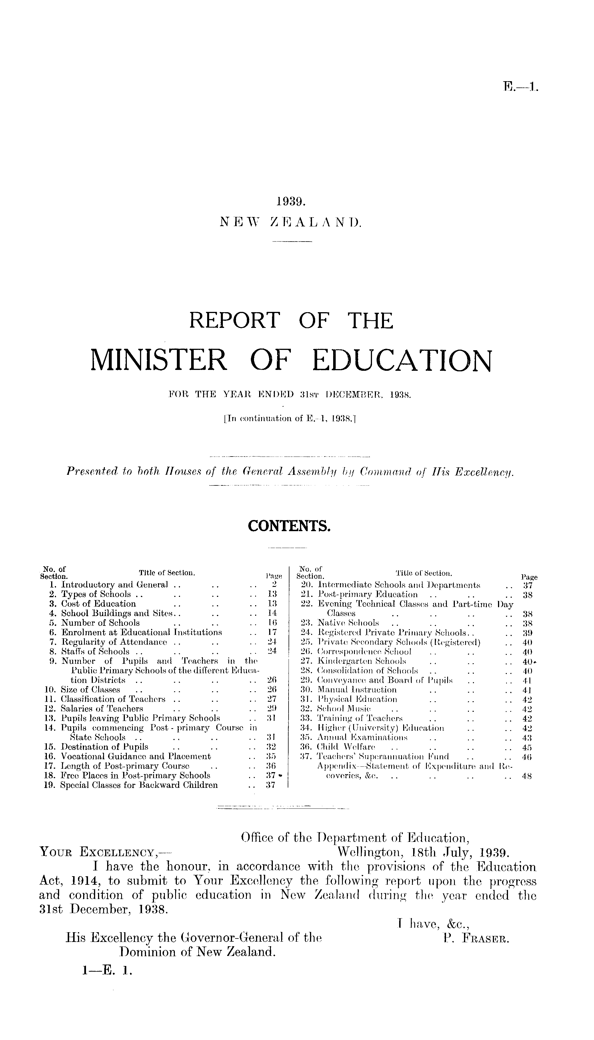 Office of the Department of Education, Your Excellency,— Wellington, 18th July, 1939. I have the honour, in accordance with the provisions of the Education Act, 1914, to submit to Your Excellency the following report upon the progress and condition of public education in New Zealand during the year ended the 31st December, 1938. I have, &c, His Excellency the Governor-General of the P. Eraser. Dominion of New Zealand.