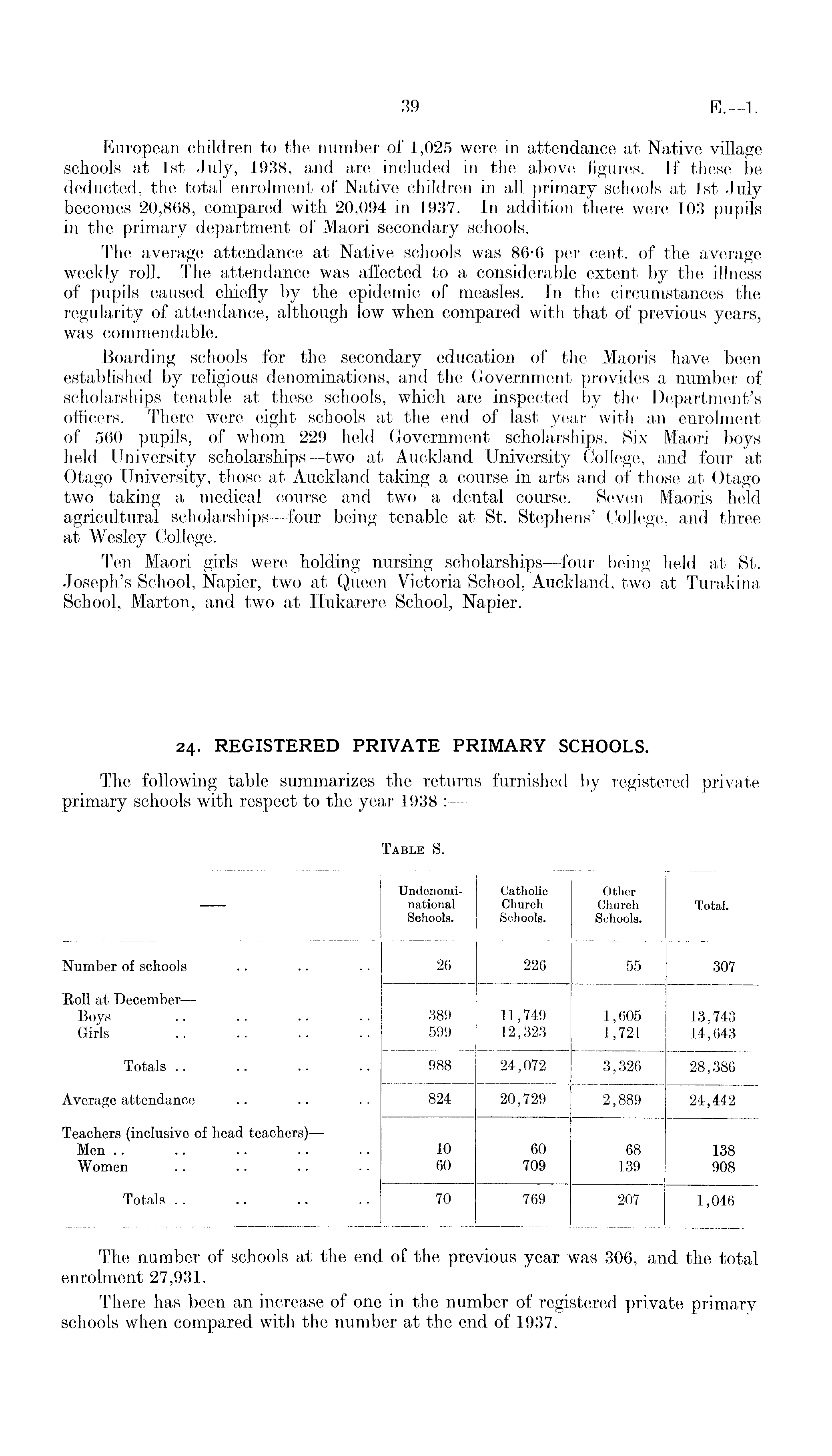 European children to the number of 1,025 were in attendance at Native village schools at Ist July, 1938, and are included in the above figures. If these be deducted, the total enrolment of Native children in all primary schools at Ist July becomes 20,868, compared with 20,094 in 1937. In addition there were 103 pupils in the primary department of Maori secondary schools. The average attendance at Native schools was 86-6 per cent, of the average weekly roll. The attendance was affected to a considerable extent by the illness of pupils caused chiefly by the epidemic of measles. In the circumstances the regularity of attendance, although low when compared with that of previous years, was commendable. Boarding schools for the secondary education of the Maoris have been established by religious denominations, and the Government provides a number of scholarships tenable at these schools, which are inspected by the Department's officers. There were eight schools at the end of last year with an enrolment of 560 pupils, of whom 229 held Government scholarships. Six Maori boys held University scholarships —two at Auckland University College, and four at Otago University, those at Auckland taking a course in arts and of those at Otago two taking a medical course and two a dental course. Seven Maoris held agricultural scholarships —four being tenable at St. Stephens' College, and three at Wesley College. Ten Maori girls were holding nursing scholarships—four being held at St. Joseph's School, Napier, two at Queen Victoria School, Aiickland, two at Turakina School, Marton, and two at Hukarere School, Napier. 24. REGISTERED PRIVATE PRIMARY SCHOOLS. The following table summarizes the returns furnished by registered private primary schools with respect to the year 1938 : —