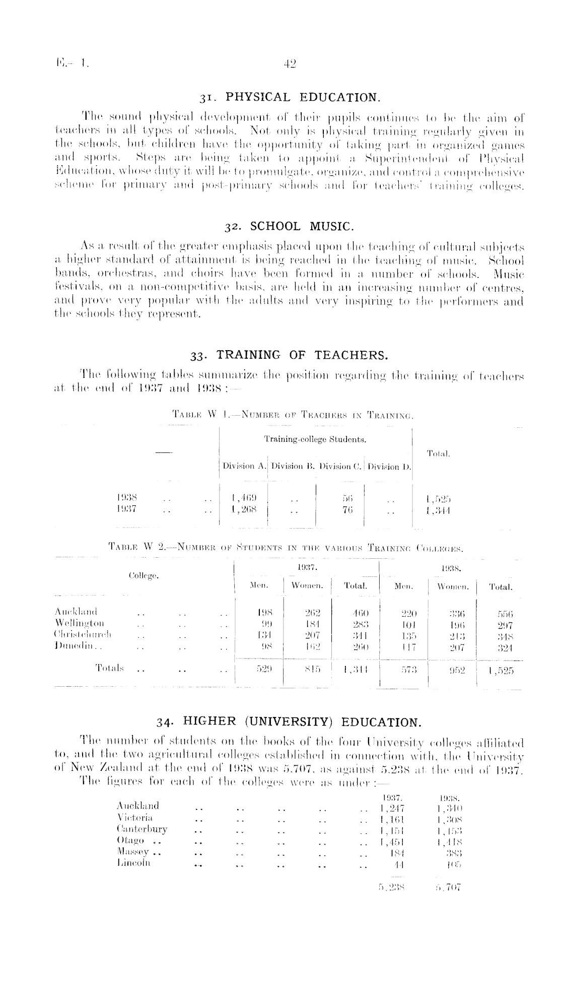31. PHYSICAL EDUCATION. The sound physical development of their pupils continues to be the aim of teachers in all types of schools. Not only is physical training regularly given in the schools, but children have the opportunity of taking part in organized games and sports. Steps are being taken to appoint a Superintendent of Physical Education, whose duty it will be to promulgate, organize, and control a comprehensive scheme for primary and post-primary schools and for teachers' training colleges. 32. SCHOOL MUSIC. As a result of the greater emphasis placed upon the teaching of cultural subjects a higher standard of attainment is being reached in. the teaching of music. School bands, orchestras, and choirs have been formed in a number of schools. Music festivals, on a non-competitive basis, are held in an increasing number of centres, and prove very popular with the adults and very inspiring to the performers and the schools they represent. 33. TRAINING OF TEACHERS. The following tables summarize the position regarding the training of teachers at the end of 1937 and 1938 :—