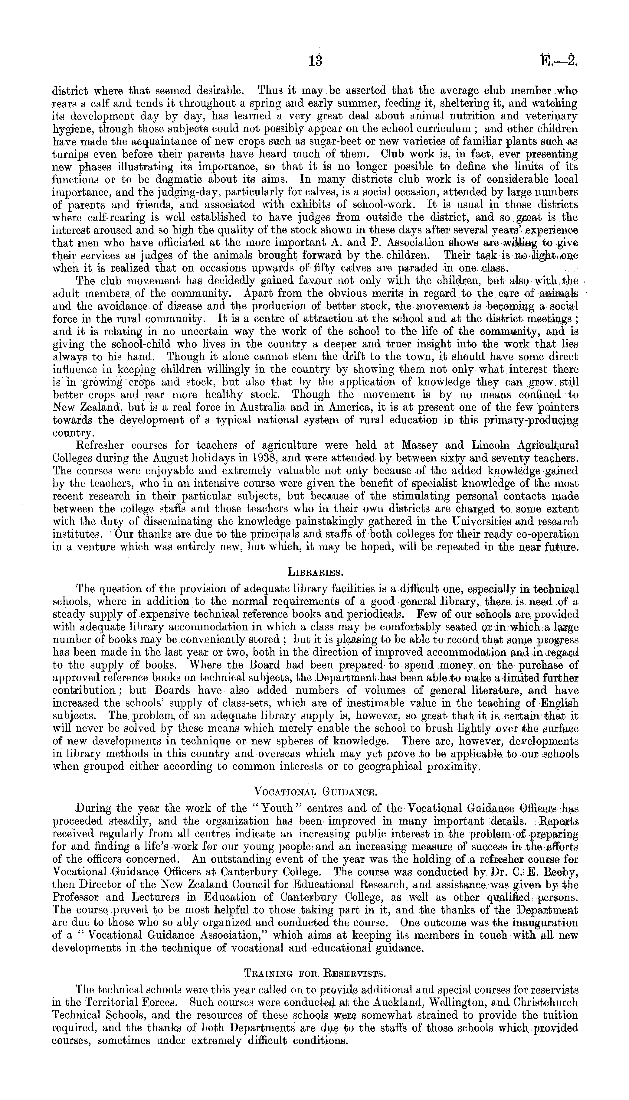 district where that seemed desirable. Thus it may be asserted that the average club member who rears a calf and tends it throughout a spring and early summer, feeding it, sheltering it, and watching its development day by day, has learned a very great deal about animal nutrition and veterinary hygiene, though those subjects could not possibly appear on the school curriculum ; and other children have made the acquaintance of new crops such as sugar-beet or new varieties of familiar plants such as turnips even before their parents have heard much of them. Club work is, in fact, ever presenting new phases illustrating its importance, so that it is 110 longer possible to define the limits of its functions or to be dogmatic about its aims. In many districts club work is of considerable local importance, and the judging-day, particularly for calves, is a social occasion, attended by large numbers of parents and friends, and associated with exhibits of school-work. It is usual in those districts where calf-rearing is well established to have judges from outside the district, and so great is the interest aroused and so high the quality of the stock shown in these days after several years' experience that men who have officiated at the more important A. and P. Association shows are willing to give their services as judges of the animals brought forward by the children. Their task is 110 light one when it is realized that 011 occasions upwards of fifty calves are paraded in one class. The club movement has decidedly gained favour not only with the children, but also with the adult members of the community. Apart from the obvious merits in regard to the care of animals and the avoidance of disease and the production of better stock, the movement is becoming a social force in the rural community. It is a centre of attraction at the school and at the district meetings ; and it is relating in 110 uncertain way the work of the school to the life of the community, and is giving the school-child who lives in the country a deeper and truer insight into the work that lies always to his hand. Though it alone cannot stem the drift to the town, it should have some direct influence in keeping children willingly in the country by showing them not only what interest there is in growing crops and stock, but also that by the application of knowledge they can grow still better crops and rear more healthy stock. Though the movement is by no means confined to New Zealand, but is a real force in Australia and in America, it is at present one of the few pointers towards the development of a typical national system of rural education in this primary-producing country. Refresher courses for teachers of agriculture were held at Massey and Lincoln Agricultural Colleges during the August holidays in 1938, and were attended by between sixty and seventy teachers. The courses were enjoyable and extremely valuable not only because of the added knowledge gained by the teachers, who in an intensive course were given the benefit of specialist knowledge of the most recent research in their particular subjects, but because of the stimulating personal contacts made between the college staffs anil those teachers who in their own districts are charged to some extent with the duty of disseminating the knowledge painstakingly gathered in the Universities and research institutes. Our thanks are due to the principals and staffs of both colleges for their ready co-operation in a venture which was entirely new, but which, it may be hoped, will be repeated in the near future. Libraries. The question of the provision of adequate library facilities is a difficult one, especially in technical schools, where in addition to the normal requirements of a good general library, there is need of a steady supply of expensive technical reference books and periodicals. Few of our schools are provided with adequate library accommodation in which a class may be comfortably seated or in which a large number of books may be conveniently stored ; but it is pleasing to be able to record that some progress has been made in the last year or two, both in the direction of improved accommodation and in regard to the supply of books. Where the Board had been prepared to spend money on the purchase of approved reference books on technical subjects, the Department has been able to make a limited further contribution ; but Boards have also added numbers of volumes of general literature, and have increased the schools' supply of class-sets, which are of inestimable value in the teaching of English subjects. The problem, of an adequate library supply is, however, so great that it is certain that it will never be solved by these means which merely enable the school to brush lightly over <the surface of new developments in technique or new spheres of knowledge. There are, however, developments in library methods in this country and overseas which may yet prove to be applicable to our schools when grouped either according to common interests or to geographical proximity. Vocational Guidance. During the year the work of the "Youth" centres and of the Vocational Guidance Officers has proceeded steadily, and the organization has been improved in many important details. Reports received regularly from all centres indicate an increasing public interest in the problem of preparing for and finding a life's work for our young people and an increasing measure of success in the efforts of the officers concerned. An outstanding event of the year was the holding of a refresher course for Vocational Guidance Officers at Canterbury College. The course was conducted by Dr. C. E. B.eeby, then Director of the New Zealand Council for Educational Research, and assistance was given by the Professor and Lecturers in Education of Canterbury College, as well as other qualified persons. The course proved to be most helpful to those taking part in it, and the thanks of the Department are due to thos