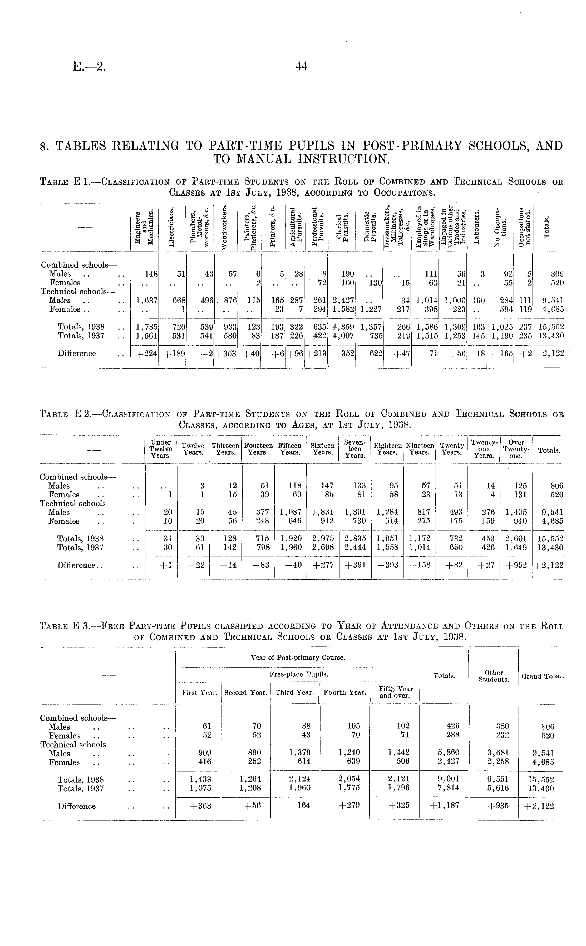 IE 8 g 2,5 1 ■§ i» i« •-;« ! "• IeI C a. i-g hi | |3e 1 sg E |l if ll is 111- 1«! IsII § Is 3| 3 '!*■§ ~ ill i -ii i ig ii ii i§ fir tii i§ii I °i l JT ' O £ Ph 01 r fxCu SPh U Ph Qrs © o O j H 3 0 fc g o ; £ ** iT h I m £"5 | jjsEt w«h5| 3 g =g Combined schools— Males .. .. 148 5J 43 57 6 5 28 8 190 .. .. Ill 59 3 92 5 806 Females 2 .... 72 160 130 15 63 21 .. 55 2 520 Technical schools— Males .. .. 1,637 668 496. 876 116 165 287 261 2,427 .. 34 1,014 1,006 160 284 ill 9,541 Females.. .. .. 1 23 7 294- 1,582 1,227 217 398 223 .. 594 119 4,685 Totals, 1938 .. 1,785 720 539 933 123 193 322 635 4,359 1,357 266 1,586 1,309 163 1,025 237 16,562 Totals, 1937 .. 1,561 531 541 580 83 187 226 422 4,007 735 219 1,515 1,253 145 1,190 235 13,430 Difference .. +224 +189 -2+353 +40 +6 +96+213 +352 +622 +47 +71 +56+18 -165 +2+2,122