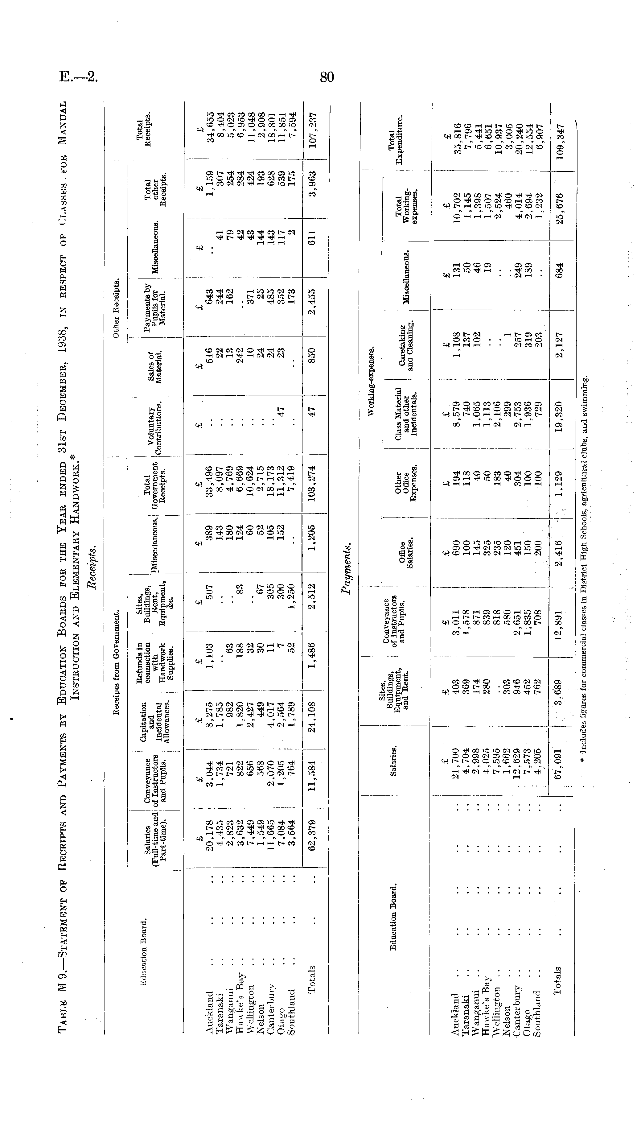 Table M 9.—Statement of Receipts and Payments by Education Boards for the Year ended 31st December, 1938, in respect of Classes for Manual Instruction and Elementary Handwork.* Receipts.