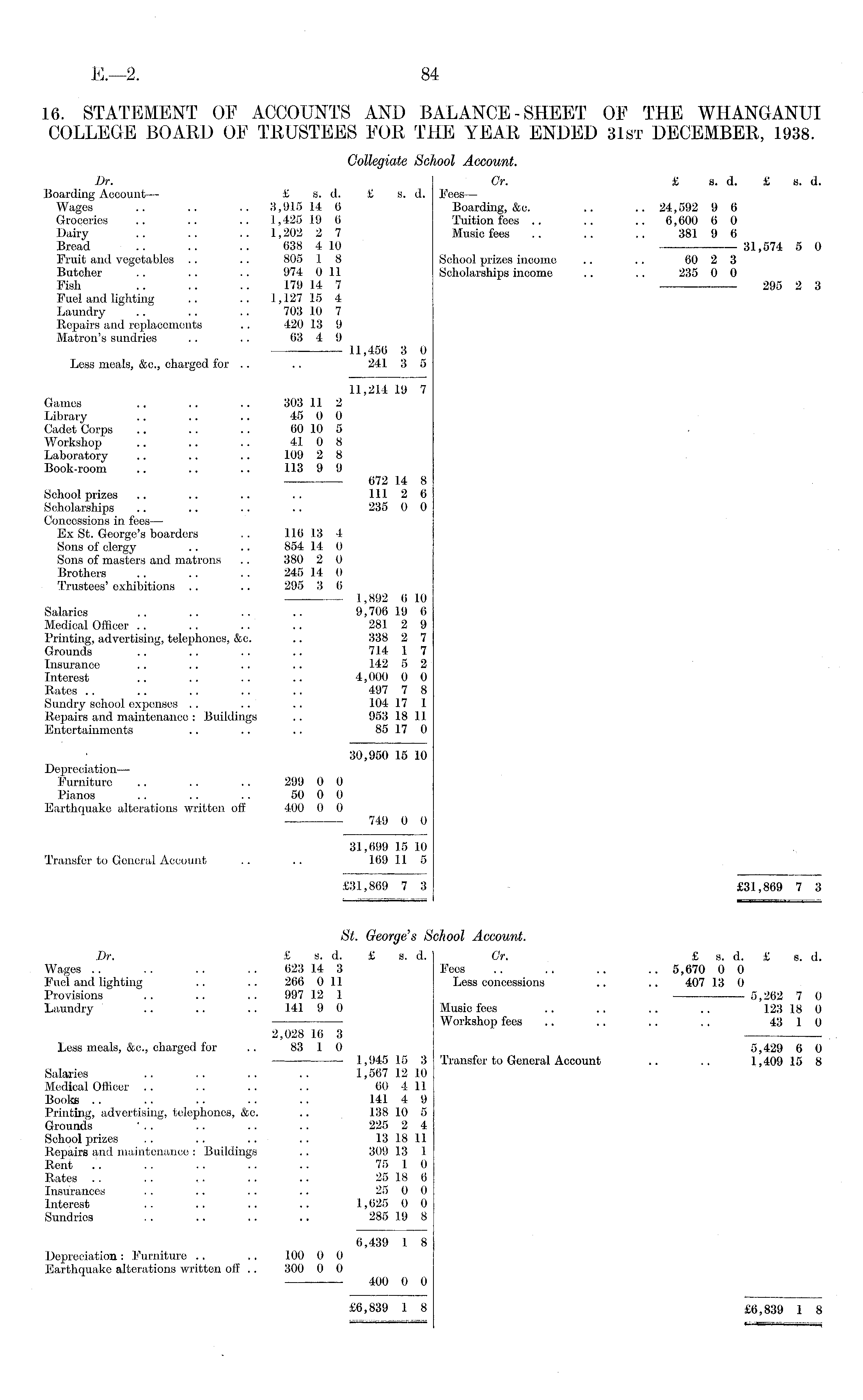16. STATEMENT OF ACCOUNTS AND BALANCE-SHEET OF THE WHANGANUI COLLEGE BOARD OF TRUSTEES FOR THE YEAR ENDED 31st DECEMBER, 1938. Collegiate School Account. Dr. Cr. £ a. d. £ a. d. Boarding Account— £ s. d. £ a. d. Fees — Wages .. .. .. 3,915 14 0 Boarding, &c. .. .. 24,592 9 6 Groceries .. .. .. 1,425 19 6 Tuition fees .. .. .. 6,600 6 0 Dairy .. .. .. 1,202 2 7 Music fees .. .. .. 381 9 6 Bread .. .. .. 038 4 10 31,574 5 0 Fruit and vegetables .. .. 805 1 8 School prizes income .. .. 60 2 3 Butcher .. .. .. 974 0 11 Scholarships income .. .. 235 0 0 Fish .. .. .. 179 14 7 295 2 3 Fuel and lighting .. .. 1,127 15 4 Laundry .. .. .. 703 10 7 Repairs and replacements .. 420 13 9 Matron's sundries .. .. 03 4 9 11,456 3 0 Less meals, &e., charged for .. .. 241 3 5 11,214 19 7 Games .. .. .. 303 11 2 Library .. .. .. 45 0 0 Cadet Corps ...... 60 10 5 Workshop .. .. .. 41 0 8 Laboratory .. .. .. 109 2 8 Book-room .. .. .. 113 9 9 672 14 8 School prizes .. .. .. .. 11126 Scholarships .. .. .. .. 235 0 0 Concessions in fees— Ex St. George's boarders .. 116 13 4 Sons of clergy .. .. 854 14 0 Sons of masters and matrons .. 380 2 0 Brothers .. .. .. 245 14 0 Trustees' exhibitions .. .. 295 3 6 1,892 6 10 Salaries .. .. .. .. 9,706 19 6 Medical Officer .. .. .. .. 281 2 9 Printing, advertising, telephones, &c. .. 338 2 7 Grounds .. .. .. .. 714 1 7 Insurance .. .. . . .. 142 5 2 Interest .. .. .. .. 4,000 0 0 Rates .. .. .. .. .. 497 7 8 Sundry school expenses .. .. .. 104 17 1 Repairs and maintenance: Buildings .. 953 18 11 Entertainments .. .. .. 85 17 0 30,950 15 10 Depreciation— Furniture .. .. .. 299 0 0 Pianos .. .. .. 50 0 0 Earthquake alterations written off 400 0 0 749 0 0 31,699 15 10 Transfer to General Account .. .. 169 11 5 £31,869 7 3 £31,869 7 3 St. George's School Account. Dr. £ s. d. £ a. d. Gr. £ s. d. £ s. d. Wages .. .. . . . . 623 14 3 Fees .. .. .. 5,670 0 0 Fuel and lighting .. .. 266 0 11 Less concessions .. .. 407 13 0 Provisions .. .. .. 997 12 1 5,262 7 0 Laundry .. .. .. 141 9 0 Music fees .. .. .. .. 123 18 0 Workshop fees .. .. .. .. 43 1 0 2,028 16 3 Less meals, &c., charged for .. 83 1 0 5,429 6 0 1,945 15 3 Transfer to General Account .. .. 1,409 15 8 Salaries .. .. .. .. 1,567 12 10 Medical Officer .. .. .. .. 60 411 Books .. .. •. .. .. 141 4 9 Printing, advertising, telephones, &c. .. 138 10 5 Grounds '.. .. .. .. 225 2 4 School prizes .. .. .. .. 13 18 11 Repairs and maintenance : Buildings .. 309 13 1 Rent .. .. ■ • .. ■. 75 1 0 Rates .. . . . . .. .. 25 18 6 Insurances . . .. .. .. 25 0 0 Interest .. .. .. .. 1,625 0 0 Sundries . . .. .. .. 285 19 8 6,439 1 8 Depreciation : Furniture .. .. 100 0 0 Earthquake alterations written off .. 300 0 0 400 0 0 £6,839 1 8 £6,839 1 8