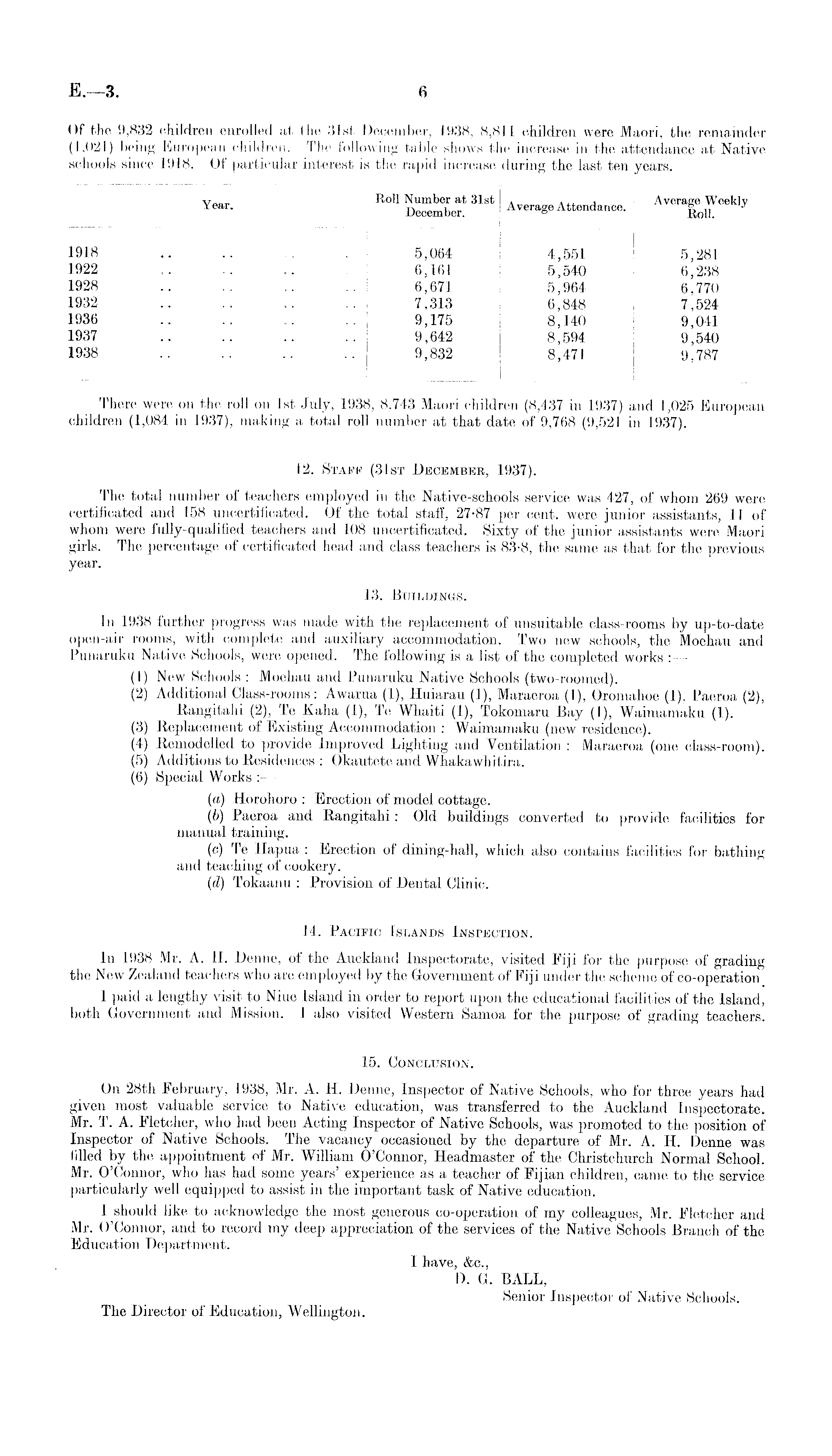 There were on the roll on Ist July, 1938, 8,743 Maori children (8,437 in 1937) and 1,025 European children (1,084 in 1937), making a total roll number at that date of 9,768 (9,521 in 1937). 12. Staff (31st December, 1937). The total number of teachers employed in the Native-schools service was 427, of whom 269 were certificated and 158 uncertificated. Of the total staff, 27-87 per cent, were junior assistants, 11 of whom were fully-qualified teachers and 108 uncertificated. Sixty of the junior assistants were Maori girls. The percentage of certificated head and class teachers is 83-8, the same as that for the previous year. 13. Buildings. In 1938 further progress was made with the replacement of unsuitable class-rooms by up-to-date open-air rooms, with complete and auxiliary accommodation. Two new schools, the Moehau and Punaruku Native Schools, were opened. The following is a list of the completed works :— (1) New Schools : Moehau and Punaruku Native Schools (two-roomed). (2) Additional Class-rooms: Awarua (1), Huiarau (1), Maraeroa (1), Oromahoe (1), Paeroa (2), Rangitahi (2), Te Kaha (1), Te Whaiti (1), Tokomaru Bay (1), Waimamaku (1). (3) Replacement of Existing Accommodation : Waimamaku (new residence). (4) Remodelled to provide Improved Lighting and Ventilation : Maraeroa (one class-room). (5) Additions to Residences : Okautete and Whakawhitira. (6) Special Works : — (a) Horohoro : Erection of model cottage. (b) Paeroa and Rangitahi: Old buildings converted to provide facilities for manual training. (c) Te Hapua : Erection of dining-hall, which also contains facilities for bathing and teaching of cookery. (d) Tokaanu : Provision of Dental Clinic. 14. Pacific Islands Inspection. In 1938 Mr. A. H. Denne, of the Auckland Inspectorate, visited Fiji for the purpose of grading the New Zealand teachers who are employed by the Government of Fiji under the scheme of co-operation I paid a lengthy visit to Niue Island in order to report upon the educational facilities of the Island, both Government and Mission. I also visited Western Samoa for the purpose of grading teachers. 15. Conclusion. On 28th February, 1938, Mr. A. H. Denne, Inspector of Native Schools, who for three years had given most valuable service to Native education, was transferred to the Auckland Inspectorate. Mr. T. A. Fletcher, who had been Acting Inspector of Native Schools, was promoted to the position of Inspector of Native Schools. The vacancy occasioned by the departure of Mr. A. H. Denne was filled by the appointment of Mr. William O'Connor, Headmaster of the Christchurch Normal School. Mr. O'Connor, who has had some years' experience as a teacher of Fijian children, came to the service particularly well equipped to assist in the important task of Native education. I should like to acknowledge the most generous co-operation of my colleagues, Mr. Fletcher and Mr. O'Connor, and to record my deep appreciation of the services of the Native Schools Branch of the Education Department. I have, &c., D. G. BALL, Senior Inspector of Native Schools. The Director of Education, Wellington.