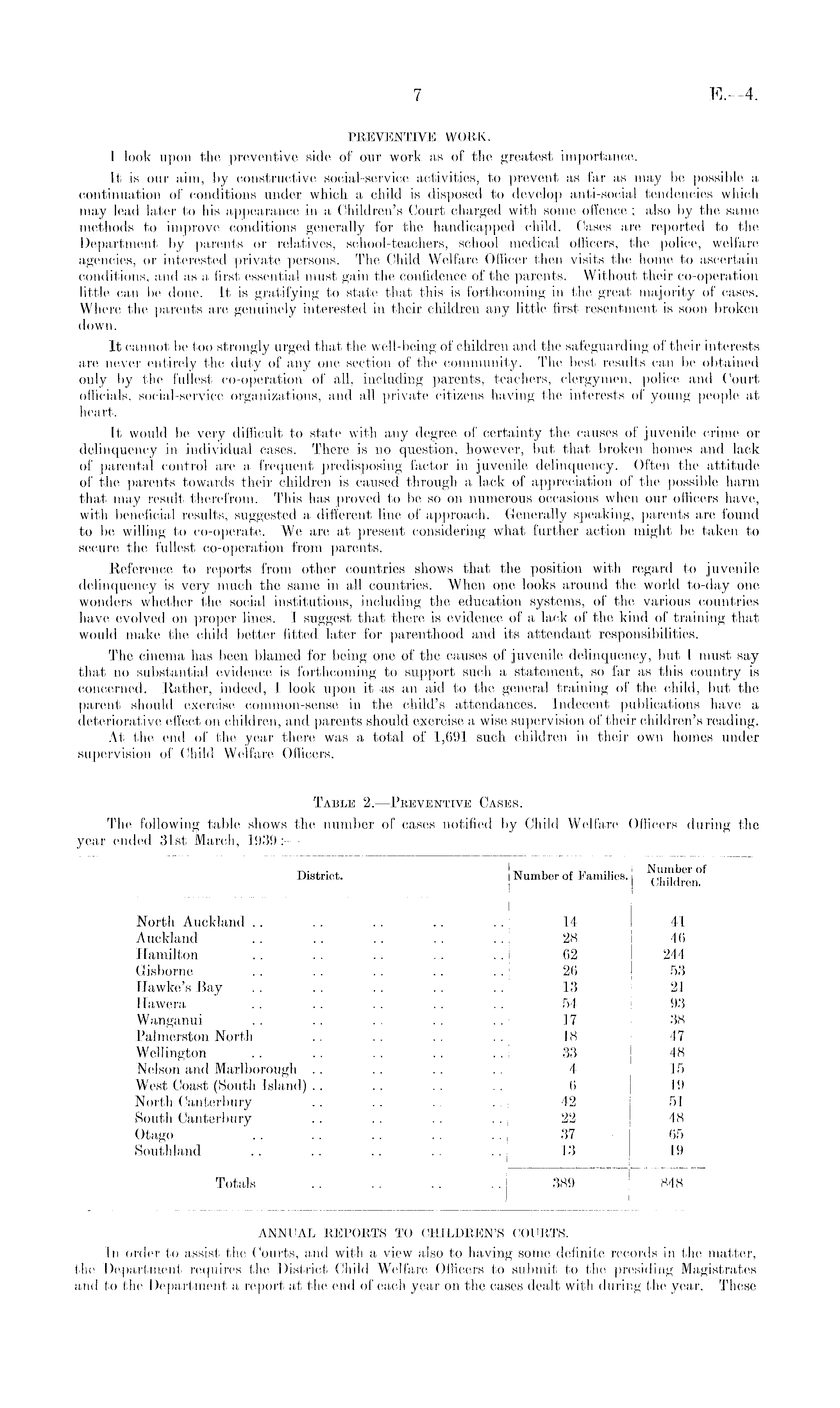 PREVENTIVE WORK. I look upon the preventive side of our work as of the greatest importance. It is our aim, by constructive social-service activities, to prevent as far as may be possible a continuation of conditions under which a child is disposed to develop anti-social tendencies which may lead later to his appearance in a Children's Court charged with some offence ; also by the same methods to improve conditions generally for the handicapped child. Cases are reported to the Department by parents or relatives, school-teachers, school medical officers, the police, welfare agencies, or interested private persons. The Child Welfare Officer then visits the home to ascertain conditions, and as a first essential must gain the confidence of the parents. Without their co-operation little can be done. It is gratifying to state that this is forthcoming in the great majority of cases. Where the parents are genuinely interested in their children any little first resentment is soon broken down. It cannot be too strongly urged that the well-being of children and the safeguarding of their interests are never entirely the duty of any one section of the community. The best results can be obtained only by the fullest co-operation of all, including parents, teachers, clergymen, police and Court officials, social-service organizations, and all private citizens having the interests of young people at heart. It would be very difficult to state with any degree of certainty the causes of juvenile crime or delinquency in individual cases. There is no question, however, but that broken homes and lack of parental control are a frequent predisposing factor in juvenile delinquency. Often the attitude of the parents towards their children is caused through a lack of appreciation of the possible harm that may result therefrom. This has proved to be so on numerous occasions when our officers have, with beneficial results, suggested a different line of approach. Generally speaking, parents are found to be willing to co-operate. We are at present considering what further action might be taken to secure the fullest co-operation from parents. Reference to reports from other countries shows that the position with regard to juvenile delinquency is very much the same in all countries. When one looks around the world to-day one wonders whether the social institutions, including the education systems, of the various countries have evolved on proper lines. I suggest that there is evidence of a lack of the kind of training that would make the child better fitted later for parenthood and its attendant responsibilities. The cinema has been blamed for being one of the causes of juvenile delinquency, but I must say that no substantial evidence is forthcoming to support such a statement, so far as this country is concerned. Bather, indeed, I look upon it -as an aid to the general training of the child, but the parent should exercise common-sense in the child's attendances. Indecent publications have a deteriorative effect on children, and parents should exercise a wise supervision of their children's reading. At the end of the year there was a total of 1,691 such children in their own homes under supervision of Child Welfare Officers. Table 2. —Preventive Cases. The following table shows the number of cases notified by Child Welfare Officers during the year ended 31st March, 1939 : —
