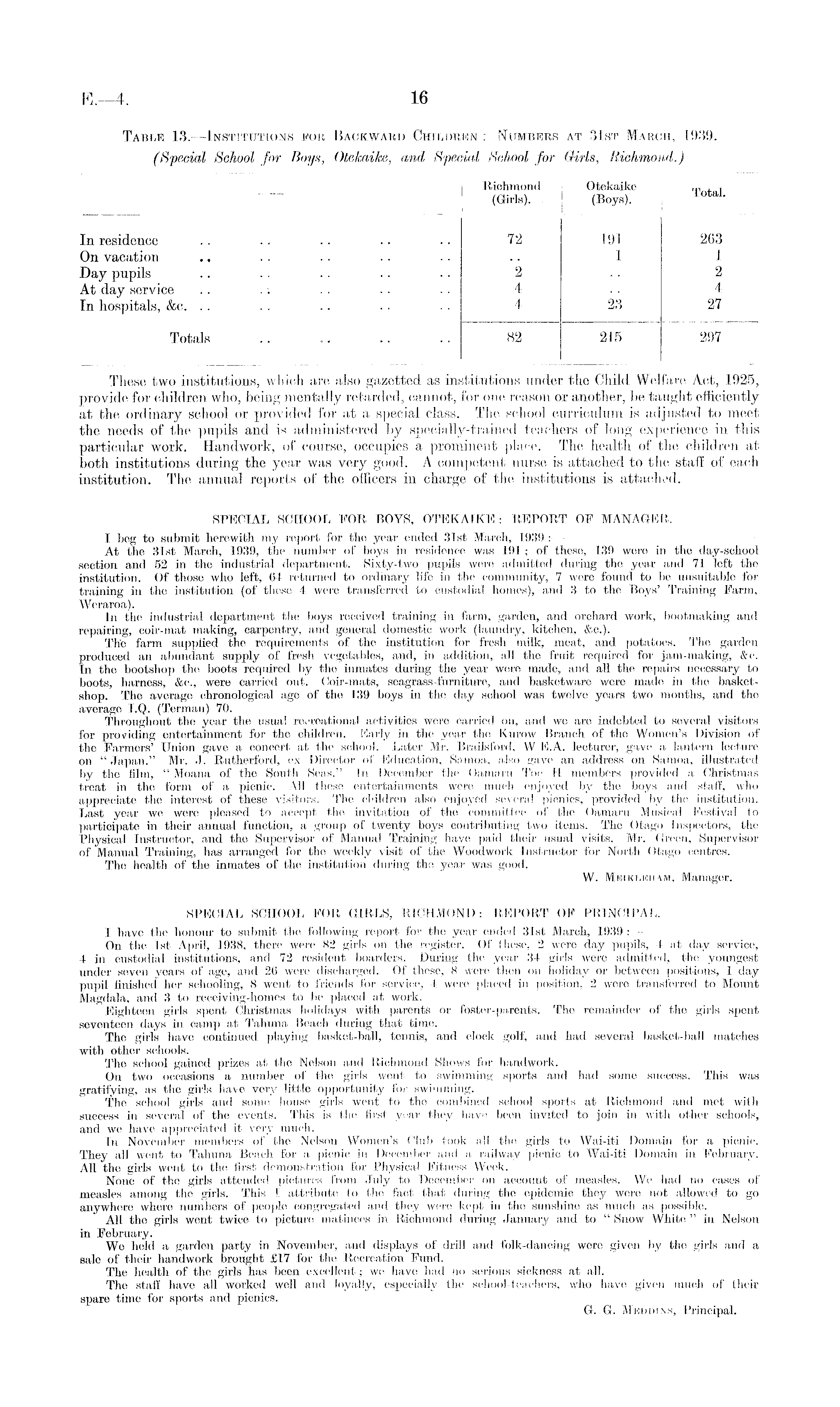 Tliese two institutions, which, are also gazetted as institutions under the Child Welfare Act, 1925, provide for children who, being mentally retarded, cannot, for one reason or another, be taught efficiently at the ordinary school or provided for at a special class. The school curriculum is adjusted to meet the needs of the pupils and is administered by specially-trained teachers of long experience in this particular work. Handwork, of course, occupies a prominent place. The health of the children at both institutions during the year was very good. A competent nurse is attached to the staff of each institution. The annual reports of the officers in charge of the institutions is attached. SPECIAL SCHOOL FOR BOYS, OTEKAIKE: REPORT OE MANAGER. I beg to submit herewith my report for the year ended 31st March, 1939 : — At the 31st March, 1939, the number of boys in residence was 191 ; of these, 139 were in the day-school section and 52 in the industrial department. Sixty-two pupils were admitted during the year and 71 left the institution. Of those who left, 64 returned to ordinary life in the community, 7 were found to be unsuitable for training in the institution (of these 4 were transferred to custodial homes), and 3 to the Boys' Training Farm, Weraroa). In the industrial department the boys received training in farm, garden, and orchard work, bootmaking and repairing, coir-mat making, carpentry, and general domestic work (laundry, kitchen, &c.). The farm supplied the requirements of the institution for fresh milk, meat, and potatoes. The garden produced an abundant supply of fresh vegetables, and, in addition, all the fruit required for jam-making, &c. In the bootshop the boots required by the inmates during the year were made, and all the repairs necessary to boots, harness, &c., were carried out. Coir-mats, seagrass-furniture, and basketware were made in the basketshop. The average chronological age of the 139 boys in the day school was twelve years two months, and the average I.Q. (Terman) 70. Throughout the year the usual recreational activities were carried on, and we are indebted to several visitors for providing entertainment for the children. Early in the year the Kurow Branch of the Women's Division of the Farmers' Union gave a concert at the school. Later Mr. Brailsford, W.E.A. lecturer, gave a lantern lecture on " Japan." Mr. J. Rutherford, ex Director of Education, Samoa, also gave an address on Samoa, illustrated by the film, " Moana of the South Seas." In December the Oamaru Toe H members provided a Christmas treat in the form of a picnic. All these entertainments were much enjoyed by the boys and staff, who appreciate the interest of these visitors. The children also enjoyed several picnics, provided by the institution. Last year we were pleased to accept the invitation of the committee of the Oamaru Musical Festival to participate in their annual function, a group of twenty boys contributing two items. The Otago Inspectors, the Physical Instructor, and the Supervisor of Manual Training have paid their usual visits. Mr. Green, Supervisor of Manual Training, has arranged for the weekly visit of the Woodwork Instructor for North Otago centres. The health of the inmates of the institution during the year was good. W. Meikleham, Manager. SPECIAL SCHOOL FOR GIRLS, RICHMOND: REPORT OF PRINCIPAL. I have the honour to submit the following report for the year ended 31st March, 1939:— On the Ist April, 1938, there were 82 girls on the register. Of these, 2 were day pupils, 4 at day service, 4 in custodial institutions, and 72 resident boarders. During the year 34 girls were admitted, the youngest under seven years of age, and 26 were discharged. Of these, 8 were then on holiday or between positions, 1 day pupil finished" her schooling, 8 went to friends for service, 4 were placed in position, 2 were transferred to Mount Magdala, and 3 to receiving-homes to be placed at work. Eighteen girls spent Christmas holidays with parents or foster-parents. The remainder of the girls spent seventeen days in camp at Tahuna Beach during that time. The girls have continued playing basket-ball, tennis, and clock golf, and had several basket-ball matches with other schools. The school gained prizes at the Nelson and Richmond Shows for handwork. On two occasions a number of the girls wont to swimming sports and had some success. This was gratifying, as the girls have very little opportunity for swimming. The school girls and some house girls went to the combined school sports at Richmond and met with success in several of the events. This is the first year they have been invited to join in with other schools, and we have appreciated it very much. In November members of the Nelson Women's Club took all the girls to Wai-iti Domain for a picnic. They all went to Tahuna Beach for a picnic in December and a railway picnic to Wai-iti Domain in February. All the girls went to the first demonstration for Physical Fitness Week. None of the girls attended pictures from July to December on account of measles. We had no cases of measles among the girls. This I attribute to the fact that during the epidemic they were not allowed to go anywhere where numbers of people congregated and they were kept in the sunshine as much as possible. All the girls went twice to picture matinees in Richmond during January and to " Snow AVhite " in Nelson in February. We held a garden party in November, and displays of drill and folk-dancing were given by the girls and a sale of their handwork brought £17 for the Roereation Fund. The health of the girls has been excellent; we have had no serious sickness at all. The staff have all worked well and loyally, especially the school-teachers, who have given much of their spare time for sports and picnics. G. G. Meddins, Principal.