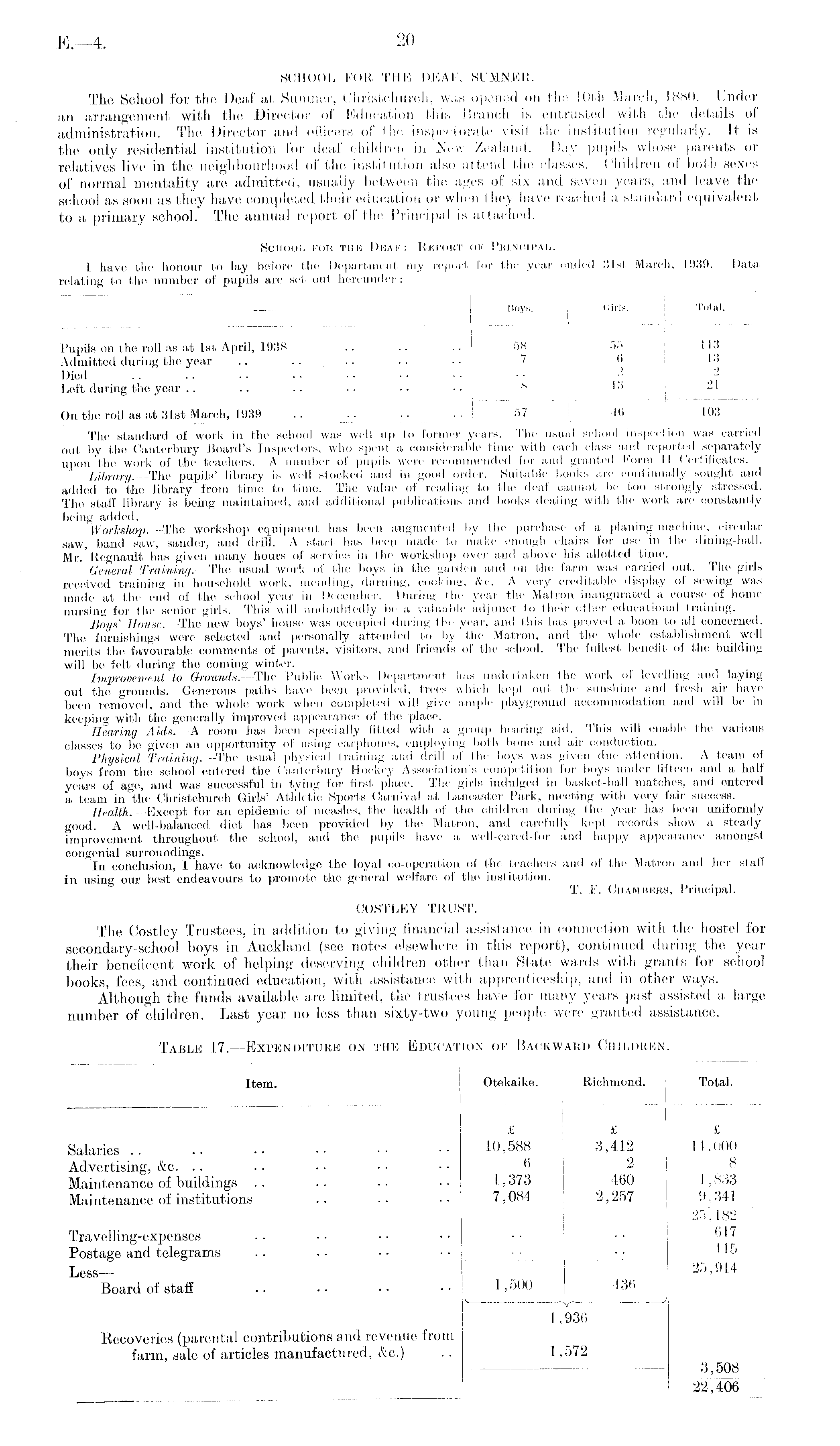 The standard of work in the school was well up to former years. The usual school inspection was carried out by the Canterbury Board's Inspectors, who spent a considerable time with each class and reported separately upon the work of the teachers. A number of pupils were recommended for and granted Form 11 Certificates. Library.—The pupils' library is well stocked and in good order. Suitable books are continually sought and added to the library from time to time. The value of reading to the deaf cannot bo too strongly stressed. The staff library is being maintained, and additional publications and books dealing with the work are constantly being added. Workshop.—The workshop equipment has been augmented by the purchase of a planing-machme, circular saw, band saw, sander, and drill. A start has beep made to make enough chairs for use in the dining-hall. Mr. Regnault has given many hours of service in the workshop over and above his allotted time. General Training.—The usual work of the boys in the garden and on the farm was carried out. The girls received training in household work, mending, darning, cooking, &c. A very creditable display of sewing was made at the end of the school year in December. During the year the Matron inaugurated a course of home nursing for the senior girls. This will undoubtedly be a valuable adjunct to their other educational training. Boys' House. —The new boys' house was occupied during the year, and this has proved a boon to all concerned. The furnishings were selected and personally attended to by the Matron, and the whole establishment well merits the favourable comments of parents, visitors, and friends of the school. The fullest benefit of the building will be felt during the coming winter. Improvement to Grounds.—The Public Works Department has undertaken the work of levelling and laying out the grounds. Generous paths have been provided, trees which kept out the sunshine and fresh air have been removed, and the whole work when completed will give ample playground accommodation and will be in keeping with the generally improved appearance of the place. Hearing Aids. —A room has been specially fitted with a group hearing aid. This will enable the various classes to be given an opportunity of using earphones, employing both bone and air conduction. Physical Training.—The usual physical training and drill of the boys was given due attention. A team of boys from the school entered the Canterbury Hockey Association's competition for boys under fifteen and a half years of age, and was successful in tying for first place. The girls indulged in basket-ball matches, and entered a team in the Christohurch Girls' Athletic Sports Carnival at Lancaster Park, meeting with very fair success. Health. —Except for an epidemic of measles, the health of the children during the year has been uniformly good. A well-balanced diet has been provided by the Matron, and carefully kept records show a steady improvement throughout the school, and the pupils have a well-cared-for and happy appearance amongst congenial surroundings. In conclusion, I have to acknowledge the loyal co-operation of the teachers and of the Matron and her stall in using our best endeavours to promote the general welfare of the institution. T. F. Chambers, Principal. COSTLEY TRUST. The Costley Trustees, in addition to giving financial assistance in connection with the hostel for secondary-school boys in Auckland (see notes elsewhere in this report), continued during the year their beneficent work of helping deserving children other than State wards with grants for school books, fees, and continued education, with assistance with apprenticeship, and in other ways. Although the funds available are limited, the trustees have for many years past assisted a large number of children. Last year no less than sixty-two young people were granted assistance.