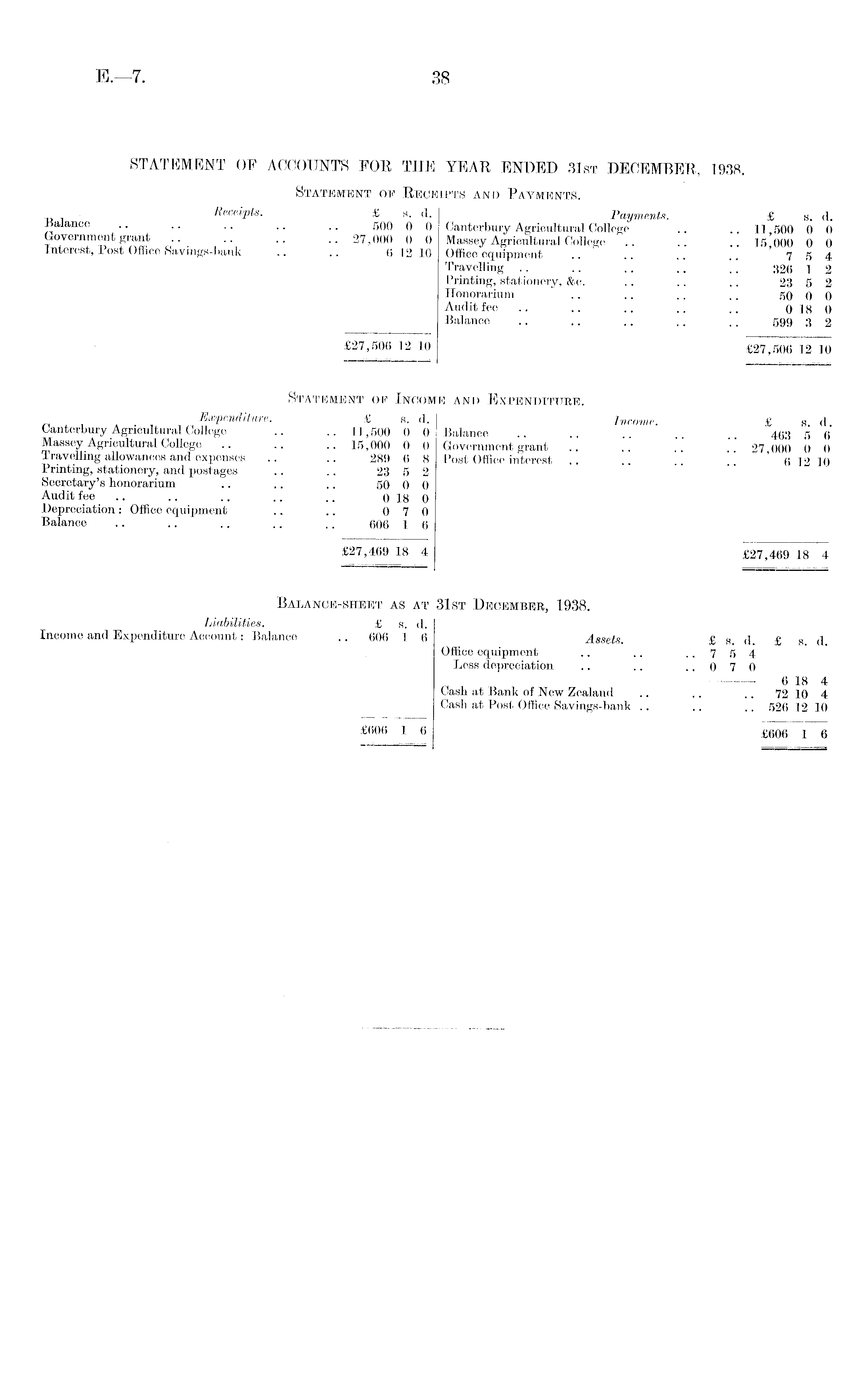 STATEMENT OF ACCOUNTS FOR THE YEAR ENDED 31st DECEMBER, 1938. Statement of Receipts and Payments. n Receipts. £ s. d. Payments. £ s. d. Balance .. .. .. ~ .. goo 0 0 Canterbury Agricultural College .. .. 11 500 0 0 Government grant .. .. 27,000 0 0 Massey Agricultural College 15,000 0 0 Interest, Post Office Savings-bank .. .. 012 10 Office equipment .. .. .. .. 75 4 Travelling . . .. .. .. ~ 326 1 2 Printing, stationery, &c. .. .. .. 23 5 2 Honorarium .. .. .. .. 50 0 0 Audit fee .. .. .. .. ~ 018 0 Balance .. ~ .. .. .. 599 3 2 £27,506 12 10 £27,506 12 10 Statement op Income and Expenditure. Expenditure. £ s. d. Income. £ s d Canterbury Agricultural College .. .. 11,500 0 0 Balance .. .. .. .. .. 463 5 6 Massey Agricultural College .. .. .. 15,000 0 0 Government grant .... 27 000 0 0 Travelling allowances and expenses .. .. 289 6 8 Post Office interest .. .. .. " '61210 Printing, stationery, and postages .. .. 23 5 2 Secretary's honorarium .. .. .. 50 0 0 Audit fee .. .. .. .. ~ 018 0 Depreciation : Office equipment .. .. 0 7 0 Balance .. .. .. .. .. 606 1 6 £27,469 18 4 £27,469 18 4 Balance-sheet as at 31st December, 1938. Liabilities. £ s. d. Income and Expenditure Account: Balance .. 606 1 6 Assets. £s d £ s d Office equipment .. .. ..754 Less depreciation .. .. ..070 6 18 4 Cash at Bank of New Zealand .. .. .. 72 10 4 Cash at Post Office Savings-bank .. .. .. 526 12 10 £606 1 6 £600 x 6