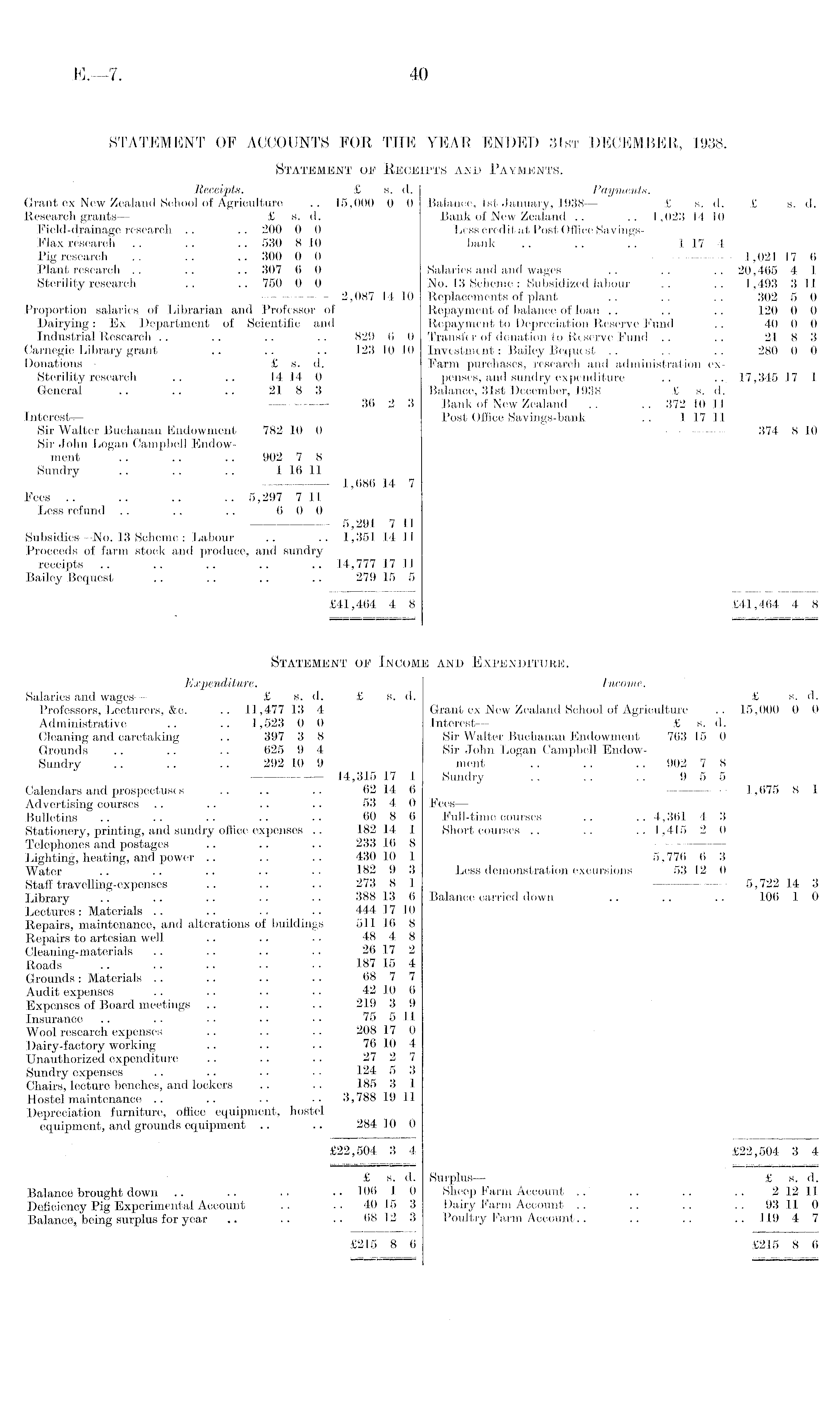 STATEMENT OF ACCOUNTS FOR THE YEAR ENDED 31st DECEMBER, 1938. Statement oe Receipts and Payments. Receipts. £ s. d. Payments. Grant ex New Zealand School of Agriculture .. 15,000 0 0 Balance, Ist January, 1938 — £ s. d. £ s. d. Research grants— £ s. d. Bank of New Zealand .. .. 1,023 14 10 Field-drainage research .. .. 200 0 0 Less credit at Post Office SavingsFlax research . . .. .. 530 810 bank .. .. .. 1 17 4 Pig research .. .. .. 300 0 0 1,021 17 (i Plant research .. .. .. 307 6 0 Salaries and and wages .. .. .. 20,465 4 1 Sterility research .. .. 750 0 0 No. 13 Scheme: Subsidized labour .. .. 1,493 311 2,087 14 10 Replacements of plant .. . . .. 302 5 0 Proportion salaries of Librarian and Professor of Repayment of balance of loan .. .. .. 120 0 0 Dairying: Ex Department of Scientific and Repayment to Depreciation Reserve Fund .. 40 0 0 Industrial Research .. .. .. .. 829 6 0 Transfer of donation to Reserve Fund .. . . 21 8 3 Carnegie Library grant .. .. .. 123 10 10 Investment: Bailey Bequest .. . . .. 280 0 0 Donations — £ s. d. Farm purchases, research and administration exSterility research .. .. 14 14 0 penses, and sundry expenditure .. .. 17,345 17 1 General .. .. .. 21 8 3 Balance, 31st December, .1938 — £ s. d. 30 2 3 Bank of New Zealand .. .. 372 10 11 Interests- Post Office Savings-bank .. 1 17 11 Sir Walter Buchanan Endowment 782 10 0 - 374 8 10 Sir John Logan Campbell Endowment .. .. .. 902 7 8 Sundry .. .. .. I 16 11 1,686 14 7 Fees .. .. .. .. 5,297 7 II Less refund .. .. .. 6 0 0 5,291 7 11 Subsidies—No. 13 Scheme : Labour .. .. 1,351 14 11 Proceeds of farm stock and produce, and sundry receipts .. .. .. .. .. 14,777 17 11 Bailey Bequest .. .. .. .. 279 15 5 £41,464 4 8 £41,464 4 8 Statement oe Income and Expenditure. Expenditure. Income. Salaries and wages — £ s. d. £ s. d. £ s. d. Professors, Lecturers, &c. .. 11,477 13 4 Grant ex New Zealand School of Agriculture .. 15,000 0 0 Administrative .. .. 1,523 0 0 Interest — £ s. d. Cleaning and caretaking .. 397 3 8 Sir Walter Buchanan Endowment 763 15 0 Grounds .. .. .. 625 9 4 Sir John Logan Campbell Endow - Sundry .. .. .. 292 10 9 ment .. .. .. 902 7 8 — 14,315 17 1 Sundry .. .. . . 9 5 5 Calendars and prospectuses .. .. .. 62 14 6 1,675 8 1 Advertising courses .. .. .. .. 53 4 0 Fees — Bulletins .. .. •• •• •• 60 8 6 Full-time courses .. .. 4,361 4 3 Stationery, printing, and sundry office expenses .. 182 14 1 Short courses .. .. .. 1,415 2 0 Telephones and postages .. .. .. 233 16 8 Lighting, heating, and power .. .. .. 430 10 1 5,776 6 3 Water .. • • • • ■ • • • 182 9 3 Less demonstration excursions 53 12 0 Staff travelling-expenses .. .. .. 273 8 1 5,722 14 3 Library .. .. .. • • • • 388 13 6 Balance carried down .. .. .. 106 1 0 Lectures : Materials .. .. . . .. 444 17 10 Repairs, maintenance, and alterations of buildings 511 16 8 Repairs to artesian well .. .. .. 48 4 8 Cleaning-materials .. .. .. . • 26 17 2 Roads 187 15 4 Grounds : Materials .. .. .. .. 68 7 7 Audit expenses .. .. .. .. 42 10 6 Expenses of Board meetings .. .. .. 219 3 9 Insurance .. .. .. .. 75 511 Wool research expenses .. .. .. 208 17 0 Dairy-factory working .. .. .. 76 10 4 Unauthorized expenditure .. .. .. 27 2 7 Sundry expenses .. .. .. . • 124 5 3 Chairs, lecture benches, and lockers .. .. 185 3 1 Hostel maintenance .. .. .. 3,788 19 11 Depreciation furniture, office equipment, hostel equipment, and grounds equipment .. .. 284 10 0 £22,504 3 4 £22,504 3 4 £ s. d. Surplus. £s. d. Balance brought down .. .. .. •• 106 I 0 Sheep Farm Account .. .. .. .. 212 11 Deficiency Pig Experimental Account .. .. 40 .15 3 Dairy Farm Account .. .. .. .. 93 11 0 Balance, being surplus for year .. .. .. 68 12 3 Poultry Farm Account.. .. .. .. 119 4 7 £215 8 6 £215 8 6
