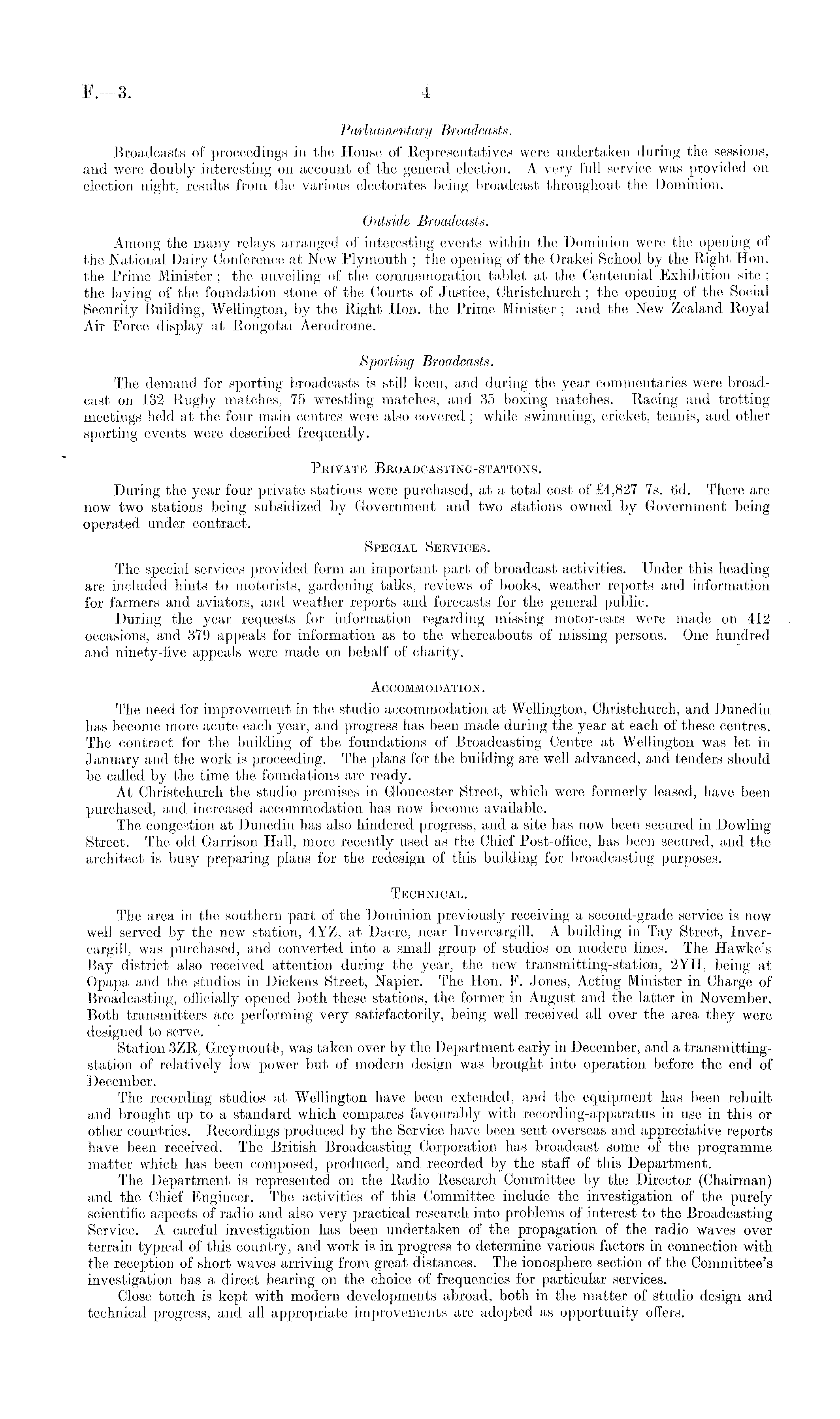 Parliamentary Broadcasts. Broadcasts of proceedings in the House of Representatives were undertaken during the sessions, and were doubly interesting on account of the general election. A very full service was provided on election night, results from the various electorates being broadcast throughout the Dominion. Outside Broadcasts. Among the many relays arranged of interesting events within the Dominion were the opening of the National Dairy Conference at New Plymouth ; the opening of the Orakei School by the Right Hon. the Prime Minister ; the unveiling of the commemoration tablet at the Centennial Exhibition site ; the laying of the foundation stone of the Courts of Justice, Christchurch ; the opening of the Social Security Building, Wellington, by the Right Hon. the Prime Minister ; and the New Zealand Royal Air Force display at Rongotai Aerodrome. Sporting Broadcasts. The demand for sporting broadcasts is still keen, and during the year commentaries were broadcast on 132 Rugby matches, 75 wrestling matches, and. 35 boxing matches. Racing and trotting meetings held at the four main centres were also covered ; while swimming, cricket, tennis, and other sporting events were described frequently. Private Broadcasting -stations . During the year four private stations were purchased, at a total cost of £4,827 7s. 6d. There are now two stations being subsidized by Government and two stations owned by Government being operated under contract. Special Services. The special services provided form an important part of broadcast activities. Under this heading are included hints to motorists, gardening talks, reviews of books, weather reports and information for farmers and aviators, and weather reports and forecasts for the general public. During the year requests for information regarding missing motor-cars were made on 412 occasions, and 379 appeals for information as to the whereabouts of missing persons. One hundred and ninety-five appeals were made on behalf of charity. Accommodation. The need for improvement in the studio accommodation at Wellington, Christchurch, and Dunedin has become more acute each year, and progress has been made during the year at each of these centres. The contract for the building of the foundations of Broadcasting Centre at Wellington was let in January and the work is proceeding. The plans for the building are well advanced, and tenders should be called by the time the foundations are ready. At Christchurch the studio premises in Gloucester Street, which were formerly leased, have been purchased, and increased accommodation has now become available. The congestion at Dunedin has also hindered progress, and a site has now been secured in Dowling Street. The old Garrison Hall, more recently used as the Chief Post-office, has been secured, and the architect is busy preparing plans for the redesign of this building for broadcasting purposes. Technical. The area in the southern part of the Dominion previously receiving a second-grade service is now well served by the new station, 4YZ, at Dacre, near Invercargill. A building in Tay Street, Invercargill, was purchased, and converted into a small group of studios on modern lines. The Hawke's Bay district also received attention during the year, the new transmitting-station, 2YH, being at Opapa and the studios in Dickens Street, Napier. The Hon. F. Jones, Actiug Minister in Charge of Broadcasting, officially opened both these stations, the former in August and the latter in November. Both transmitters are performing very satisfactorily, being well received all over the area they were designed to serve. Station 3ZR, Greymouth, was taken over by the Department early in December, and a transmittingstation of relatively low power but of modern design was brought into operation before the end of December. The recording studios at Wellington have been extended, and the equipment lias been rebuilt and brought up to a standard which compares favourably with recording-apparatus in use in this or other countries. Recordings produced by the Service have been sent overseas and appreciative reports have been received. The British Broadcasting Corporation has broadcast some of the programme matter which has been composed, produced, and recorded by the staff of this Department. The Department is represented on the Radio Research Committee by the Director (Chairman) and the Chief Engineer. The activities of this Committee include the investigation of the purely scientific aspects of radio and also very practical research, into problems of interest to the Broadcasting Service. A careful investigation has been undertaken of the propagation of the radio waves over terrain typical of this country, and work is in progress to determine various factors in connection with the reception of short waves arriving from great distances. The ionosphere section of the Committee's investigation has a direct bearing on the choice of frequencies for particular services. Close touch is kept with modern developments abroad, both in the matter of studio design and technical progress, and all appropriate improvements are adopted as opportunity offers.
