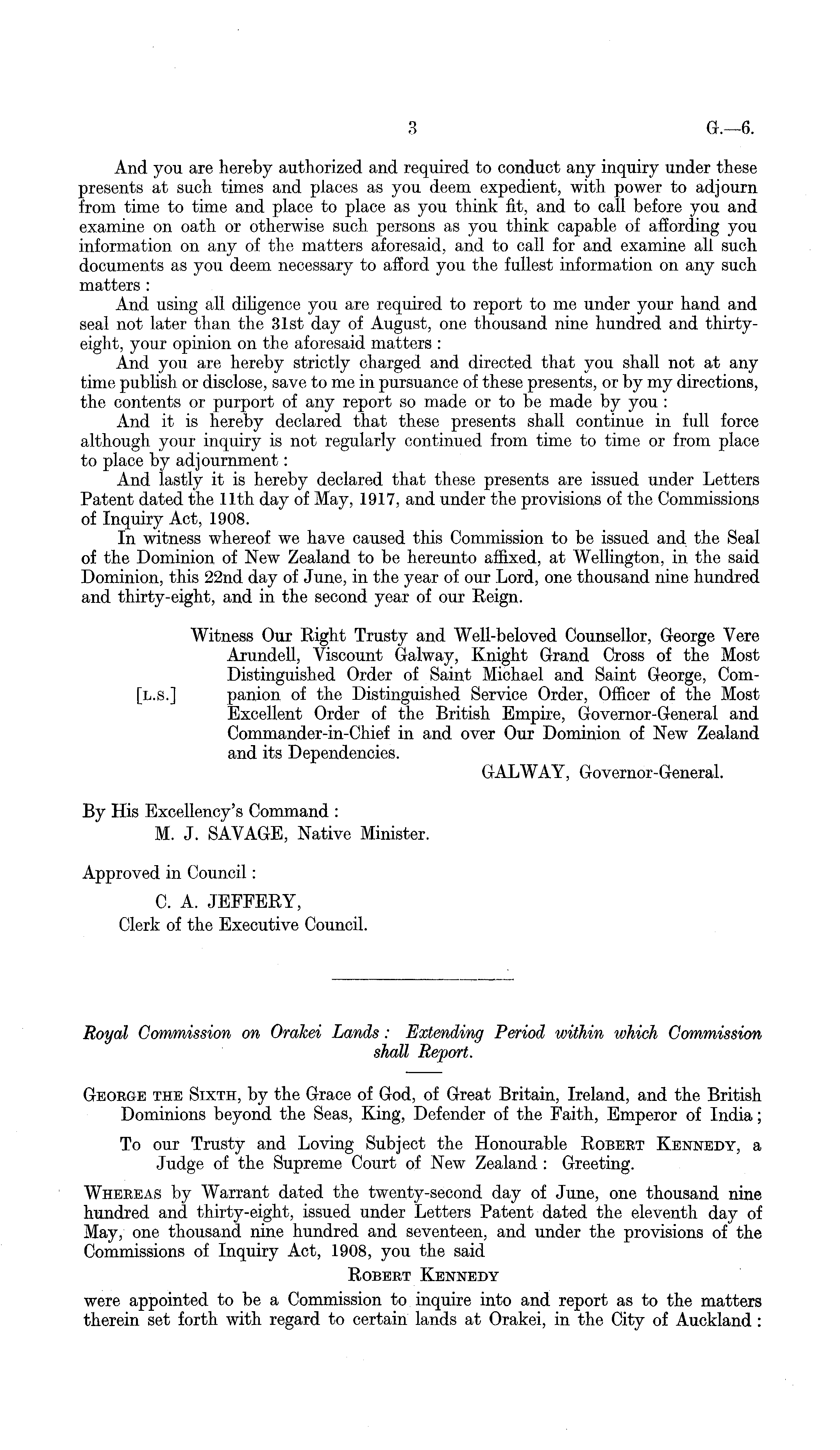 And you are hereby authorized and required to conduct any inquiry under these presents at such times and places as you deem expedient, with power to adjourn from time to time and place to place as you think fit, and to call before you and examine on oath or otherwise such persons as you think capable of affording you information on any of the matters aforesaid, and to call for and examine all such documents as you deem necessary to afford you the fullest information on any such matters : And using all diligence you are required to report to me under your hand and seal not later than the 31st day of August, one thousand nine hundred and thirty - eight, your opinion on the aforesaid matters : And you are hereby strictly charged and directed that you shall not at any time publish or disclose, save to me in pursuance of these presents, or by my directions, the contents or purport of any report so made or to be made by you : And it is hereby declared that these presents shall continue in full force although your inquiry is not regularly continued from time to time or from place to place by adjournment: And lastly it is hereby declared that these presents are issued under Letters Patent dated the 11th day of May, 1917, and under the provisions of the Commissions of Inquiry Act, 1908. In witness whereof we have caused this Commission to be issued and the Seal of the Dominion of New Zealand to be hereunto affixed, at Wellington, in the said Dominion, this 22nd day of June, in the year of our Lord, one thousand nine hundred and thirty-eight, and in the second year of our Reign. Witness Our Right Trusty and Well-beloved Counsellor, George Vere Arundell, Viscount Galway, Knight Grand Cross of the Most Distinguished Order of Saint Michael and Saint George, Com[l.s.] panion of the Distinguished Service Order, Officer of the Most Excellent Order of the British Empire, Governor-General and Commander-in-Chief in and over Our Dominion of New Zealand and its Dependencies. GALWAY, Governor-General. By His Excellency's Command : M. J. SAVAGE, Native Minister. Approved in Council: C. A. JEFFERY, Clerk of the Executive Council.