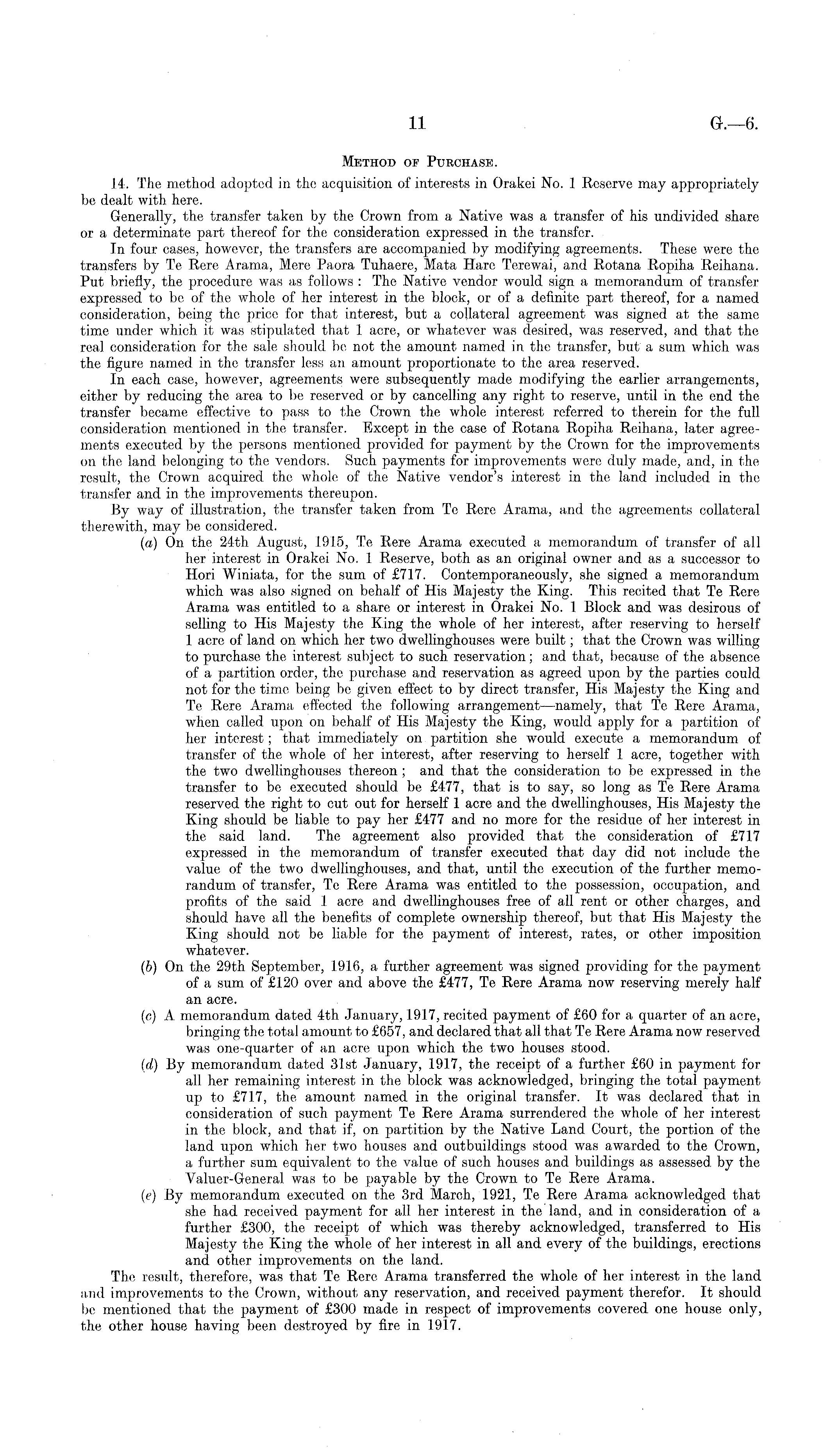 Method of Purchase. 14. The method adopted in the acquisition of interests in Orakei No. 1 Reserve may appropriately be dealt with here. Generally, the transfer taken by the Crown from a Native was a transfer of his undivided share or a determinate part thereof for the consideration expressed in the transfer. In four cases, however, the transfers are accompanied by modifying agreements. These were the transfers by Te Rere Arama, Mere Paora Tuhaere, Mata Hare Terewai, and Rotana Ropiha Reihana. Put briefly, the procedure was as follows : The Native vendor would sign a memorandum of transfer expressed to be of the whole of her interest in the block, or of a definite part thereof, for a named consideration, being the price for that interest, but a collateral agreement was signed at the same time under which it was stipulated that 1 acre, or whatever was desired, was reserved, and that the real consideration for the sale should be not the amount named in the transfer, but a sum which was the figure named in the transfer less an amount proportionate to the area reserved. In each case, however, agreements were subsequently made modifying the earlier arrangements, either by reducing the area to be reserved or by cancelling any right to reserve, until in the end the transfer became effective to pass to the Crown the whole interest referred to therein for the full consideration mentioned in the transfer. Except in the case of Rotana Ropiha Reihana, later agreements executed by the persons mentioned provided for payment by the Crown for the improvements on the land belonging to the vendors. Such payments for improvements were duly made, and, in the result, the Crown acquired the whole of the Native vendor's interest in the land included in the transfer and in the improvements thereupon. By way of illustration, the transfer taken from Te Rere Arama, and the agreements collateral therewith, may be considered. (а) On the 24th August, 1915, Te Rere Arama executed a memorandum of transfer of all her interest in Orakei No. 1 Reserve, both as an original owner and as a successor to Hori Winiata, for the sum of £717. Contemporaneously, she signed a memorandum which was also signed on behalf of His Majesty the King. This recited that Te Rere Arama was entitled to a share or interest in Orakei No. I Block and was desirous of selling to His Majesty the King the whole of her interest, after reserving to herself 1 acre of land on which her two dwellinghouses were built; that the Crown was willing to purchase the interest subject to such reservation; and that, because of the absence of a partition order, the purchase and reservation as agreed upon by the parties could not for the time being be given effect to by direct transfer, His Majesty the King and Te Rere Arama effected the following arrangement —namely, that Te Rere Arama, when called upon on behalf of His Majesty the King, would apply for a partition of her interest; that immediately on partition she would execute a memorandum of transfer of the whole of her interest, after reserving to herself 1 acre, together with the two dwellinghouses thereon ; and that the consideration to be expressed in the transfer to be executed should be £477, that is to say, so long as Te Rere Arama reserved the right to cut out for herself 1 acre and the dwellinghouses, His Majesty the King should be liable to pay her £477 and no more for the residue of her interest in the said land. The agreement also provided that the consideration of £717 expressed in the memorandum of transfer executed that day did not include the value of the two dwellinghouses, and that, until the execution of the further memorandum of transfer, To Rere Arama was entitled to the possession, occupation, and profits of the said 1 acre and dwellinghouses free of all rent or other charges, and should have all the benefits of complete ownership thereof, but that His Majesty the King should not be liable for the payment of interest, rates, or other imposition whatever. (б) On the 29th September, 1916, a further agreement was signed providing for the payment of a sum of £120 over and above the £477, Te Rere Arama now reserving merely half an acre. (c) A memorandum dated 4th January, 1917, recited payment of £60 for a quarter of an acre, bringing the total amount to £657, and declared that all that Te Rere Arama now reserved was one-quarter of an acre upon which the two houses stood. (d) By memorandum dated 31st January, 1917, the receipt of a further £60 in payment for all her remaining interest in the block was acknowledged, bringing the total payment up to £717, the amount named in the original transfer. It was declared that in consideration of such payment Te Rere Arama surrendered the whole of her interest in the block, and that if, on partition by the Native Land Court, the portion of the land upon which her two houses and outbuildings stood was awarded to the Crown, a further sum equivalent to the value of such houses and buildings as assessed, by the Valuer-General was to be payable by the Crown to Te Rere Arama. (e) By memorandum executed on the 3rd March, 1921, Te Rere Arama acknowledged that she had received payment for all her interest in the land, and in consideration of a further £300, the receipt of which was thereby acknowledged, transferred to His Majesty the King the whole of her interest in all and every of the buildings, erections and other improvements on the land. The result, therefore, was that Te Rere Arama transferred the whole of her interest in the land and improvements to the Crown, without any reservation, and received payment therefor. It should be mentioned that the payment of £300 made in respect of improvements covered one house only, the other house having been destroyed by fire in 1917.