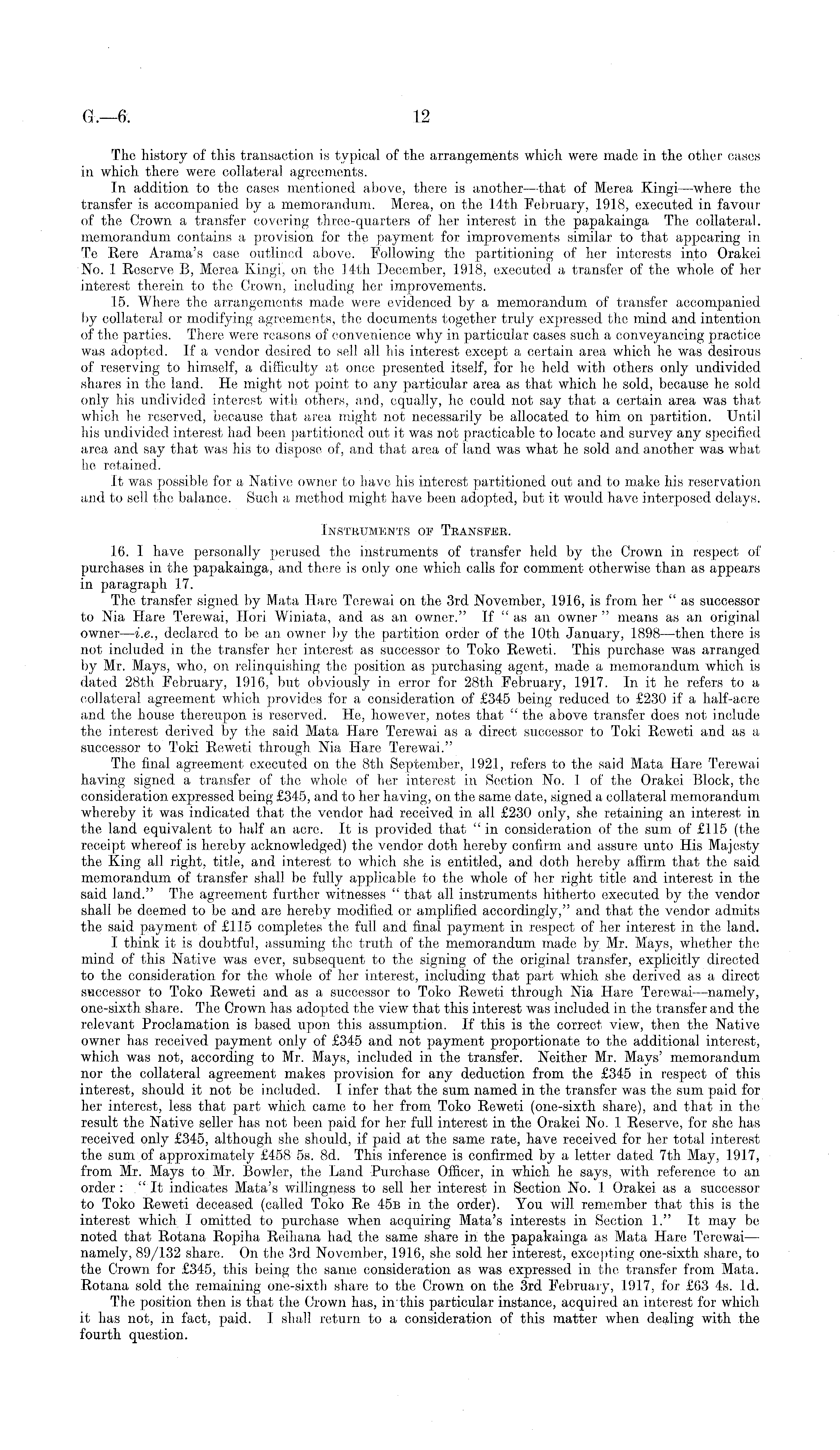 The history of this transaction is typical of the arrangements which were made in the other cases in which there were collateral agreements. In addition to the cases mentioned above, there is another —-that of Merea Kingi—where the transfer is accompanied by a memorandum. Merea, on the 14th February, 1918, executed in favour of the Crown a transfer covering three-quarters of her interest in the papakainga The collateral, memorandum contains a provision for the payment for improvements similar to that appearing in Te Rere Arama's case outlined above. Following the partitioning of her interests into Orakei No. 1 Reserve B, Merea Kingi, on the 14th December, 1918, executed a transfer of the whole of her interest therein to the Crown, including her improvements. 15. Where the arrangements made were evidenced by a memorandum of transfer accompanied by collateral or modifying agreements, the documents together truly expressed the mind and intention of the parties. There were reasons of convenience why in particular cases such a conveyancing practice was adopted. If a vendor desired to sell all his interest except a certain area which he was desirous of reserving to himself, a difficulty at once presented itself, for he held with others only undivided shares in the land. He might not point to any particular area as that which he sold, because he sold only his undivided interest with others, and, equally, he could not say that a certain area was that which he reserved, because that area might not necessarily be allocated to him on partition. Until his undivided interest had been partitioned out it was not practicable to locate and survey any specified area and say that was his to dispose of, and that area of land was what he sold and another was what he retained. It was possible for a Native owner to have his interest partitioned out and to make his reservation and to sell the balance. Such a method might have been adopted, but it. would have interposed delays. Instruments op Transfer. 16. 1 have personally perused the instruments of transfer held by the Crown in respect of purchases in the papakainga, and there is only one which calls for comment otherwise than as appears in paragraph 17. The transfer signed by Mata Hare Terewai on the 3rd November, 1916, is from her " as successor to Nia Hare Terewai, Hori Winiata, and as an owner." If "as an owner " means as an original owner—i.e., declared to be an owner by the partition order of the 10th January, 1898—then there is not included in the transfer her interest as successor to Toko Reweti. This purchase was arranged by Mr. Mays, who, on relinquishing the position as purchasing agent, made a memorandum which is dated 28th February, 1916, but obviously in error for 28th February, 1917. In it he refers to a collateral agreement which provides for a consideration of £345 being reduced to £230 if a half-acre and the house thereupon is reserved. He, however, notes that " the above transfer does not include the interest derived by the said Mata Hare Terewai as a direct successor to Toki Reweti and as a successor to Toki Reweti through Nia Hare Terewai." The final agreement executed on the Bth September, 1921, refers to the said Mata Hare Terewai having signed a transfer of the whole of her interest in Section No. 1 of the Orakei Block, the consideration expressed being £345, and to her having, on the same date, signed a collateral memorandum whereby it was indicated that the vendor had received in all £230 only, she retaining an interest in the land equivalent to half an acre. It is provided that "in consideration of the sum of £115 (the receipt whereof is hereby acknowledged) the vendor doth hereby confirm and assure unto His Majesty the King all right, title, and interest to which she is entitled, and doth hereby affirm that the said memorandum of transfer shall be fully applicable to the whole of her right title and interest in the said land." The agreement further witnesses " that all instruments hitherto executed by the vendor shall be deemed to be and are hereby modified or amplified accordingly," and that the vendor admits the said payment of £115 completes the full and final payment in respect of her interest in the land. I think it is doubtful, assuming the truth of the memorandum made by Mr. Mays, whether the mind of this Native was ever, subsequent to the signing of the original transfer, explicitly directed to the consideration for the whole of her interest, including that part which she derived as a direct successor to Toko Reweti and as a successor to Toko Reweti through Nia Hare Terewai —namely, one-sixth share. The Crown has adopted the view that this interest was included in the transfer and the relevant Proclamation is based upon this assumption. If this is the correct view, then the Native owner has received payment only of £345 and not payment proportionate to the additional interest, which was not, according to Mr. Mays, included in the transfer. Neither Mr. Mays' memorandum nor the collateral agreement makes provision for any deduction from the £345 in respect of this interest, should it not be included. I infer that the sum named in the transfer was the sum paid for her interest, less that part which came to her from Toko Reweti (one-sixth share), and that in the result the Native seller has not been paid for her full interest in the Orakei No. 1 Reserve, for she has received only £345, although she should, if paid at the same rate, have received for her total interest the sum of approximately £458 ss. Bd. This inference is confirmed by a letter dated 7th May, 1917, from Mr. Mays to Mr. Bowler, the Land Purchase Officer, in which he says, with reference to an order: "It indicates Mata's willingness to sell her interest in Section No. 1 Orakei as a successor to Toko Reweti deceased (called Toko Re 45b in the order). You will remember that this is the interest which I omitted to purchase when acquiring Mata's in