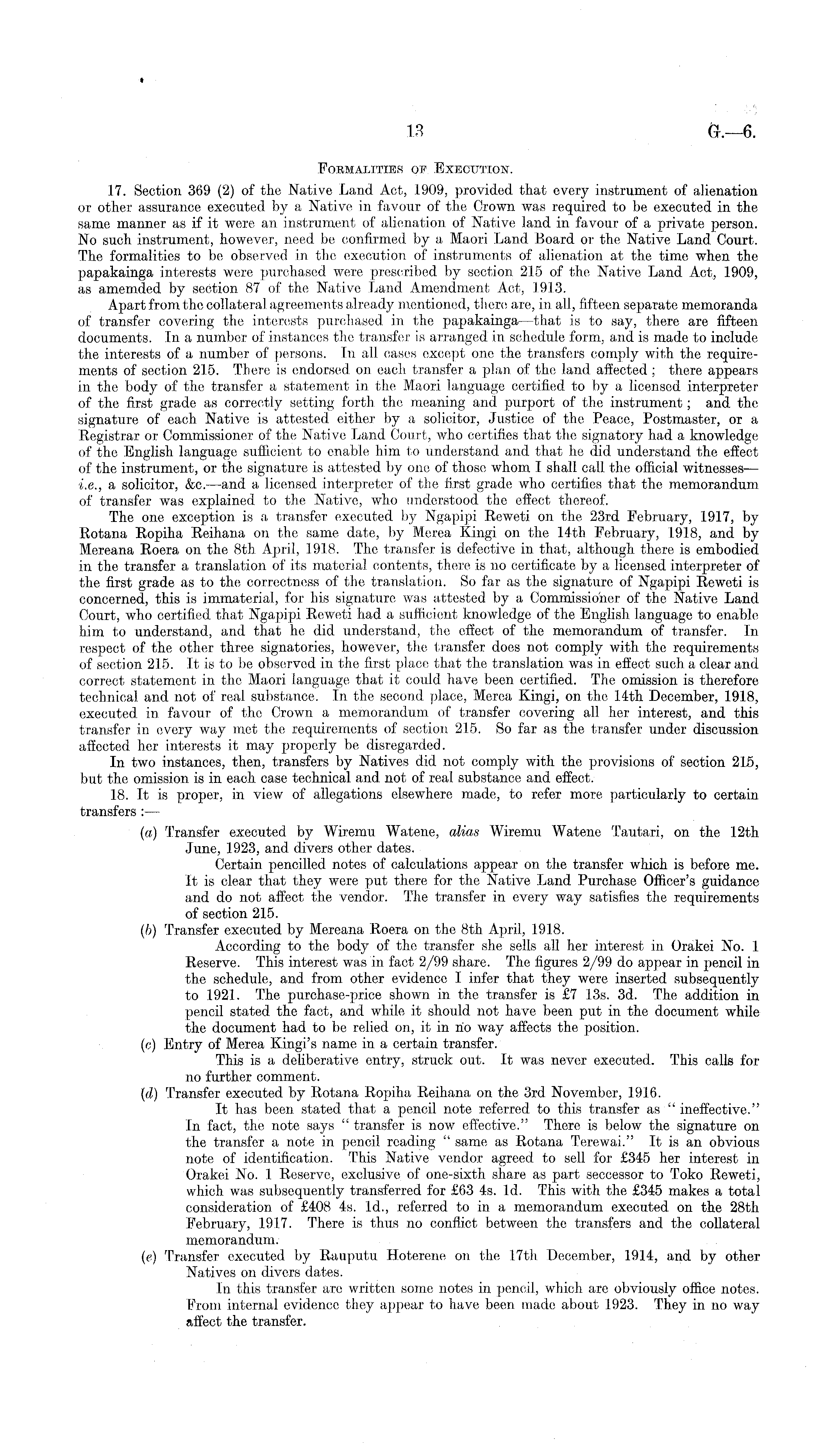 Formalities of Execution. 17. Section 369 (2) of the Native Land Act, 1909, provided that every instrument of alienation or other assurance executed by a Native in favour of the Crown was required to be executed in the same manner as if it were an instrument of alienation of Native land in favour of a private person. No such instrument, however, need be confirmed by a Maori Land Board or the Native Land Court. The formalities to be observed in the execution of instruments of alienation at the time when the papakainga interests were purchased were prescribed by section 215 of the Native Land Act, 1909, as amemded by section 87 of the Native Land Amendment Act, 1913. Apart from the collateral agreements already mentioned, there are, in all, fifteen separate memoranda of transfer covering the interests purchased in the papakainga—that is to say, there are fifteen documents. In a number of instances the transfer is arranged in schedule form, and is made to include the interests of a number of persons. In all cases except one the transfers comply with the requirements of section 215. There is endorsed on each transfer a plan of the land affected ; there appears in the body of the transfer a statement in the Maori language certified to by a licensed interpreter of the first grade as correctly setting forth the meaning and purport of the instrument; and the signature of each Native is attested either by a solicitor, Justice of the Peace, Postmaster, or a Registrar or Commissioner of the Native Land Court, who certifies that the signatory had a knowledge of the English language sufficient to enable him to understand and that he did understand the effect of the instrument, or the signature is attested by one of those whom I shall call the official witnesses — i.e., a solicitor, &c. —and a licensed interpreter of the first grade who certifies that the memorandum of transfer was explained to the Native, who understood the effect thereof. The one exception is a transfer executed by Ngapipi Reweti on the 23rd February, 1917, by Rotana Ropiha Reihana on the same date, by Merea Kingi on the 14th February, 1.918, and by Mereana Roera on the Bth April, 1918. The transfer is defective in that, although there is embodied in the transfer a translation of its material contents, there is no certificate by a licensed interpreter of the first grade as to the correctness of the translation. So far as the signature of Ngapipi Reweti is concerned, this is immaterial, for his signature was attested by a Commissioner of the Native Land Court, who certified that Ngapipi Reweti had a sufficient knowledge of the English language to enable him to understand, and that he did understand, the effect of the memorandum of transfer. In respect of the other three signatories, however, the transfer does not comply with the requirements of section 215. It is to be observed in the first place that the translation was in effect such a clear and correct statement in the Maori language that it could have been certified. The omission is therefore technical and not of real substance. In the second place, Merea Kingi, on the 14th December, 1918, executed, in favour of the Crown a memorandum of transfer covering all her interest, and this transfer in every way met the requirements of section 215. So far as the transfer under discussion affected her interests it may properly be disregarded. In two instances, then, transfers by Natives did not comply with the provisions of section 215, but the omission is in each case technical and not of real substance and effect. 18. It is proper, in view of allegations elsewhere made, to refer more particularly to certain transfers :— (a) Transfer executed by Wiremu Watene, alias Wiremu Watene Tautari, on the 12th June, 1923, and divers other dates. Certain pencilled notes of calculations appear on the transfer which is before me. It is clear that they were put there for the Native Land Purchase Officer's guidance and do not affect the vendor. The transfer in every way satisfies the requirements of section 215. (Ib) Transfer executed by Mereana Roera on the Bth April, 1918. According to the body of the transfer she sells all her interest in Orakei No. 1 Reserve. This interest was in fact 2/99 share. The figures 2/99 do appear in pencil in the schedule, and from other evidence I infer that they were inserted subsequently to 1921. The purchase-price shown in. the transfer is £7 13s. 3d. The addition in pencil stated the fact, and while it should not have been put in the document while the document had to be relied on, it in no way affects the position. (c) Entry of Merea Kingi's name in a certain transfer. This is a deliberative entry, struck out. It was never executed. This calls for no further comment. (d) Transfer executed by Rotana Ropiha Reihana on the 3rd November, 1916. It has been stated that a pencil note referred to this transfer as " ineffective." In fact, the note says " transfer is now effective." There is below the signature on the transfer a note in pencil reading " same as Rotana Terewai." It is an obvious note of identification. This Native vendor agreed to sell for £345 her interest in Orakei No. .1 Reserve, exclusive of one-sixth share as part seccessor to Toko Reweti, which was subsequently transferred for £63 4s. Id. This with the £345 makes a total consideration of £408 4s. Id., referred to in a memorandum executed on the 28th February, 1917. There is thus no conflict between the transfers and the collateral memorandum. (e) Transfer executed by Rauputu Hoterene on the 17th December, 1914, and by other Natives on divers dates. In this transfer are written some notes in pencil, which are obviously office notes. From internal evidence they appear to have been made about 1923. They in no way affect the transfer.