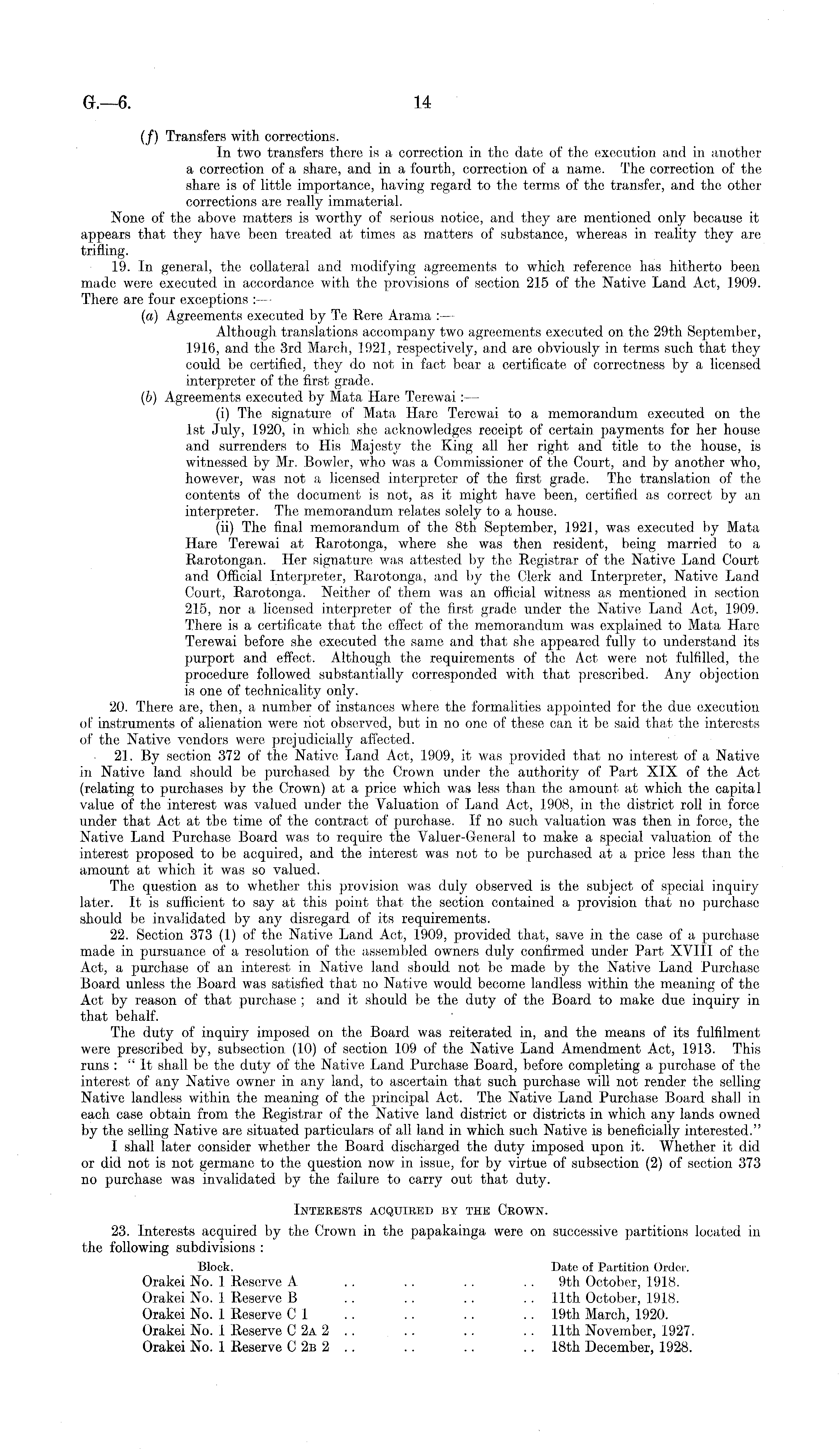 (/) Transfers with corrections. In two transfers there is a correction in the date of the execution and in another a correction of a share, and in a fourth, correction of a name. The correction of the share is of little importance, having regard to the terms of the transfer, and the other corrections are really immaterial. None of the above matters is worthy of serious notice, and they are mentioned only because it appears that they have been treated at times as matters of substance, whereas in reality they are trifling. 19. In general, the collateral and modifying agreements to which reference has hitherto been made were executed in accordance with the provisions of section 215 of the Native Land Act, 1909. There are four exceptions (a) Agreements executed by Te Rere Arama : — Although translations accompany two agreements executed on the 29th September, 1916, and the 3rd March, 1921, respectively, and are obviously in terms such that they could be certified, they do not in fact boar a certificate of correctness by a licensed interpreter of the first grade. (b) Agreements executed by Mata Hare Terewai: — (i) The signature of Mata Hare Terewai to a memorandum executed on the Ist July, 1920, in which she acknowledges receipt of certain payments for her house and surrenders to His Majesty the King all her right and title to the house, is witnessed by Mr. Bowler, who was a Commissioner of the Court, and by another who, however, was not a licensed interpreter of the first grade. The translation of the contents of the document is not, as it might have been, certified as correct by an interpreter. The memorandum relates solely to a house. (ii) The final memorandum of the Bth September, 1921, was executed by Mata Hare Terewai at Rarotonga, where she was then resident, being married to a Rarotongan. Her signature was attested by the Registrar of the Native Land Court and Official Interpreter, Rarotonga, and by the Clerk and Interpreter, Native Land Court, Rarotonga. Neither of them was an official witness as mentioned in section 215, nor a licensed interpreter of the first grade under the Native Land Act, 1909. There is a certificate that the effect of the memorandum was explained to Mata Hare Terewai before she executed the same and that she appeared fully to understand its purport and effect. Although the requirements of the Act were not fulfilled, the procedure followed substantially corresponded with that prescribed. Any objection is one of technicality only. 20. There are, then, a number of instances where the formalities appointed for the due execution of instruments of alienation were riot observed, but in no one of these can it be said that the interests of the Native vendors were prejudicially affected. 21. By section 372 of the Native Land Act, 1909, it was provided that no interest of a Native in Native land should be purchased by the Crown under the authority of Part XIX of the Act (relating to purchases by the Crown) at a price which was less than the amount at which the capital value of the interest was valued under the Valuation of Land Act, 1908, in the district roll in force under that Act at the time of the contract of purchase. If no such valuation was then in force, the Native Land Purchase Board was to require the Valuer-General to make a special valuation of the interest proposed to be acquired, and the interest was not to be purchased at a price less than the amount at which it was so valued. The question as to whether this provision was duly observed is the subject of special inquiry later. It is sufficient to say at this point that the section contained a provision that no purchase should be invalidated by any disregard of its requirements. 22. Section 373 (1) of the Native Land Act, 1909, provided that, save in the case of a purchase made in pursuance of a resolution of the assembled owners duly confirmed under Part XVIII of the Act, a purchase of an interest in Native land should not be made by the Native Land Purchase Board unless the Board was satisfied that no Native would become landless within the meaning of the Act by reason of that purchase ; and it should be the duty of the Board to make due inquiry in that behalf. The duty of inquiry imposed on the Board was reiterated in, and the means of its fulfilment were prescribed by, subsection (10) of section 109 of the Native Land Amendment Act, 1913. This runs : " It shall be the duty of the Native Land Purchase Board, before completing a purchase of the interest of any Native owner in any land, to ascertain that such purchase will not render the selling Native landless within the meaning of the principal Act. The Native Land Purchase Board shall in each case obtain from the Registrar of the Native land district or districts in which any lands owned by the selling Native are situated particulars of all land in which such Native is beneficially interested." I shall later consider whether the Board discharged the duty imposed upon it. Whether it did or did not is not germane to the question now in issue, for by virtue of subsection (2) of section 373 no purchase was invalidated by the failure to carry out that duty. Interests acquired by the Crown. 23. Interests acquired by the Crown in the papakainga were on successive partitions located in the following subdivisions : Block. Date of Partition Order. Orakei No. 1 Reserve A .. .. .. .. 9th October, 1918. Orakei No. 1 Reserve B .. .. .. .. 11th October, 1918. Orakei No. 1 Reserve CI .. .. .. .. 19th March, 1920. Orakei No. 1 Reserve C2a 2 .. .. .. .. 11th November, 1927. Orakei No. 1 Reserve C2b 2 .. .. .. .. 18th December, 1928.