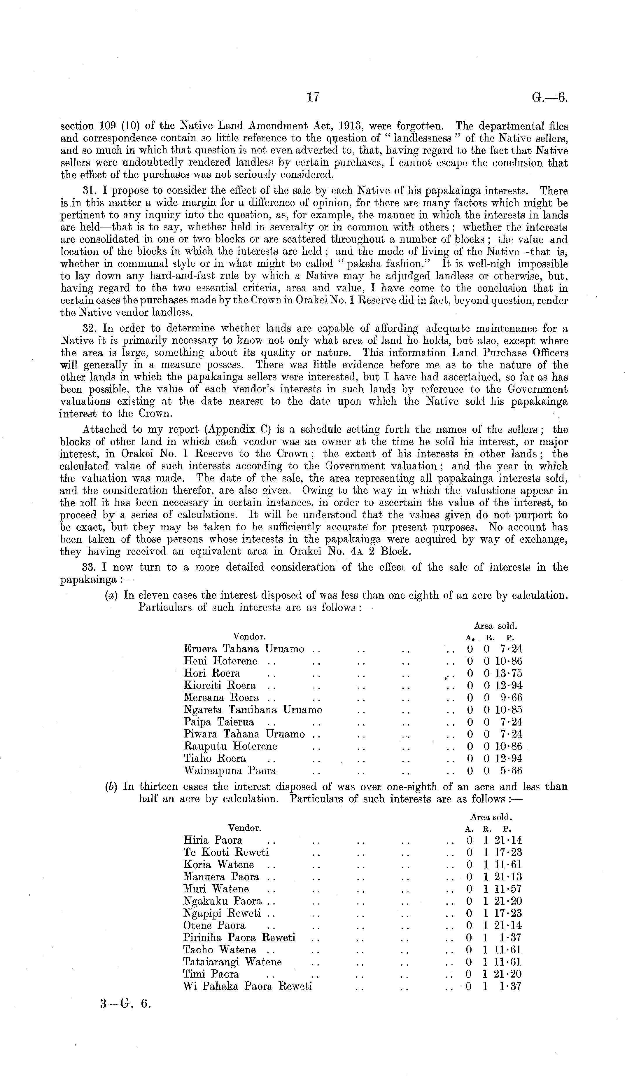 section 109 (10) of the Native Land Amendment Act, 1913, were forgotten. The departmental files and correspondence contain so little reference to the question of " landlessness " of the Native sellers, and so much in which that question is not even adverted to, that, having regard to the fact that Native sellers were undoubtedly rendered landless by certain purchases, I cannot escape the conclusion that the effect of the purchases was not seriously considered. 31. I propose to consider the effect of the sale by each Native of his papakainga interests. There is in this matter a wide margin for a difference of opinion, for there are many factors which might be pertinent to any inquiry into the question, as, for example, the manner in which the interests in lands are held —that is to say, whether held in severalty or in common with others ; whether the interests are consolidated in one or two blocks or are scattered throughout a number of blocks ; the value and location of the blocks in which the interests are held ; and the mode of living of the Native—that is, whether in communal style or in what might be called " pakeha fashion." It is well-nigh impossible to lay down any hard-and-fast rule by which a Native may be adjudged landless or otherwise, but, having regard to the two essential criteria, area and value, I have come to the conclusion that in certain cases the purchases made by the Crown in Orakei No. 1 Reserve did in fact, beyond question, render the Native vendor landless. 32. In order to determine whether lands are capable of affording adequate maintenance for a Native it is primarily necessary to know not only what area of land he holds, but also, except where the area is large, something about its quality or nature. This information Land Purchase Officers will generally in a measure possess. There was little evidence before me as to the nature of the other lands in which the papakainga sellers were interested, but I have had ascertained, so far as has been possible, the value of each vendor's interests in such lands by reference to the Government valuations existing at the date nearest to the date upon which the Native sold his papakainga interest to the Crown. Attached to my report (Appendix C) is a schedule setting forth the names of the sellers ; the blocks of other land in which each vendor was an owner at the time he sold his interest, or major interest, in Orakei No. 1 Reserve to the Crown ; the extent of his interests in other lands ; the calculated value of such interests according to the Government valuation ; and the year in which the valuation was made. The date of the sale, the area representing all papakainga interests sold, and the consideration therefor, are also given. Owing to the way in which the valuations appear in the roll it has been necessary in certain instances, in order to ascertain the value of the interest, to proceed by a series of calculations. It will be understood that the values given do not purport to be exact, but they may be taken to be sufficiently accurate for present purposes. No account has been taken of those persons whose interests in the papakainga were acquired by way of exchange, they having received an equivalent area in Orakei No. 4a 2 Block. 33. I now turn to a more detailed consideration of the effect of the sale of interests in the papakainga (a) In eleven cases the interest disposed of was loss than one-eighth of an acre by calculation. Particulars of such interests are as follows :— Area sold. Vendor. A, R. P. Eruera Tahana Uruamo . . .. . . 0 0 7• 24 Heni Hoterene .. .. .. .. .. 0 0 10-86 Hori Roera .. .. .. .. .. 0 0 13-75 Kioreiti Roera .. .. .. .. 0 0 12-94 Mereana Roera .. .. .. .. ..0 0 9-66 Ngareta Tamihana Uruamo .. .. 0 0 10-85 Paipa Taierua .. .. .. .. .. 0 0 7• 24 Piwara Tahana Uruamo .. . . .. 0 0 7• 24 Rauputu Hoterene .. .. .. 0 0 10-86 Tiaho Roera .. .. .. .. 0 0 12-94 Waimapuna Paora .. .. .. 0 0 5-66 (b) In thirteen cases the interest disposed of was over one-eighth of an acre and less than half an acre by calculation. Particulars of such interests arc as follows Area sold. Vendor. A. B. P. Hiria Paora . . . . . . .. 0 1 21-14 Te Kooti Reweti .. .. .. 0 1 17-23 Koria Watene .. .. .. .. 0 1 11-61 Manuera Paora .. .. .. .. ..0121-13 Muri Watene .. .. .. .. .. 0 1 11-57 Ngakuku Paora .. .. .. .. .. 0 121• 20 Ngapipi Reweti .. .. .. .. .. 0 117• 23 Otene Paora .. .. .. .. ..0121-14 Piriniha Paora Reweti .. .. .. .. 0 1 1• 37 Taoho Watene .. .. .. .. .. 0 1 11-61 Tataiarangi Watene .. .. .. .. 0 1 11-61 Timi Paora .. .. .. .. .. 0 1 21-20 Wi Pahaka Paora Reweti .. .. ..0 1 1-37