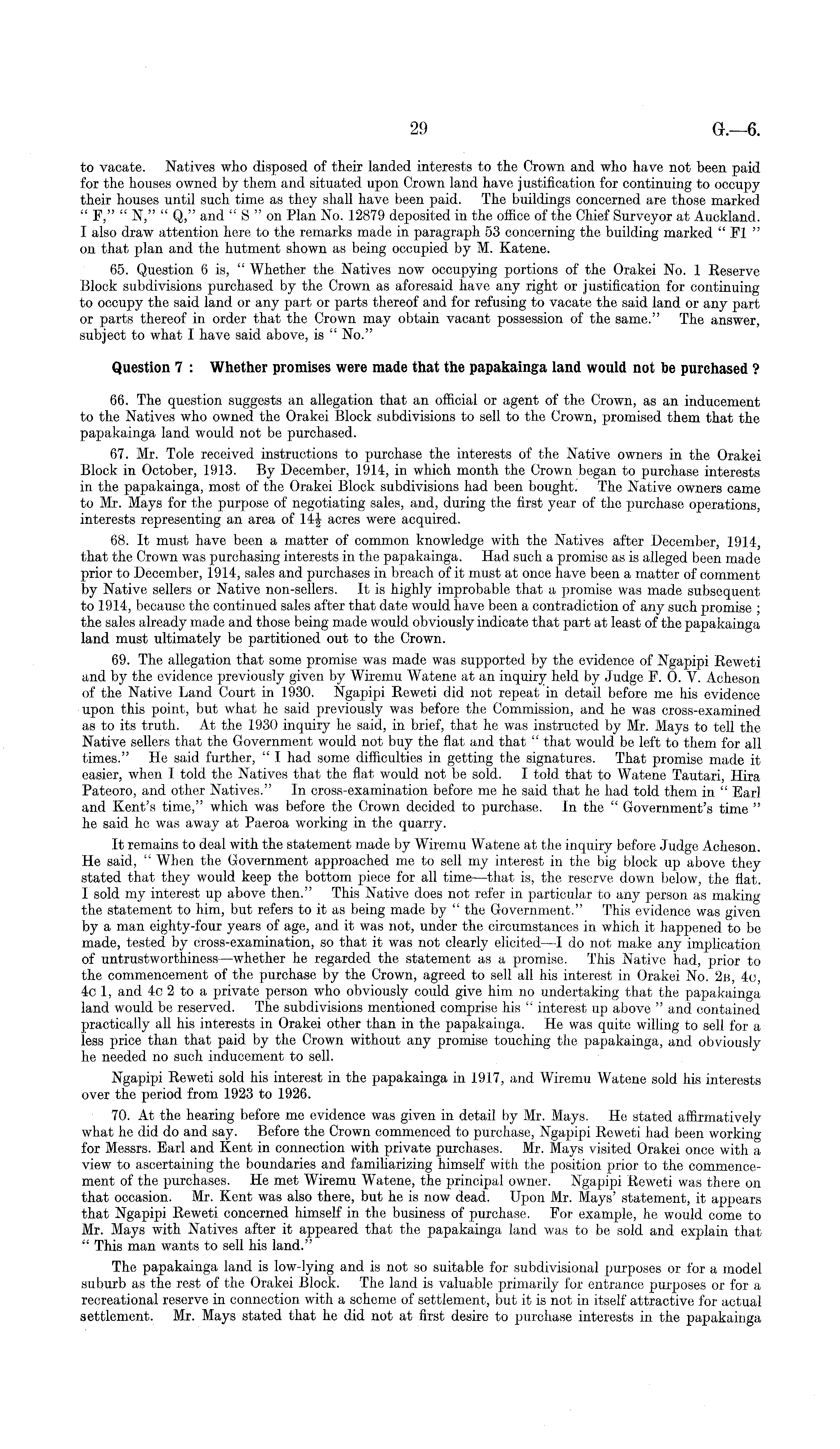 to vacate. Natives who disposed of their landed interests to the Crown and who have not been paid for the houses owned by them and situated upon Crown land have justification for continuing to occupy their houses until such time as they shall have been paid. The buildings concerned are those marked " P," " N," " Q," and " S " on Plan No. 12879 deposited in the office of the Chief Surveyor at Auckland. I also draw attention here to the remarks made in paragraph 53 concerning the building marked " PI " on that plan and the hutment shown as being occupied by M. Katene. 65. Question 6 is, " Whether the Natives now occupying portions of the Orakei No. 1 Reserve Block subdivisions purchased by the Crown as aforesaid have any right or justification for continuing to occupy the said land or any part or parts thereof and for refusing to vacate the said land or any part or parts thereof in order that the Crown may obtain vacant possession of the same." The answer, subject to what I have said above, is " No." Question 7 : Whether promises were made that the papakainga land would not be purchased ? 66. The question suggests an allegation that an official or agent of the Crown, as an inducement to the Natives who owned the Orakei Block subdivisions to sell to the Crown, promised them that the papakainga land would not be purchased. 67. Mr. Tole received instructions to purchase the interests of the Native owners in the Orakei Block in October, 1913. By December, 1914, in which month the Crown began to purchase interests in the papakainga, most of the Orakei Block subdivisions had been bought. The Native owners came to Mr. Mays for the purpose of negotiating sales, and, during the first year of the purchase operations, interests representing an area of 14J acres were acquired. 68. It must have been a matter of common knowledge with the Natives after December, 1914, that the Crown was purchasing interests in the papakainga. Had such a promise as is alleged been made prior to December, 1914, sales and purchases in breach of it must at once have been a matter of comment by Native sellers or Native non-sellers. It is highly improbable that a promise was made subsequent to 1914, because the continued sales after that date would have been a contradiction of any such promise ; the sales already made and those being made would obviously indicate that part at least of the papakainga land must ultimately be partitioned out to the Crown. 69. The allegation that some promise was made was supported by the evidence of Ngapipi Reweti and by the evidence previously given by Wiremu Watene at an inquiry held by Judge P. 0. V. Acheson of the Native Land Court in 1930. Ngapipi Reweti did not repeat in detail before me his evidence upon this point, but what he said previously was before the Commission, and he was cross-examined as to its truth. At the 1930 inquiry he said, in brief, that he was instructed by Mr. Mays to tell the Native sellers that the Government would not buy the flat and that " that would be left to them for all times." He said further, " I had some difficulties in getting the signatures. That promise made it easier, when I told the Natives that the flat would not be sold. I told that to Watene Tautari, Hira Pateoro, and other Natives." In cross-examination before me he said that he had told them in " Earl and Kent's time," which was before the Crown decided to purchase. In the " Government's time " he said he was away at Paeroa working in the quarry. It remains to deal with the statement made by Wiremu Watene at the inquiry before Judge Acheson. He said, " When the Government approached me to sell my interest in the big block up above they stated that they would keep the bottom piece for all time —that is, the reserve down below, the flat. I sold my interest up above then." This Native does not refer in particular to any person as making the statement to him, but refers to it as being made by " the Government." This evidence was given by a man eighty-four years of age, and it was not, under the circumstances in which it happened to be made, tested by cross-examination, so that it was not clearly elicited— I do not make any implication of untrustworthiness —whether he regarded the statement as a promise. This Native had, prior to the commencement of the purchase by the Crown, agreed to sell all his interest in Orakei No. 2b, 4c, 4c 1, and 4c 2 to a private person who obviously could give him no undertaking that the papakainga land would be reserved. The subdivisions mentioned comprise his " interest up above " and contained practically all his interests in Orakei other than in the papakainga. He was quite willing to sell for a less price than that paid by the Crown without any promise touching the papakainga, and obviously he needed no such inducement to sell. Ngapipi Reweti sold his interest in the papakainga in 1917, and Wiremu Watene sold his interests over the period from 1923 to 1926. 70. At the hearing before me evidence was given in detail by Mr. Mays. He stated affirmatively what he did do and say. Before the Crown commenced to purchase, Ngapipi Reweti had been working for Messrs. Earl and Kent in connection with private purchases. Mr. Mays visited Orakei once with a view to ascertaining the boundaries and familiarizing himself with the position prior to the commencement of the purchases. He met Wiremu Watene, the principal owner. Ngapipi Reweti was there on that occasion. Mr. Kent was also there, but he is now dead. Upon Mr. Mays' statement, it appears that Ngapipi Reweti concerned himself in the business of purchase. Por example, he would come to Mr. Mays with Natives after it appeared that the papakainga land was to be sold and explain that " This man wants to sell his land." The papakainga land is low-lying and is not so suitable for subdivisional purposes or for a model suburb as the rest of the Orakei Block. The land is valuable primarily for entrance purposes or for a recreational r
