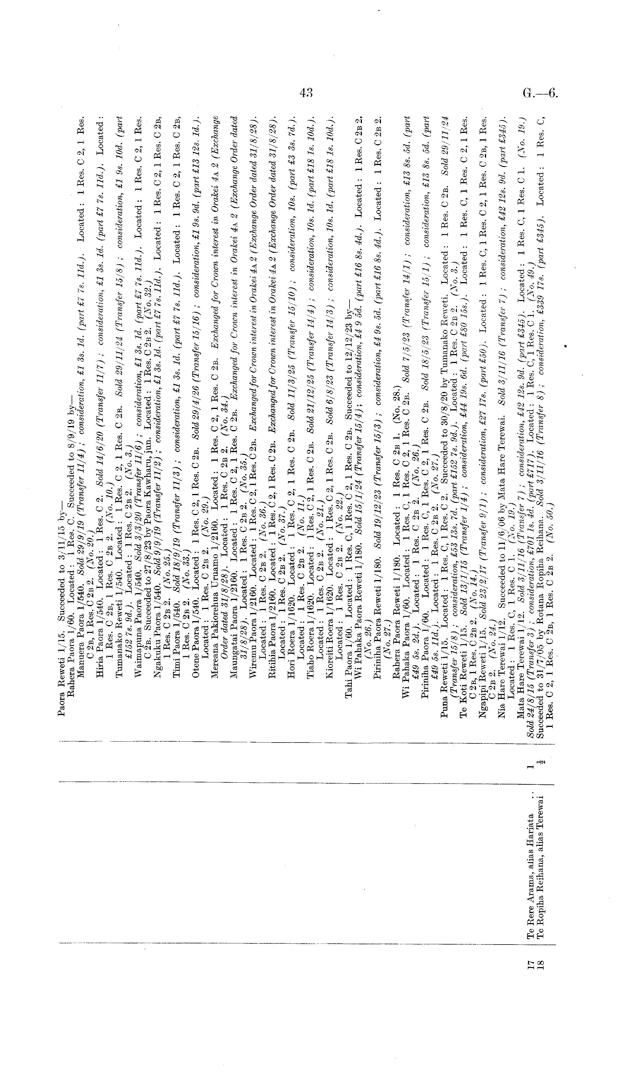 Paora Reweti 1/15. Succeeded to 3/11/15 by— Rahera Paora 1/60. Located : 1 Res. C. Succeeded to 8/9/19 by— Manuera Paora 1/540. Sold 29/9/19 (Transfer 11/4) ; consideration, £1 3s. Id. (part £7 7s. lid.). Located : 1 Res. C 2, 1 Res. C 2b, 1 Res. C 2b 2. (No. 20.') Hiria Paora 1/540. Located : 1 Res. C 2. Sold 14/6/20 (Transfer 11/7) ; consideration, £1 3s. Id. (part £7 7s. lid.). Located : 1 Res. C 2b, 1 Res. C 2b 2. (No. 10.) Tumanako Reweti 1/540. Located: 1 Res. C 2, 1 R,es. C 2b. Sold 29/11/24 (Transfer 15/8) ; consideration, £1 9s. lOd. (part £152 7s. 9d.). Located : 1 Res. C 2b 2. (No. 3.) Waimapuna Paora 1/540. Sold 3/3/20 (Transfer 11/6) ; consideration, £1 3s. Id. (part £7 7s. lid.). Located : 1 Res. C 2, 1 Res. C 2b. Succeeded to 27/8/23 by Paora Kawharu, jun. Located: 1 Res. C 2b 2. (No. 32.) Ngakuku Paora 1/540. Sold 9/9/19 (Transfer 11/2) ; consideration, £1 3s. Id. (part £7 7s. lid.). Located: 1 Res. C 2, 1 Res. G 2b, 1 Res. C 2b 2. (No. 25.) Timi Paora 1/540. Sold 18/9/19 (Transfer 11/3) ; consideration, £1 3s. Id. (part £7 7s. lid.). Located: 1 Res. C 2, 1 Res. C 2b, 1 Res. C 2b 2. (No. 33.) Otene Paora 1/540. Located : 1 Res. C 2, 1 Res. C 2b. Sold 29/4/26 (Transfer 15/16) ; consideration, £1 9s. 9d. (part £13 12s. Id.). Located : 1 Res. C 2b 2. (No. 29.) Mereana Pakiorehua Uruamo 1/2160. Located : 1 Res. C 2, 1 Res. C 2b. Exchanged for Crown interest in Orakei 4a 2 (Exchange Order dated 31/8/28). Located : 1 Res. C 2b 2. (No. 34.) Maungatai Paora 1/2160. Located : 1 Res. C 2, 1 Res. C 2b. Exchanged for Crown interest in Orakei 4a 2 (Exchange Order dated 31/8/28). Located : 1 Res. C 2b 2. (No. 35.) Wiremu Paora 1/2160. Located : 1 Res. C 2, 1 Res. C 2b. Exchanged for Crown interest in Orakei 4a 2 (Exchange Order dated 31/8/28). Located : 1 Res. C 2b 2. (No. 36.) Ritihia Paora 1/2160. Located : 1 Res. C 2, 1 Res. C 2b. Exchanged for Crown interest in Orakei 4a 2 (Exchange Order dated 31/8/28). Located : 1 Res. C 2b 2. (No. 37.) Hori Roera 1/1620. Located: 1 Res. C 2, 1 Res. C 2b. Sold 11/3/25 (Transfer 15/10) ; consideration, 10s. (part £3 3s. 7d.). Located : 1 Res. C 2b 2. (No. 11.) Tiaho Roera 1/1620. Located : 1 Res. C 2, 1 Res. C 2b. Sold 21/12/25 (Transfer 14/4) ; consideration, 10s. Id. (part £18 Is. 10d.). Located : 1 Res. C 2b 2. (No. 21.) Kioreiti Roera 1/1620. Located : 1 Res. C 2, 1 Res. C 2b. Sold 6/8/23 (Transfer 14/3) ; consideration, 10s. Id. (part £18 Is. 10d.). Located : 1 Res. C 2b 2. (No. 22.) Tahi Paora 1/60. Located : 1 Res. G, 1 Res. C 2, 1 Res. C 2b. Succeeded to 12/12/23 by— Wi Pahaka Paora Reweti 1/180. Sold 15/1/24 (Transfer 15/ 4) ; consideration, £4 9 5d. (part £16 8s. 4d.). Located: 1 Res. C 2b 2. (No. 26.) Piriniha Paora Reweti 1/180. Sold 19/12/23 (Transfer 15/3) ; consideration, £4 9s. 5d. (part £16 8s. 4d.). Located : 1 Res. C 2b 2. (No. 27.) Rahera Paora Reweti 1/180. Located : 1 Res. C 2b 1. (No. 28.) Wi Pahaka Paora 1/60. Located : 1 Res. C, 1 Res. C 2, 1 Res. C 2b. Sold 7/5/23 (Transfer 14/1) ; consideration, £13 8s. 5d. (part £49 5s. 2d.). Located : 1 Res. C 2b 2. (No. 26.) Piriniha Paora 1/60. Located: 1 Res. C, 1 Res. C 2, 1 Res. C 2b. Sold 18/5/23 (Transfer 15/1) ; consideration, £13 8s. 5d. (part £49 5s. lid.). Located : 1 Res. C 2b 2. (No. 27.) Puna Reweti 1/15. Located: 1 Res. C, 1 Res. C 2. Succeeded to 30/8/20 bj'Turnanako Reweti. Located: 1 Res. C 2b. Sold 29/11/24 (Transfer 15/8) ; consideration, £53 13s. 7d. (part £152 7s. 9d.). Located : 1 Res. C 2b 2. (No. 3.) Te Koti Reweti 1/15. Sold 13/1/15 (Transfer 1/4) ; consideration, £44 19s. 6d. (part £80 15s.). Located : 1 Res. C, 1 Res. C 2, 1 Res. C 2b, 1 Res. C 2b 2. (No. 14.) Ngapipi Reweti 1/15. Sold 23/2/17 (Transfer 9/1) ; consideration, £27 17s. (part £50). Located : 1 Res. C, 1 Res. C 2, 1 Res. C 2b, 1 Res. C 2b 2. (No. 24.) Nia Hare Terewai 1/12. Succeeded to 11/6/06 by Mata Hare Terewai. Sold 3/11/16 (Transfer 7) ; consideration, £42 12s. 9d. (part £345). Located: 1 Res. C, 1 Res. C 1. (No. 19.) Mata Hare Terewai 1/12. Sold 3/11/16 (Transfer 7) ; consideration, £42 12s. 9d. (part £345). Located : 1 Res. C, 1 Res. C 1. (No. 19.) Te Rere Arama, alias Hariata .. 1 Sold 24/8/15 (Transfer 3) ; consideration, £701 Is. 4d. (part £717). Located : 1 Res. C, 1 Res. C 1. (No. 49.) Te Ropiha Reihana, alias Terewai J I Succeeded to 31/7/05 by Rotana Ropiha Reihana. Sold 3/11/16 (Transfer 8) ; consideration, £339 17s. (part £345). Located: 1 Res. C, 1 Res. C 2, 1 Res. C 2b, 1 Res. C 2b 2. (No. 50.)