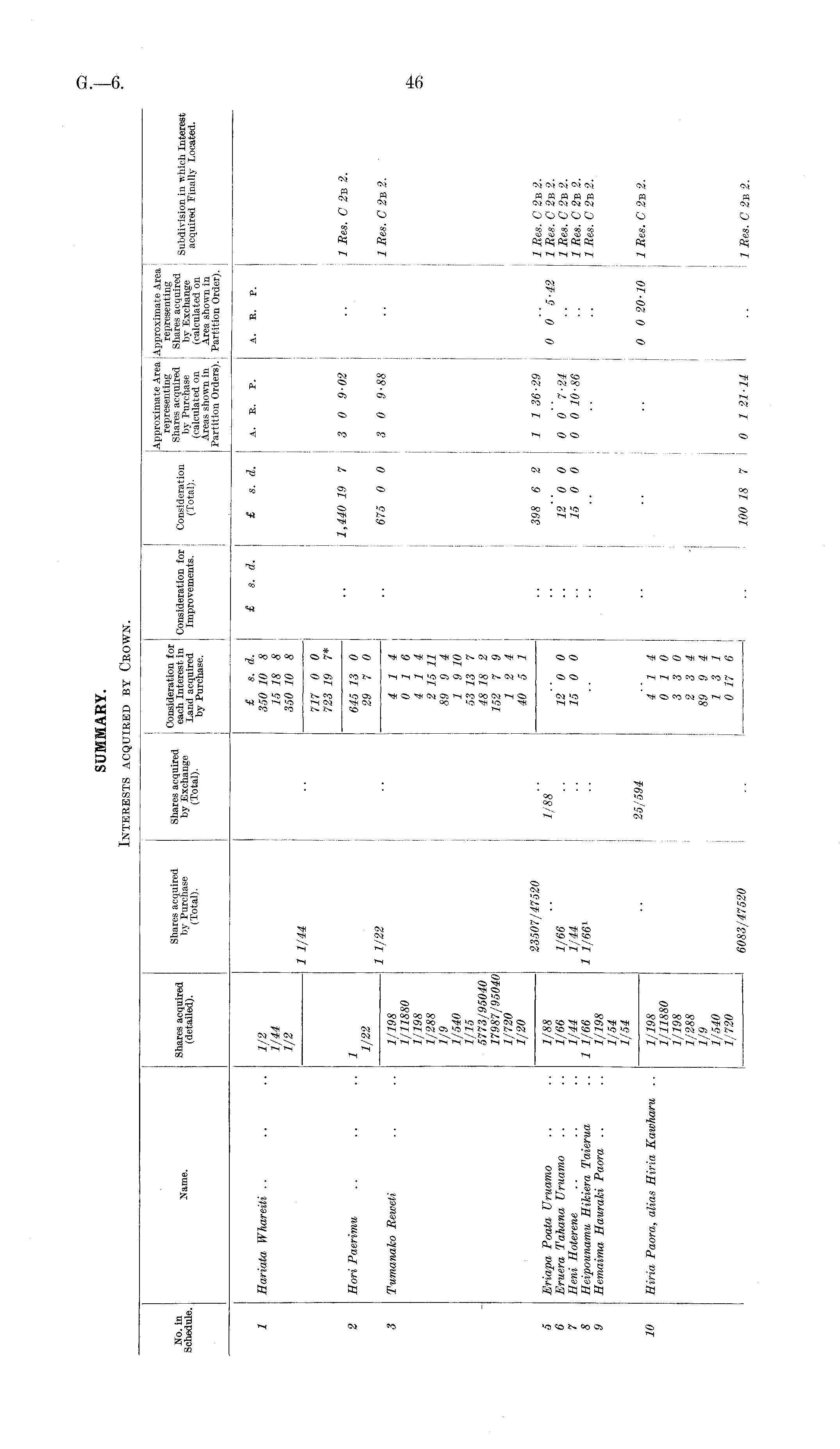 Approximate Area 'Approximate Area „ _ ronsidpration for representing representing No in JJ Shares acquired by Purchase' 1 each Interest in Consideration for Consideration 1 ' 1 Subdivision in which Interest Schedule. Name ' (detailed). "(StaT* In «™ ts - < Totel »' (Slc"on | > acquit Finally Located. ; Areas shown in ! Area shown in Partition Orders). Partition Order). ! £ s. d. £ $. d. , £ s. d. a. r. p. a. r. p. 1 Hariata Whareiti .. .. .. 1/2 350 10 8 1/44 15 18 8 1/2 350 10 8 1 1/44 .. 717 0 0 723 19 7* .. 1,440 19 7 3 0 9-02 \ .. 1 Res. C 2b 2. 2 Hori Paerimu .. .. 1 645 13 0 1/22 29 7 0 11/22 .. .. 675 0 0 3 0 9-88 j .. 1 Res. C 2b 2. 3 Tumanako Reweti .. .. 1/198 4 1 4 1/11880 0 16 1/198 4 14 1/288 2 15 11 1/9 89 9 4 1/540 1 9 10 1/15 53 13 7 5773/95040 48 18 2 17987/95040 152 7 9 1/720 12 4 1/20 40 5 1 23507/47520 .. .. 398 6 2 1 1 36-29 .. 1 Res. C 2b 2. 5 Eriapa Poata Uruamo .. .. 1/88 .. 1/88 .. .. ; .. .. 0 0 5-42 1 Res. C 2b 2. 6 Eruera Tahana Uruamo .. .. 1/66 1/66 .. 12 0 0 .. ! 12 0 0 0 0 7-24 .. 1 Res. C 2b 2. 7 Heni Hoterene .. .. .. 1/44 1/44 .. 15 0 0 .. 15 0 0 0 0 10-86 .. 1 Res. C 2b 2. 8 Heipounamu Hilciera Taierua .. 1 1/66 1 1/66 1 .. .. .. .. .. .. 1 Res. C 2b 2. 9 Hemaima Hauraki Paora .. ■. 1/198 1/54 1/54 •• 25/594 .. .. .. .. j o 0 20-10 { lRes.C2B2. 10 Hiria Paora, alias Hiria Kawharu .. 1/198 4 1 4 1/11880 0 10 1/198 3 3 0 1/288 2 3 4 •! 1/9 89 9 4 1/540 ! 13 1 1/720 \ 0 17 6 1 6083/47520 ' .. .. \ 100 18 7 0 1 21 14 I .. I 1 Res. C 2b 2.