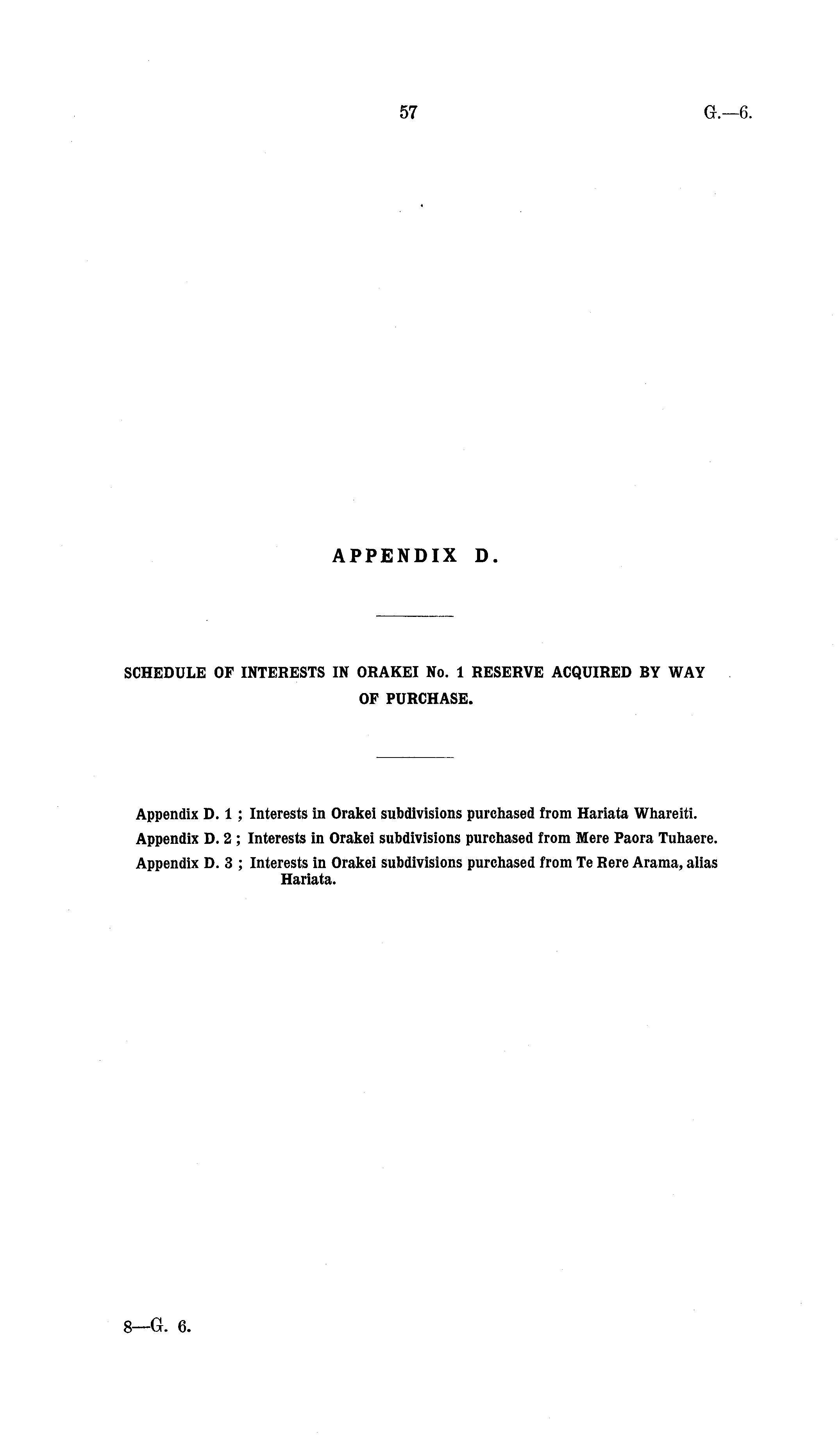 Appendix D. 1 ; Interests in Orakei subdivisions purchased from Hariata Whareiti. Appendix D. 2 ; Interests in Orakei subdivisions purchased from Mere Paora Tuhaere. Appendix D. 3 ; Interests in Orakei subdivisions purchased from Te Rere Arama, alias Hariata.