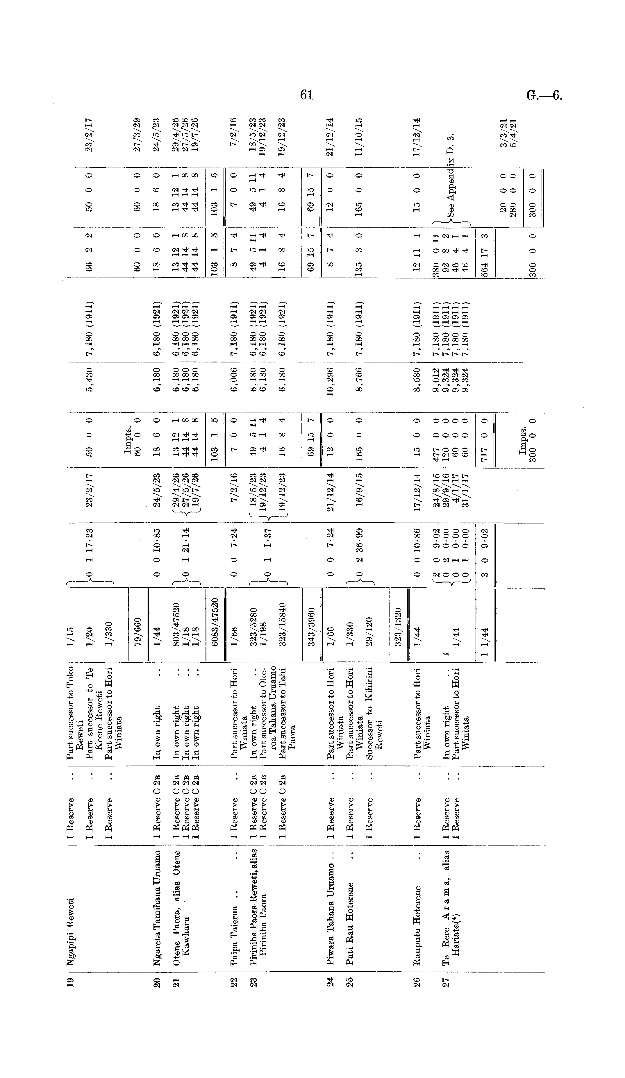 19 Ngapipi Reweti j 1 Reserve .. Part successor to Toko 1/15 Reweti 1 Reserve .. Part successor to Te 1/20 J>0 1 17-23 23/2/17 50 0 0 5,430 7,180 (1911) 66 2 2 50 0 0 23/2/17 Keene Reweti 1 Reserve .. Part successor to Hori 1 /330 Winiata — — Impts. 79/660 60 0 0 60 0 0 60 0 0 27/3/29 20 NgaretaTamihana Uruamo 1 Reserve C 2b In own right .. 1/44 0 0 10-85 24/5/23 18 6 0 6,180 6,180 (1921) 18 6 0 18 6 0 24/5/23 21 Otene Paora, alias Otene 1 Reserve C 2b In own right .. 803/47520 ] ("29/4/26 13 12 1 6,180 6,180 (1921) 13 12 1 13 12 1 29/4/26 Kawharu 1 Reserve C 2b In own right .. 1/18 ?<) 121-14 <[27/5/26 44 14 8 6,180 6,180 (1921) 44 14 8 44 14 8 27/5/26 1 Reserve C 2b In own right .. 1/18 J [19/7/26 44 14 8 6,180 6,180 (1921) 44 14 8 44 14 8 19/7/26 6083/47520 103 1 5 103 1 5 103 1 5 22 Paipa Taierua .. .. 1 Reserve .. Part successor to Hori 1/66 0 0 7-24 7/2/16 7 0 0 6,006 7,180 (1911) 8 7 4 7 0 0 7/2/16 Winiata 23 Piriniha Paora Reweti, alias 1 Reserve C 2b In own right .. 323/5280 f 18/5/23 49 5 11 6,180 6,180 (1921) 49 5 11 49 5 11 18/5/23 Piriniha Paora 1 Reserve C 2b Part successor to Oke- 1/198 , 1.07 J 19/12/23 4 1 4 6,180 6,180 (1921) 4 1 4 4 1 4 19/12/23 roa Tahana Uruamo f 1 1 Reserve C 2b Part successor to Tahi 323/15840 J [ 19/12/23 16 8 4 6,180 6,180 (1921) 16 8 4 16 8 4 19/12/23 Paora 343/3960 69 15 7 69 15 7 69 15 7 24 Piwara Tahana Uruamo .. 1 Reserve .. Part successor to Hori 1/66 0 0 7-24 21/12/14 12 0 0 10,296 7,180 (1911) 8 7 4 12 0 0 21/12/14 Winiata 25 Puti Rau Hoterene .. 1 Reserve .. Part successor to Hori 1/330 ] Winiata 2 36-99 16/9/15 165 0 0 8,766 7,180 (1911) 135 3 0 165 0 0 11/10/15 1 Reserve .. Successor to Kihirini 29/120 J Reweti 323/1320 26 Rauputu Hoterene .. 1 Reserve .. Part successor to Hori 1/44 0 0 10-86 17/12/14 15 0 0 8,580 7,180 (1911) 12 11 1 15 0 0 17/12/14 Winiata f2 0 9-02 24/8/15 477 0 0 9,012 7,180 (1911) 380 0 11 ~) 27 Te Rere A r a m a, alias 1 Reserve .. In own right ..1 J 0 2 0-00 29/9/16 120 0 0 9,324 7,180 (1911) 92 8 2 I 0 , H ' T) s Hariata( 4 ) 1 Reserve .. Part successor to Hori 1/44 ] 0 1 0-00 4/1/17 60 0 0 9,324 7,180(1911) 46 4 1 f oee A PP ena ix v. A. Winiata 1 0-00 31/1/17 60 0 0 9,324 7,180 (1911) 46 4 1 J 1 1/44 3 0 9-02 717 0 0 564 17 3 20 0 0 3/3/21 280 0 0 5/4/21 Impts. 300 0 0 300 0 0 300 0 0