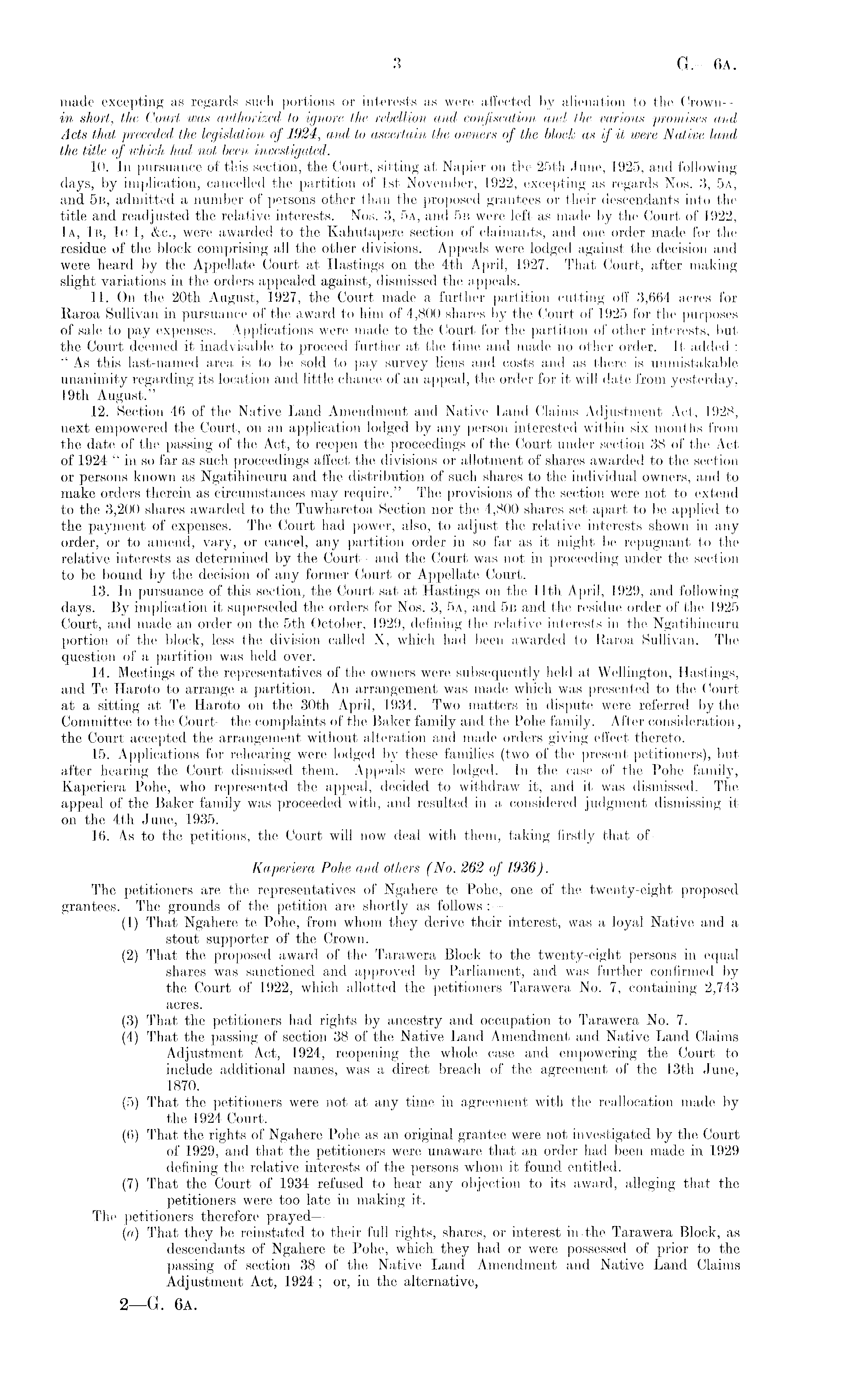 made excepting as regards such portions or interests as were affected by alienation to the Crown— in short, the Court was authorized to ignore the rebellion and confiscation and the various promises and Acts that preceded the legislation 0f1924, and to ascertain the owners of the block as if it were Native land the title of which had not been investigated. 10. In pursuance of this section, the Court, sitting at Napier on tbo 25th June, 1925, and following days, by implication, cancelled the partition of Ist November, 1922, excepting as regards Nos. 3, sa, and sn, admitted a number of persons other than the proposed grantees or their descendants into the title and readjusted the relative interests. Nos. 3, sa, and 5b were left as made by the Court of 1922, lα, Iβ, lo 1, &c, were awarded to the Kahutapere section of claimants, and one order made for the residue of the block comprising all the other divisions. Appeals were lodged against the decision and were heard by the Appellate Court at Hastings on the 4th April, 1927. That Court, after making slight variations in the orders appealed against, dismissed the appeals. 11. On the 20th August, 1927, the Court made a further partition cutting off 3,664 acres for Raroa Sullivan in pursuance of the award to him of 4,800 shares by the Court of 1925 for the purposes of sale to pay expenses. Applications were made to the Court for the partition of other interests, but the Court deemed it inadvisable to proceed farther at the time and made no other order. It added : " As this last-named area is to be sold to pay survey liens and costs and as there is unmistakable unanimity regarding its location and little chance of an appeal, the order for it will date from yesterday, 19th August." 12. Section 46 of the Native Land Amendment and Native; Land Claims Adjustment Act, 1928, next empowered the Court, on an application lodged by any person interested within six months from the date of the passing of the Act, to reopen the proceedings of the Court under section 38 of the Act of 1924 " in so far as such proceedings affect the divisions or allotment of shares awarded to the section or persons known as Ngatihineuru and the distribution of such shares to the individual owners, and to make orders therein as circumstances may require." The provisions of the section were not to extend to the 3,200 shares awarded to the Tuwharetoa Section nor the 4,800 shares set apart to be applied to the payment of expenses. The Court had power, also, to adjust the relative interests shown in any order, or to amend, vary, or cancel, any partition order in so far as it might be repugnant to the relative interests as determined by the Court—and the Court was not in proceeding under the section to be bound by the decision of any former Court or Appellate Court. 13. In pursuance of this section, the Court sat at Hastings on the 11th April, 1929, and following days. By implication it superseded the orders for Nos. 3, sa, and 5b and the residue order of the 1925 Court, and made an order on the sth October, 1929, defining the relative interests in the Ngatihineuru portion of the block, less the division called X, which had been awarded to Raroa Sullivan. Hie question of a partition was held over. 14. Meetings of the representatives of the owners were subsequently held at Wellington, Hastings, and Te Haroto to arrange a partition. An arrangement was made which was presented to the Court at a sitting at Te Haroto on the 30th April, 1934. Two matters in dispute were referred by the Committee to the Court—the complaints of the Baker family and the Pohe family. After consideration, the Court accepted the arrangement without alteration and made orders giving effect thereto. 15. Applications for rehearing were lodged by these families (two of the present petitioners), butafter hearing the Court dismissed them. Appeals were lodged. In the case of the Pohc family, Kaperiera Pohe, who represented the appeal, decided to withdraw it, and it was dismissed. The appeal of the Baker family was proceeded with, and resulted in a considered judgment dismissing it on the 4th June, 1935. 16. As to the petitions, the Court will now deal with them, taking firstly that of — Kaperiera Pohe and others (No. 262 of 1936). The petitioners are the representatives of Ngahere te Pohe, one of the twenty-eight proposed grantees. The grounds of the petition are shortly as follows : — (1) That Ngahere te Pohe, from whom they derive their interest, was a loyal Native and a stout supporter of the Crown. (2) That the proposed award of the Tarawera Block to the twenty-eight persons in equal shares was sanctioned and approved by Parliament, and was further confirmed by the Court of 1922, which allotted the petitioners Tarawera No. 7, containing 2,743 acres. (3) That the petitioners had rights by ancestry and occupation to Tarawera No. 7. (4) That the passing of section 38 of the Native Land Amendment and Native Land Claims Adjustment Act, 1924, reopening the whole case and empowering the Court to include additional names, was a direct breach of the agreement of the 13th June, 1870. (5) That the petitioners were not at any time in agreement with the reallocation made by the 1924 Court. (6) That the rights of Ngahere Pohe as an original grantee were not investigated by the Court of 1929, and that the petitioners were unaware that an order had been made in 1929 defining the relative interests of the persons whom it found entitled. (7) That the Court of 1934 refused to hear any objection to its award, alleging that the petitioners were too late in making it. The petitioners therefore prayed — (a) That they be reinstated to their full rights, shares, or interest in-the Tarawera Block, as descendants of Ngahere te Pohe, which they had or were possessed of prior to the passing of section 38 of the Native Land Amendment and Native Land Claims Adjustment Act, 1924; or, in the alternative,