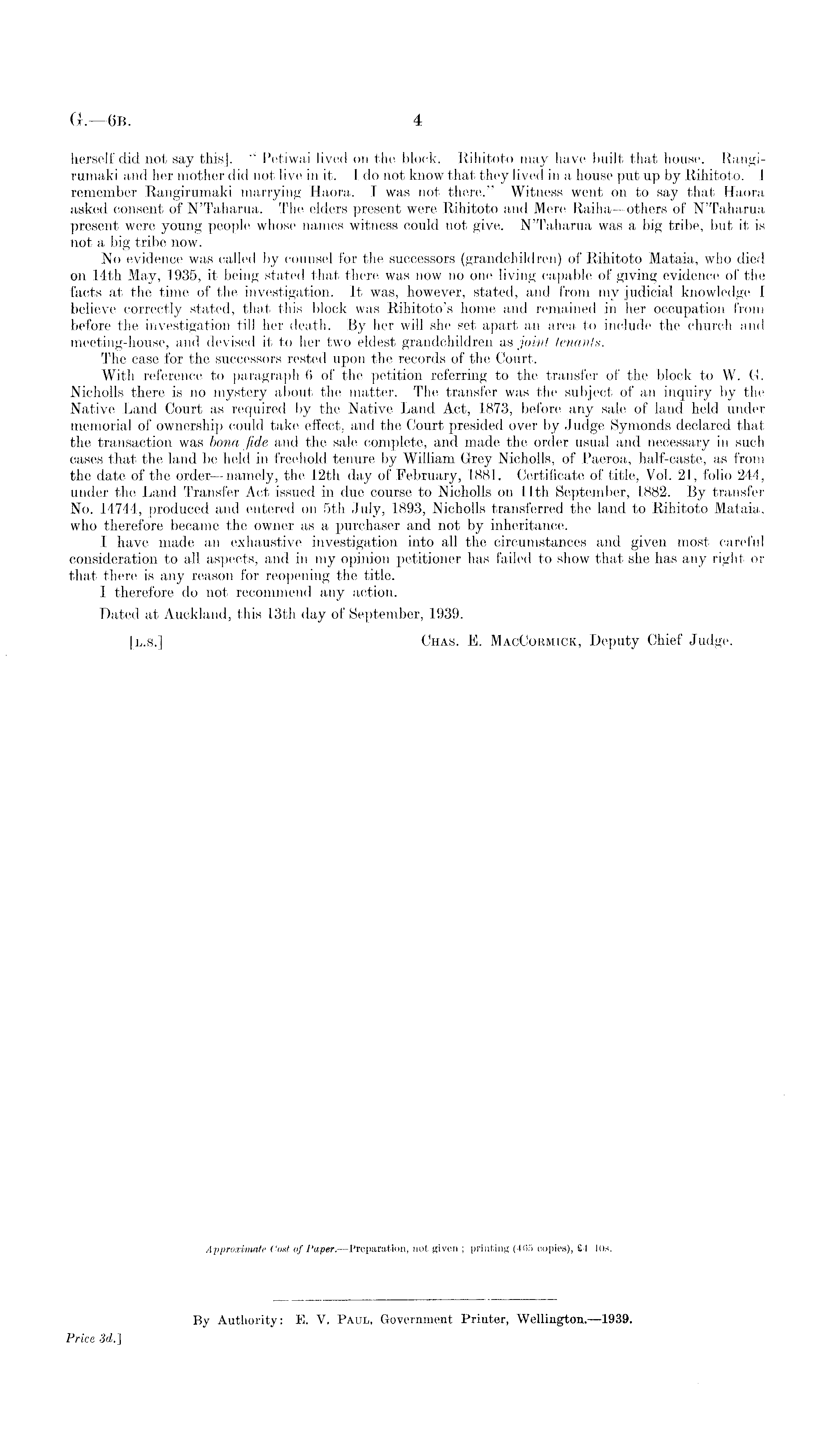 herself did not say this]. " Petiwai lived on the block. Rihitoto may have built that house. Rangirumaki and her mother did not live in it. Ido not know that they lived in a house put up by Rihitoto. I remember Rangirumaki marrying Haora. I was not there." Witness went on to say that Haora asked consent of N'Taharua. The elders present were Rihitoto and Mere Raiha—others of N'Taharua present were young people whose names witness could not give. N'Taharua was a big tribe, but it is not a big tribe now. No evidence was called by counsel for the successors (grandchildren) of Rihitoto Mataia, who died on 14th May, 1935, it being stated that there was now no one living capable of giving evidence of the facts at the time of the investigation. It was, however, stated, and from my judicial knowledge I believe correctly stated, that this block was Rihitoto's home and remained in her occupation from before the investigation till her death. By her will she set apart an area to include the church and meeting-house, and devised it to her two eldest grandchildren as joint tenants. The case for the successors rested upon the records of the Court. With reference to paragraph 6 of the petition referring to the transfer of the block to W. G. Nicholls there is no mystery about the matter. The transfer was the subject of an inquiry by the Native Land Court as required by the Native Land Act, 1873, before any sale of land held under memorial of ownership could take effect, and the Court presided over by Judge Symonds declared that the transaction was bona fide and the sale complete, and made the order usual and necessary in such cases that the land be held in freehold tenure by William Grey Nicholls, of Paeroa, half-caste, as from the date of the order—namely, the 12th day of February, 1881. Certificate of title, Vol. 21, folio 244, under the Land Transfer Act issued in due course to Nicholls on 11th September, 1882. By transfer No. 14744, produced and entered on sth July, 1893, Nicholls transferred the land to Rihitoto Mataia., who therefore became the owner as a purchaser and not by inheritance. I have made an exhaustive investigation into all the circumstances and given most careful consideration to all aspects, and in my opinion petitioner has failed to show that she has any right or that there is any reason for reopening the title. I therefore do not recommend any action. Dated at Auckland, this 13th day of September, 1939. [l.s.] Chas. E. MacCormick, Deputy Chief Judge.