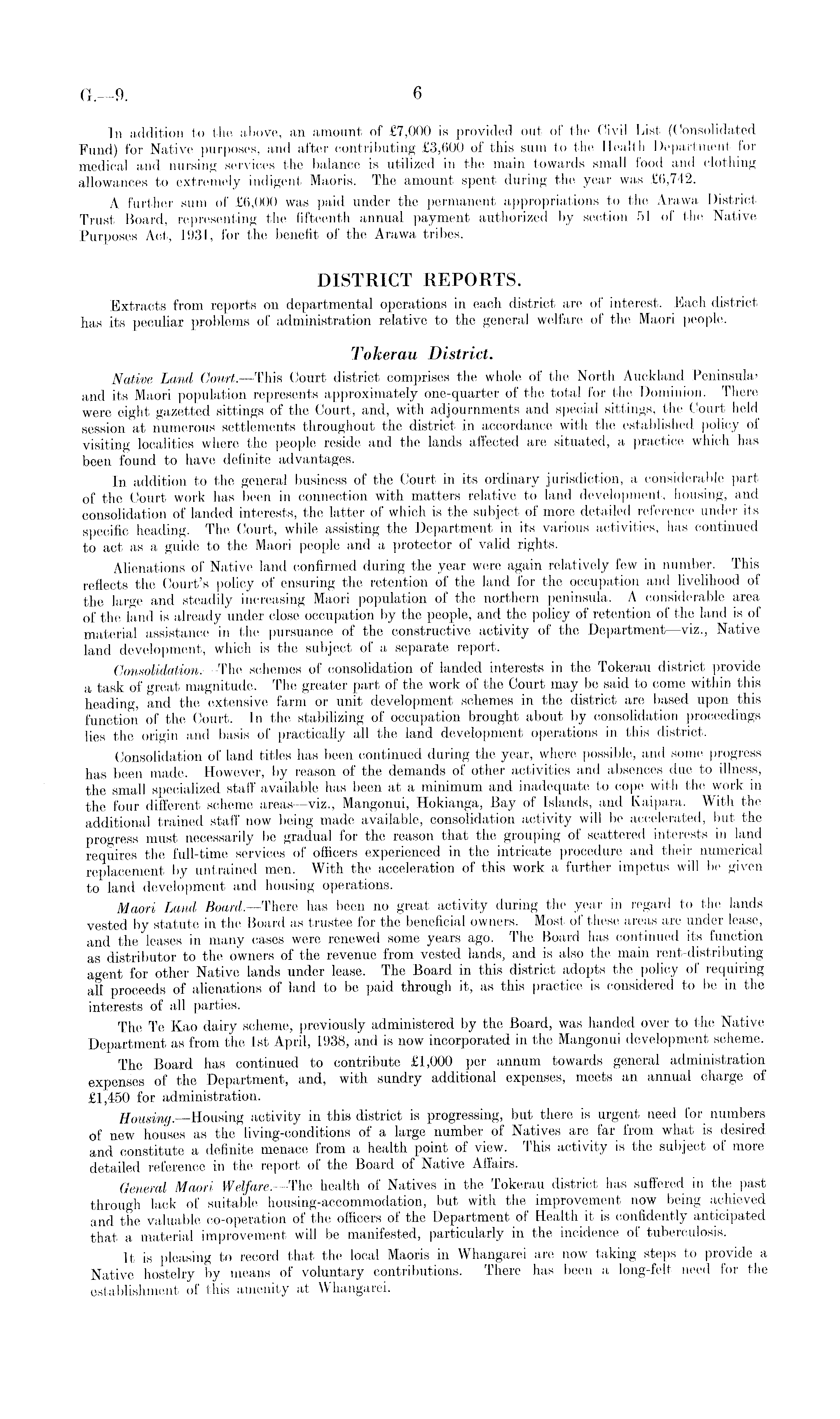 In addition to the above, an amount of £7,000 is provided out of the Civil List (Consolidated Fund) for Native purposes, and after contributing £3,600 of this sum to the Health Department for medical and nursing services the balance is utilized in the main towards small food and clothing allowances to extremely indigent Maoris. The amount spent during the year was £6,742. A further sum of £6,000 was paid under the permanent appropriations to the Arawa District Trust Board, representing the fifteenth annual payment authorized by section 51 of the Native Purposes Act, 1931, for the benefit of the Arawa tribes. DISTRICT REPORTS. Extracts from reports on departmental operations in each district are of interest. Each district has its peculiar problems of administration relative to the general welfare of the Maori people. Tokerau District. Native Land Court.■ —This Court district comprises the whole of the North Auckland Peninsulaand its Maori population represents approximately one-quarter of the total for the Dominion. There were eight gazetted sittings of the Court, and, with adjournments and special sittings, the Court held session at numerous settlements throughout the district in accordance with the established policy of visiting localities where the people reside and the lands affected are situated, a practice which has been found to have definite advantages. In addition to the general business of the Court in its ordinary jurisdiction, a considerable part of the Court work has been in connection with matters relative to land development, housing, and consolidation of landed interests, the latter of which is the subject of more detailed reference under its specific heading. The Court, while assisting the Department in its various activities, has continued to act as a guide to the Maori people and a protector of valid rights. Alienations of Native land confirmed during the year were again relatively few in number. This reflects the Court's policy of ensuring the retention of the land for the occupation and livelihood of the large and steadily increasing Maori population of the northern peninsula. A considerable area of the land is already under close occupation by the people, and the policy of retention of the land is of material assistance in the pursuance, of the constructive activity of the Department —viz., Native land development, which is the subject of a separate report. Consolidation. —The schemes of consolidation of landed interests in the Tokerau district provide a task of great magnitude. The greater part of the work of the Court may be said to come within this heading, and the extensive farm or unit development schemes in the district are based upon this function' of the Court. In the stabilizing of occupation brought about by consolidation proceedings lies the origin and basis of practically all the land development operations in this district. Consolidation of land titles has been continued during the year, where possible, and some progress has been made. However, by reason of the demands of other activities and absences due to illness, the small specialized staff available has been at a minimum and inadequate to cope with the work in the four different scheme areas —viz., Mangonui, Hokianga, Bay of Islands, and Kaipara. With the additional trained staff now being made available, consolidation activity will be accelerated, but the progress must necessarily be gradual for the reason that the grouping of scattered interests in land requires the full-time services of officers experienced in the intricate procedure and their numerical replacement by untrained men. With the acceleration of this work a further impetus will be given to land development and housing operations. Maori Land Board. —There has been no great activity during the year in regard to the lands vested by statute in the Board as trustee for the beneficial owners. Most of these areas are under lease, and the leases in many cases were renewed some years ago. The Board has continued its function as distributor to the owners of the revenue from vested lands, and is also the main rent-distributing agent for other Native lands under lease. The Board in this district adopts the policy of requiring all proceeds of alienations of land to be paid through it, as this practice is considered to be in the interests of all parties. The Te Kao dairy scheme, previously administered by the Board, was handed over to the Native Department as from the Ist April, 1938, and is now incorporated in the Mangonui development scheme. The Board has continued to contribute £1,000 per annum towards general administration expenses of the Department, and, with sundry additional expenses, meets an annual charge of £1,450 for administration. Housing.—Housing activity in this district is progressing, but there is urgent need, for numbers of new houses as the living-conditions of a large number of Natives are far from what is desired and constitute a definite menace from a health point of view. This activity is the subject of more detailed reference in the report of the Board of Native Affairs. General Maori Welfare.— The health of Natives in the Tokerau district has suffered in the past through lack of suitable housing-accommodation, but with the improvement now being achieved and the valuable co-operation of the officers of the Department of Health it is confidently anticipated that a material improvement will be manifested, particularly in the incidence of tuberculosis. It is pleasing to record that the local Maoris in Whangarei are now taking steps to provide a Native hostelry by means of voluntary contributions. There has been a long-felt need for the establishment of this amenity at Whangarei.