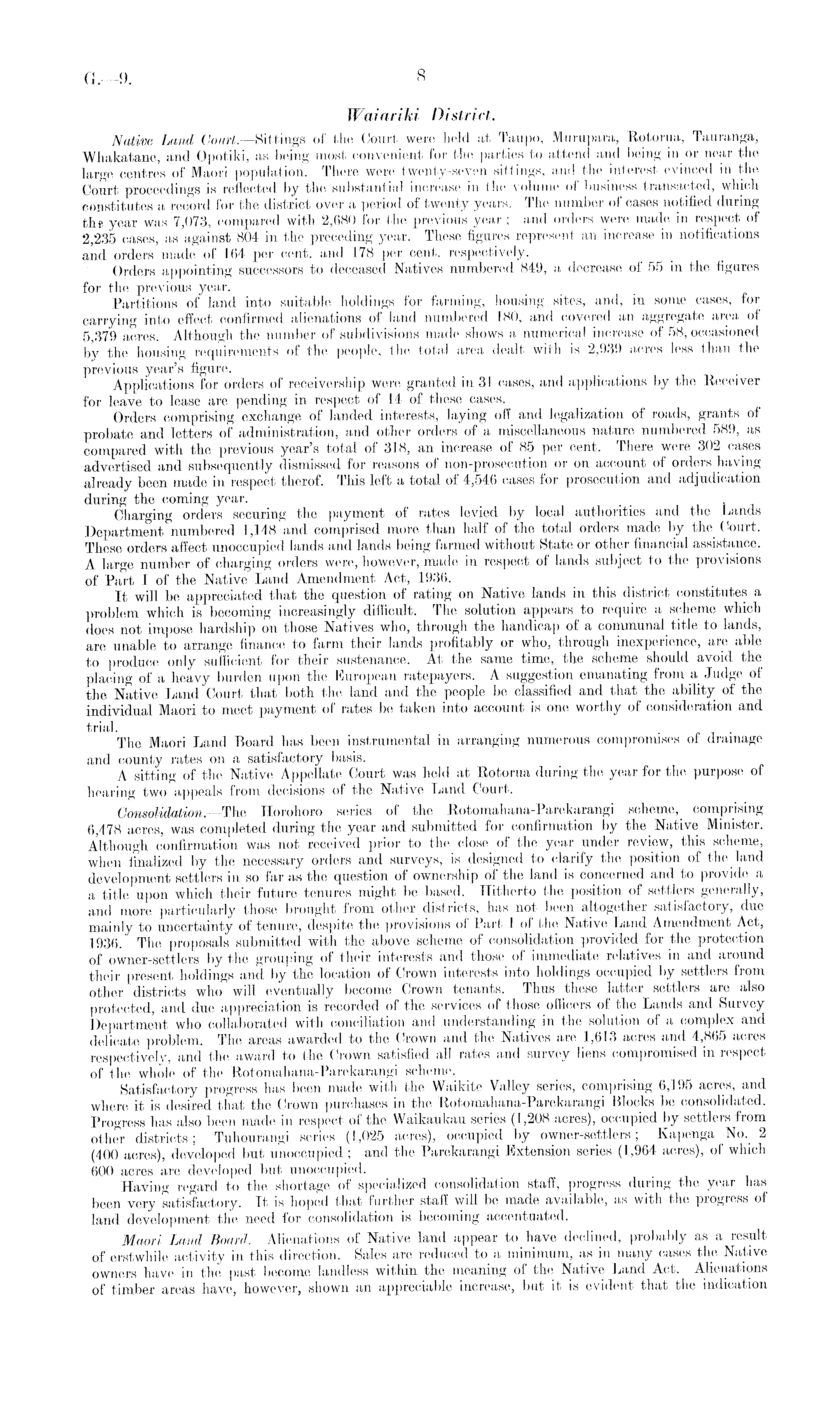 Waiariki District. Native Land Covrt.—Sittings of the Court, were held at Taupo, Murupara, Rotorua, Tauranga, Whakatane, and Opotiki, as being most convenient for the parties to attend and being in or near the large centres of Maori population. There were twenty-seven sittings, and the interest evinced in the Court proceedings is reflected by the substantial increase in the volume of business transacted, which constitutes a record for the district over a period of twenty years. The number of cases notified during the year was 7,073, compared with 2,680 for the previous year; and orders were made in respect of 2,235 cases, as against 804 in the preceding year. These figures represent an increase in notifications and orders made of 164 per cent, and 178 per cent, respectively. Orders appointing successors to deceased Natives numbered 849, a decrease of 55 in the figures for the previous year. Partitions of land into suitable holdings for farming, housing sites, and, in some cases, for carrying into effect confirmed alienations of land numbered 180, and covered an aggregate area of 5,379 acres. Although the number of subdivisions made shows a numerical increase of 58, occasioned by the housing requirements of the people, the total area dealt with is 2,939 acres less than the previous year's figure. Applications for orders of receivership were granted in 31 cases, and applications by the Receiver for leave to lease are pending in respect of 14 of these cases. Orders comprising exchange of landed interests, laying off and legalization of roads, grants of probate and letters of administration, and other orders of a miscellaneous nature numbered 589, as compared with the previous year's total of 318, an increase of 85 per cent. There were 302 cases advertised and subsequently dismissed for reasons of non-prosecution or on account of orders having already been made in respect therof. This left a total of 4,546 cases for prosecution and adjudication during the coming year. Charging orders securing the payment of rates levied by local authorities and the Lands Department numbered 1,148 and comprised more than half of the total orders made by the Court. These orders affect unoccupied lands and lands being farmed without State or other financial assistance. A large number of charging orders were, however, made in respect of lands subject to the provisions of Part I of the Native Land Amendment Act, 1936. It will be appreciated that the question of rating on Native lands in this district constitutes a problem which is becoming increasingly difficult. The solution appears to require a scheme which does not impose hardship on those Natives who, through the handicap of a communal title to lands, are unable to arrange finance to farm their lands profitably or who, through inexperience, are able to produce only sufficient for their sustenance. At the same time, the scheme should avoid the placing of a heavy burden upon the European ratepayers. A suggestion emanating from a Judge of the Native Land Court that both the land and the people be classified and that the ability of the individual Maori to meet payment of rates be taken into account is one worthy of consideration and trial. , The Maori Land Board has been instrumental in arranging numerous compromises of drainage and county rates on a satisfactory basis. A sitting of the Native Appellate Court was held at Rotorua during the year for the purpose of hearing two appeals from decisions of the Native Land Court. Consolidation. —The Horohoro series of the Rotomahana-Parekarangi scheme, comprising 6,478 acres, was completed during the year and submitted for confirmation by the Native Minister. Although confirmation was not received prior to the close of the year under review, this scheme, when finalized by the necessary orders and surveys, is designed to clarify the position of the land development settlers in so far as the question of ownership of the land is concerned and to provide a a title upon which their future tenures might be based. Hitherto the position of settlers generally, and more particularly those brought from other districts, has not been altogether satisfactory, due mainly to uncertainty of tenure, despite the provisions of Part 1 of the Native Land Amendment Act, 1936. The proposals submitted with the above scheme of consolidation provided for the protection of owner-settlers by the grouping of their interests and those of immediate relatives in and around their present holdings and by the location of Crown interests into holdings occupied by settlers from other districts who will eventually become Crown tenants. Thus these latter settlers are also protected, and due appreciation is recorded of the services of those officers of the Lands and Survey Department who collaborated with conciliation and understanding in the solution of a complex and delicate problem. The areas awarded to the Crown and the Natives are 1,613 acres and 4,865 acres respectively, and the award to the Crown satisfied all rates and survey liens compromised in respect of the whole of the Rotomahana-Parekarangi scheme. Satisfactory progress has been made with the Waikite Valley series, comprising 6,195 acres, and where it is desired that the Crown purchases in the Rotomahana-Parekarangi Blocks be consolidated. Progress has also been made in respect of the Waikaukau series (1,208 acres), occupied by settlers from other districts; Tuhourangi series (1,025 acres), occupied by owner-settlers; Kapenga No. 2 (400 acres), developed but unoccupied ; and the Parekarangi Extension series (1,964 acres), of which 600 acres are developed but unoccupied. Having regard to the shortage of specialized consolidation staff, progress during the year has been very satisfactory. It is hoped that further staff will be made available, as with the progress of land development the need for consolidation is becoming accentuated. Maori Land Board.- Alienations of Native land appear to have 