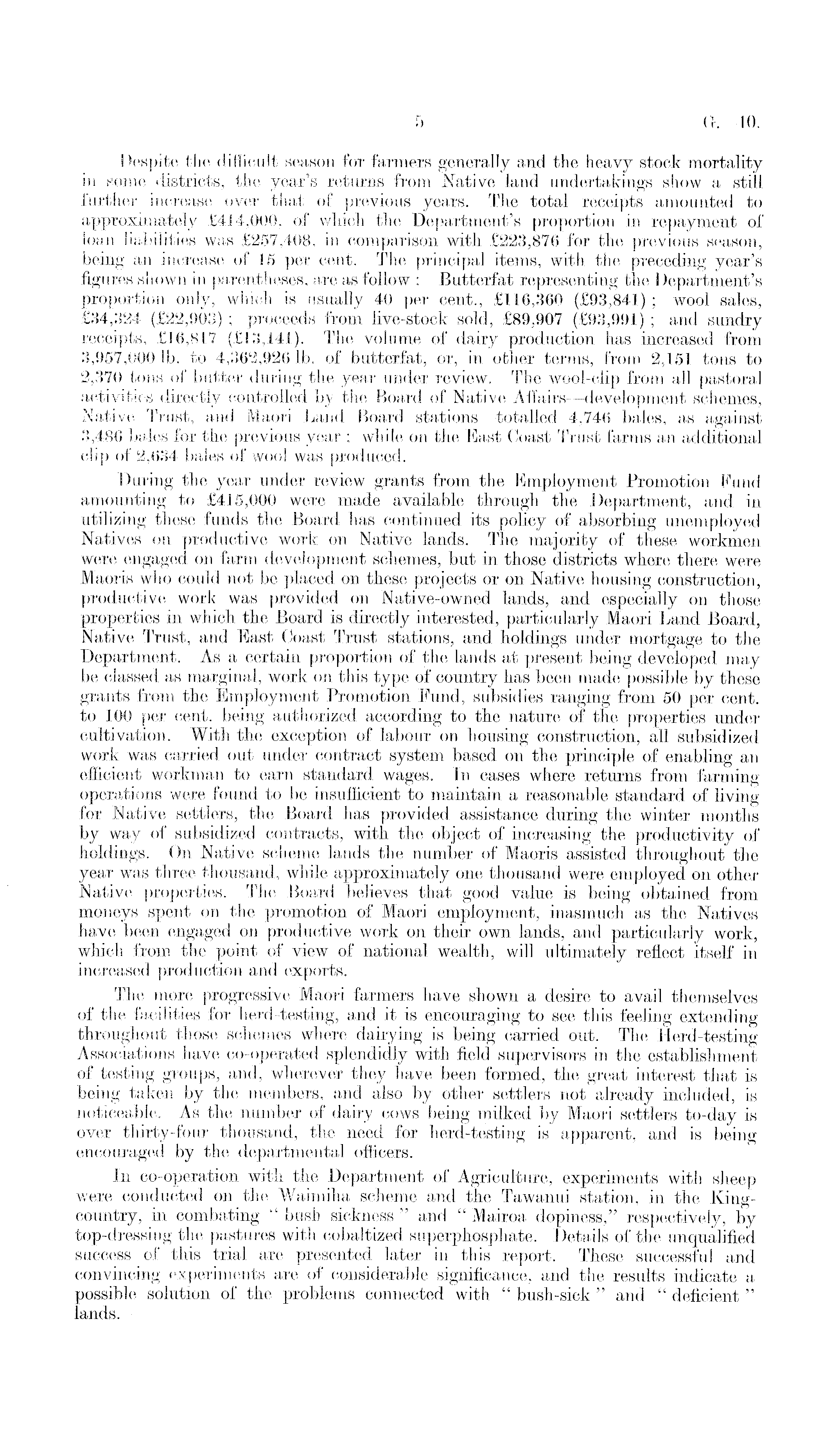 Despite the difficult season for farmers generally and the heavy stock mortality in some districts, the year's returns from Native land undertakings show a still further increase over that of previous years. The total receipts amounted to approximately £414,000, of which the Department's proportion in repayment of loan liabilities was £257,408, in comparison with £223,876 for the previous season, being an increase of 15 per cent. The principal items, with the preceding year's figures shown in parentheses, are as follow : Butterfat representing the Department's proportion only, which is usually 40 per cent., £116,360 (£93,841) ; wool sales, £34,324 (£22,903); proceeds from live-stock sold, £89,907 (£93,991); and sundry receipts, £16,817 (£13,141). The volume of dairy production has increased from 3,957,000 lb. to 4,362,926 lb. of butterfat, or, in other terms, from 2,151 tons to 2,370 tons of butter during the year under review. The wool-clip from all pastoral activities directly controlled by the Board of Native Affairs—development schemes, Native Trust, and Maori Land Board stations—totalled 4,746 bales, as against 3,486 bales for the previous year ; while on the East Coast Trust farms an additional clip of 2,634 bales of wool was produced. During the year under review grants from the Employment Promotion Fund amounting to £415,000 were made available through the Department, and in utilizing these funds the Board has continued its policy of absorbing unemployed Natives on productive work on Native lands. The majority of these workmen were engaged on farm, development schemes, but in those districts where there were Maoris who could not be placed on these projects or on Native housing construction, productive work was provided on Native-owned lands, and especially on those properties in which the Board is directly interested, particularly Maori Land Board, Native Trust, and East Coast Trust stations, and holdings under mortgage to the Department. As a certain proportion of the lands at present being developed may be classed as marginal, work on this type of country has been made possible by these grants from the Employment Promotion Fund, subsidies ranging from 50 per cent, to 100 per cent, being authorized according to the nature of the properties under cultivation. With the exception of labour on housing construction, all subsidized work was carried out under contract system based on the principle of enabling an efficient workman to earn standard wages. In cases where returns from farming operations were found to be insufficient to maintain a reasonable standard of living for Native settlers, the Board has provided assistance during the winter months by way of subsidized contracts, with the object of increasing the productivity of holdings. On Native scheme lands the number of Maoris assisted throughout the year was three thousand, while approximately one thousand were employed on other Native properties. The Board believes that good value is being obtained from moneys spent on the promotion of Maori employment, inasmuch as the Natives have been engaged on productive work on their own lands, and particularly work, which from the point of view of national wealth, will ultimately reflect itself in increased production and exports. The more progressive Maori farmers have shown a desire to avail themselves of the facilities for herd-testing, and it is encouraging to see this feeling extending throughout those schemes where dairying is being carried out. The Herd-testing Associations have co-operated splendidly with field supervisors in the establishment of testing groups, and, wherever they have been formed, the great interest that is being taken by the members, and also by other settlers not already included, is noticeable. As the number of dairy cows being milked by Maori settlers to-day is over thirty-four thousand, the need for herd-testing is apparent, and is being encouraged by the departmental officers. In co-operation with the Department of Agriculture, experiments with sheep were conducted on the Waimiha scheme and the Tawanui station, in the Kingcountry, in combating " bush sickness " and " Mairoa dopiness," respectively, by top-dressing the pastures with cobaltized superphosphate. Details of the unqualified success of this trial are presented later in this report. These successful and convincing experiments are of considerable significance, and the results indicate a possible solution of the problems connected with " bush-sick " and " deficient " lands.