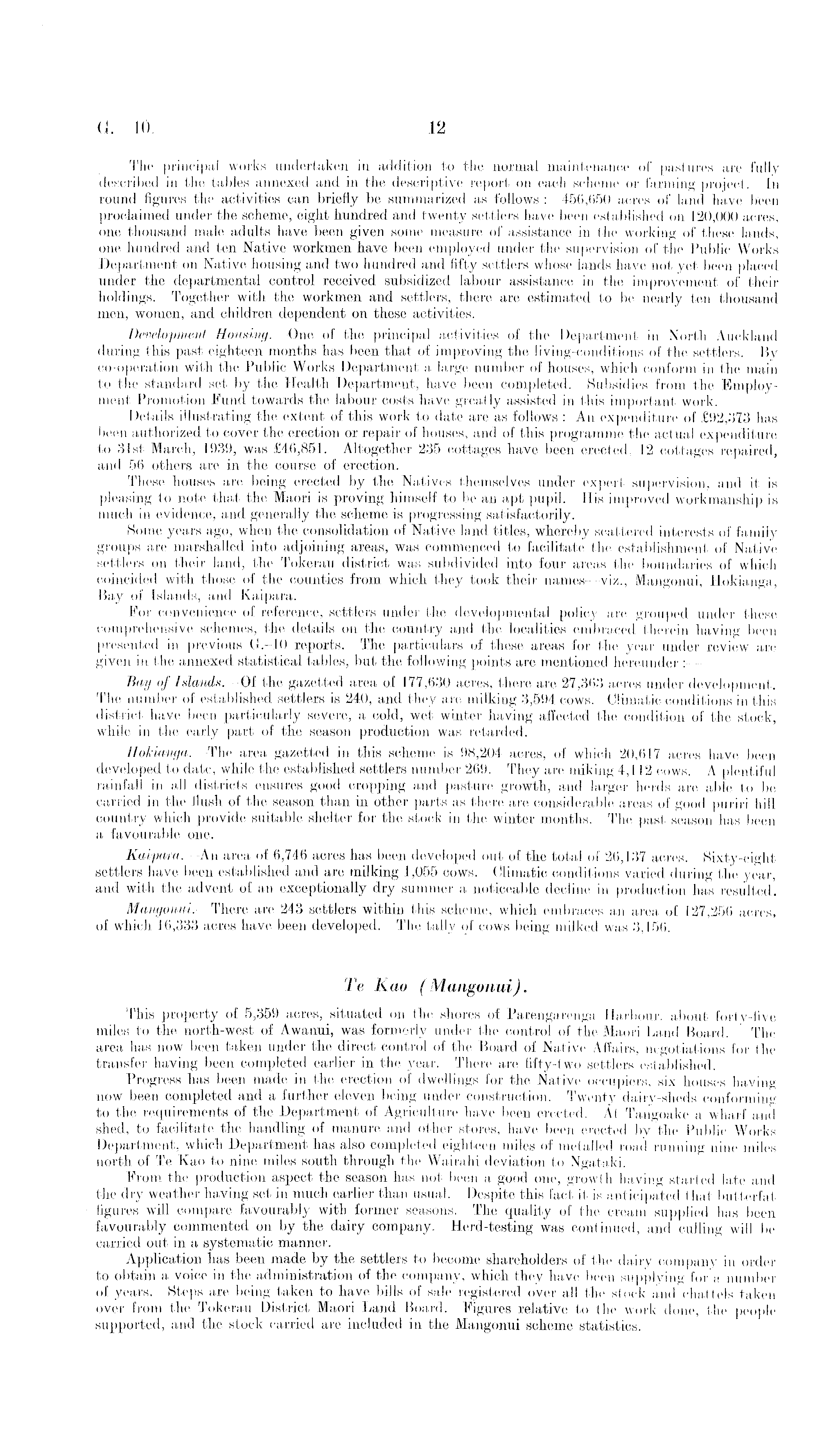 The principal works undertaken in addition to the normal maintenance of pastures are fully described in the tables annexed and in the descriptive report on each scheme or farming project. In round figures the activities can briefly be summarized as follows : 456,650 acres of land have b'een proclaimed under the scheme, eight hundred and twenty settlers have been established on 120,000 acres, one thousand male adults have been given some measure of assistance in the working of these lands, one hundred and ten Native workmen have been employed under the supervision of the Public Works Department on Native housing and two hundred and fifty settlers whose lands have not yet been placed under the departmental control received subsidized labour assistance in the improvement of their holdings. Together with the workmen and settlers, there are estimated to be nearly ten thousand men, women, and children dependent on these activities. Development Housing.—One of the principal activities of the Department in North Auckland during this past eighteen months has been that of improving the living-conditions of the settlers. By co-operation with the Public Works Department a large number of houses, which conform in the main to the standard set by the Health Department, have been completed. Subsidies from the Employment Promotion Fund towards the labour costs have greatly assisted in this important work. Details illustrating the extent of this work to date are as follows : An expenditure of £92,373 has been authorized to cover the erection or repair of houses, and of this programme the actual expenditure to 31st March, 1939, was £46,851. Altogether 235 cottages have been erected, 12 cottages repaired, and 56 others are in the course of erection. These houses are being erected by the Natives themselves under expert supervision, and it is pleasing to note that the Maori is proving himself to be an apt pupil. His improved workmanship is much in evidence, and generally the scheme is progressing satisfactorily. Some years ago, when the consolidation of Native land titles, whereby scattered interests of family groups are marshalled into adjoining areas, was commenced to facilitate the establishment of Native settlers on their land, the Tokerau district was subdivided into four areas the boundaries of which coincided with those of the counties from which they took their names —viz., Mangonui, Hokianga, Bay of Islands, and Kaipara. For convenience of reference, settlers under the developmental policy are grouped under these comprehensive schemes, the details on the country and the localities embraced therein having been presented in previous G.-10 reports. The particular's of these areas for the year under review arc given in the annexed statistical tables, but the following points are mentioned hereunder :— Bay of Islands. —Of the gazetted area of 177,630 acres, there are 27,363 acres under development. The number of established settlers is 240, and they are milking 3,594 cows. Climatic conditions in this district have been particularly severe, a cold, wet winter having affected the condition of the stock, while in the early part of the season production was retarded. Hokianga. —The area gazetted in this scheme is 98,204 acres, of which 20,617 acres have been developed to date, while the established settlers number 269. They are miking 4,112 cows. A plentiful rainfall in all districts ensures good cropping and pasture growth, and larger herds are able to be carried in the flush of the season than in other parts as there are considerable areas of good puriri hill country which provide suitable shelter for the stock in the winter months. The past season has been a favourable one. Kaipara.—An area of 6,746 acres has been developed out of the total of 26,137 acres. Sixty-eight settlers have been established and are milking 1,055 cows. Climatic conditions varied during the year, and with the advent of an exceptionally dry summer a noticeable decline in production has resulted. Mangonui.--There are 243 settlers within this scheme, which embraces an area of 127,256 acres, of which 16,333 acres have been developed. The tally of cows being milked was 3,156. Te Kao (Mangonui). This property of 5,359 acres, situated on the shores of Parengarenga Harbour, about forty-five miles to the north-west of Awanui, was formerly under the control of the Maori Land Board. The area has now been taken under the direct control of the Board of Native Affairs, negotiations for the transfer having been completed earlier in the year. There are fifty-two settlers established. Progress has been made in the erection of dwellings for the Native occupiers, six houses having now been completed and a further eleven being under construction. Twenty dairy-sheds conforming to the requirements of the Department of Agriculture have been erected. At Tangoake a wharf and shed, to facilitate the handling of manure and other stores, have been erected by the Public Works Department, which Department has also completed eighteen miles of metalled road running nine miles north of Te Kao to nine miles south through the Wairahi deviation to Ngataki. From the production aspect the season has not been a good one, growth having started late and the dry weather having set in much earlier than usual. Despite this fact it is anticipated that butterfat figures will compare favourably with former seasons. The quality of the cream supplied has been favourably commented on by the dairy company. Herd-testing was continued, and culling will be carried out in a systematic manner. Application has been made by the settlers to become shareholders of the dairy company in order to obtain a voice in the administration of the company, which they have been supplying for a number of years. Steps are being taken to have bills of sale registered over all the stock and chattels taken over from the Tokerau District Maori Land Board. Figures relative to the work done, the p
