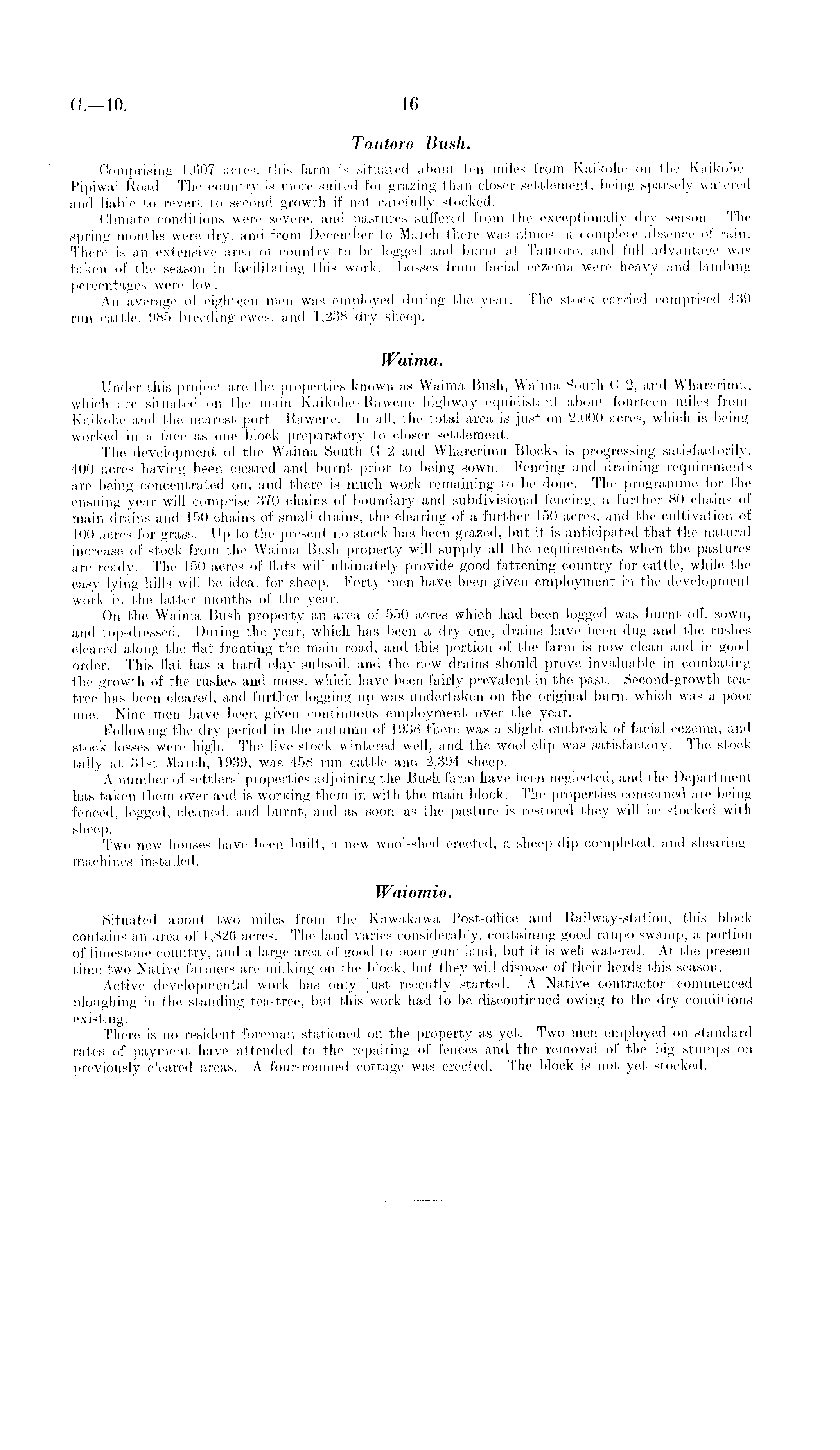Tautoro Bush. Comprising 1,607 acres, this farm is situated about ten miles from Kaikohe on the KaikohePipiwai Road. The country is more suited for grazing than closer settlement, being sparsely watered and liable to revert to second growth if not carefully stocked. Climate conditions were severe, and pastures suffered from the exceptionally dry season. The spring months were dry, and from December to March there was almost a complete absence of rain. There is an extensive area of country to be logged and burnt at Tautoro, and full advantage was taken of the season in facilitating this work. Losses from facial eczema were heavy and lambing percentages were low. An average of eighteen men was employed during the year. The stock carried comprised 439 run cattle, 985 breeding-ewes, and 1,238 dry sheep. Waima. Under this project are the properties known as Waima Bush, Waima South G 2, and Wharerimu, which are situated on the main Kaikohe--Rawene highway equidistant about fourteen miles from Kaikohe and the nearest port —Rawene. In all, the total area is just on 2,000 acres, which is being worked in a face as one block preparatory to closer settlement. The development of the Waima South G 2 and Wharerimu Blocks is progressing satisfactorily, 400 acres having been cleared and burnt prior to being sown. Fencing and draining requirements are being concentrated on, and there is much work remaining to be done. The programme for the ensuing year will comprise 370 chains of boundary and subdivisional fencing, a further 80 chains of main drains and 150 chains of small drains, the clearing of a further 150 acres, and the cultivation of 100 acres for grass. Up to the present no stock has been grazed, but it is anticipated that the natural increase of stock from the Waima Bush property will supply all the requirements when the pastures are ready. The 150 acres of flats will ultimately provide good fattening country for cattle, while the easy lying hills will be ideal for sheep. Forty men have been given employment in the development work in the latter months of the year. On the Waima Bush property an area of 550 acres which had been logged was burnt off, sown, and top-dressed. During the year, which has been a dry one, drains have been dug and the rushes cleared along the flat fronting the main road, and this portion of the farm is now clean and in good order. This flat has a hard clay subsoil, and the new drains should prove invaluable in combating the growth of the rushes and moss, which have been fairly prevalent in the past. Second-growth teatree has been cleared, and further logging up was undertaken on the original burn, which was a poor one, Nine men have been given continuous employment over the year. Following the dry period in the autumn of 1938 there was a slight outbreak of facial eczema, and stock losses were high. The live-stock wintered well, and the wool-clip was satisfactory. The stock tally at 31st March, 1939, was 458 run cattle and 2,394 sheep. A number of settlers' properties adjoining the Bush farm have been neglected, and the Department has taken them over and is working them in with the main block. The properties concerned are being fenced, logged, cleaned, and burnt, and as soon as the pasture is restored they will be stocked with sheep. Two new houses have been built, a new wool-shed erected, a sheep-dip completed, and shearingmachines installed. Waiomio. Situated, about two miles from the Kawakawa Post-office and Railway-station, this block contains an area of 1,826 acres. The laud varies considerably, containing good raupo swamp, a portion of limestone country, and a large area of good to poor gum land, but it is well watered. At the present time two Native farmers are milking on the block, but they will dispose of their herds this season. Active developmental work has only just recently started. A Native contractor commenced ploughing in the standing tea-tree, but this work had to be discontinued owing to the dry conditions existing. There is no resident foreman stationed on the property as yet. Two men employed on standard rates of payment have attended to the repairing of fences and the removal of the big stumps on previously cleared areas. A four-roomed cottage was erected. The block is not yet stocked.