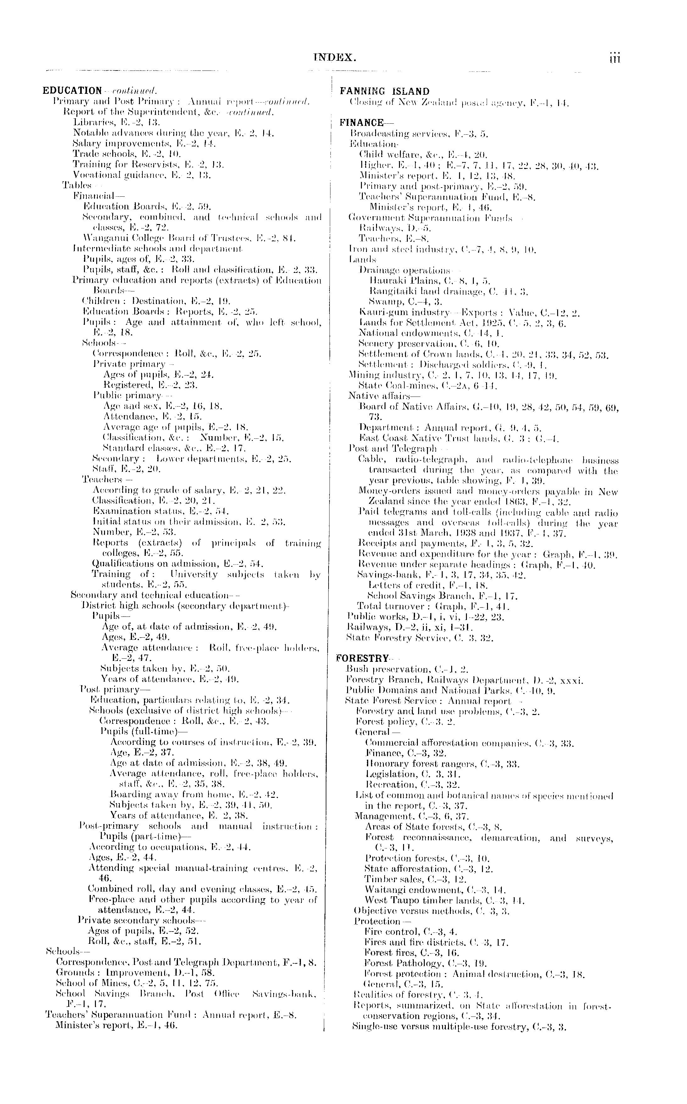 FANNING ISLAND— Closing of New Zealand postal agency, F.-l, 14. I , FINANCE — Broadcasting services, F.-3, 5. Education- — Child welfare, &c., E.-4, 20. Higher, E.-l, 40; E.-7, 7, 11, 17, 22, 28, 30, 40, 43. Minister's report, E.-l, 12, 13, 48. Primary and post-primary, E.-2, 59. Teachers' Superannuation Fund, E.-8. Minister's report, E.-l, 46. Government Superannuation Funds— Railways, D.-5. Teachers, E.-8. Iron and steel industry, C.-7, 4, 8, 9, 10. Lands — Drainage operations— Hauraki. Plains, C.-8, 1, 5. Rangitaiki land drainage, C.-11, 3. Swamp, C.-4, 3. Kauri-gum industry—Exports : Value, C.-12, 2. Lands for Settlement Act, 1925, C.-5, 2, 3, 6. National endowments, C.-14, 1. Scenery preservation, C.-6, 10. Settlement of Crown lands, C.-l, 20, 21, 33, 34, 52, 53. Settlement: Discharged soldiers, C.-9, I. Mining industry, C.-2, 1, 7, 10, 13, 14, 17, 19. State Coal-mines, C.-2a, 6-14. Native affairs— Board of Native Affairs, G.-10, 19, 28, 42, 50, 54, 59, 69, 73. Department : Annual report, G.-9, 4, 5. East Coast Native Trust lands, G.-3 ; G.-4. Post and Telegraph— Cable, radio-telegraph, and radio-telephone business transacted during the year, as compared with the year previous, table showing, F.-l, 39. Money-orders issued and money-orders payable in New Zealand since the year ended 1863, F.-l, 32. Paid telegrams and toll-calls (including cablo and radio messages and overseas toll-calls) during the year ended 31st March, 1938 and 1937, F.-l, 37. Receipts and payments, F.-l, 3, 5, 32. Revenue and expenditure for the year : Graph, F.-l, 39. Revenue under separate headings : Graph, F.-l, 40. Savings-bank, F.-l, 3, 17, 34, 35, 42. Letters of credit, F.-l, 18. School Savings Branch, F.-l, 17. Total turnover : Graph, F.-l, 41. Public works, D.-l, i, vi, 1-22, 23. Railways, D.-2, ii, xi, 1-31. State Forestry Service, C.-3, 32. FORESTRY— Bush preservation, C.-l, 2. Forestry Branch, Railways Department, D.-2, xxxi. Public Domains and National Parks, C.-10, 9. State Forest Service : Annual report— Forestry and land use problems, C.-3, 2. Forest policy, C.-3, 2. General— Commercial afforestation companies, C.-3, 33. Finance, C.-3, 32. Honorary forest rangers, C.-3, 33. Legislation, C.-3, 31. Recreation, C.-3, 32. List of common and botanical names of species mentioned in the report, C.-3, 37. Management, C.-3, 6, 37. Areas of State forests, C.-3, 8. Forest reconnaissance, demarcation, and surveys, C.-3, 11. Protection forests, C.-3, 10. State afforestation, C.-3, 12. Timber sales, C.-3, 12. Waitangi endowment, C.-3, 14. West Taupo timber lands, C.-3, 14. Objective versus methods, C.-3, 3. Protection— Fire control, C.-3, 4. Fires and fire districts, C.-3, 17. Forest fires, C.-3, 16. Forest Pathology, C.-3, 19. Forest protection : Animal destruction, C.-3, 18. General, C.-3, 15. Realities of forestry, C.-3, 4. Reports, summarized, on State afforestation in forestconservation regions, C.-3, 34. Single-use versus multiple-use forestry, C.-3, 3.