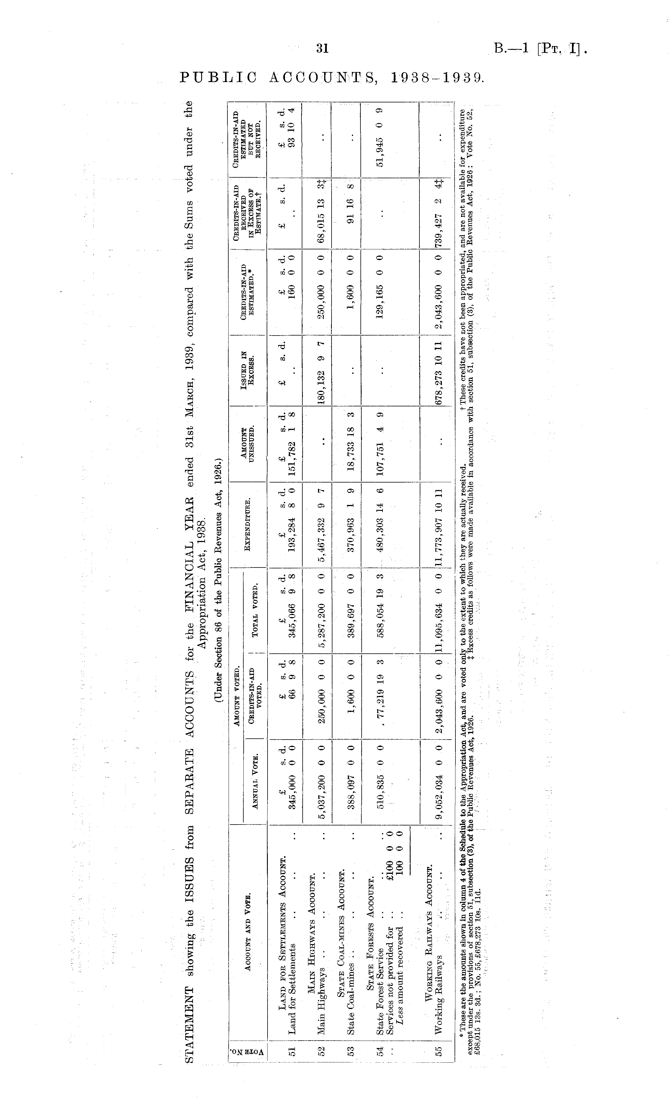(Under Section 86 of the Public Revenues Act, 1926.) S ! Amount voted. | ' Credits-in-aid Credits-in-aid H AnnoTTNT im VnTO ICxPU.NnTTTITir AMOUNT ISSUED IN CREDITS-IN-AID RECEIVED ESTIMATED H Account and Vote. .™„. t t™, Credits-in-aid Tnm .r, Jixpenditure. unissued. Excess. estimated.* in Excess of but not O A NiN IJAI- VOIH. VOTED. lOIAli VU1MI. ESTIMATE.t RECEIVED. Land for Settlements Account. £ s. d. £ s. d. £ s. d. £ s. d. £ s. d. £ s. d. £ s. d. £ s. d. £ s. d. 51 Land for Settlements .. .. .. 345,000 0 0 66 9 8 345,066 9 8 193,284 8 0 151,782 1 8 .. 160 0 0 .. 93 10 4 Main Highways Account. 52 Main Highways .. .. .. .. 5,037,200 0 0 250,000 0 0 5,287,200 0 0 5,467,332 9 7 .. 180,132 9 7 250,000 0 0 68,015 13 3} State Coal-mines Account. 53 State Goal-mines .. .. .. .. 388,097 0 0 1,600 0 0 389,697 0 0 370,963 1 9 18,733 18 3 .. 1,600 0 0 91 16 8 State Forests Account. 54 State Forest Service .. .. .. 510,835 0 0 ,77,219 19 3 588,054 19 3 480,303 14 6 107,751 4 9 .. 129,165 0 0 .. 51,945 0 9 Services not provided for .. £100 0 0 L ess amount recovered .. 100 0 0 Working Railways Account. 55 Working Railways . . .. .. 9,052,034 0 0 2,043,600 0 0 11,095,634 0 0 11,773,907 10 11 .. 678,273 10 11 2,043,600 0 0 739,427 2 4{ * These are the amounts shown in column 4 of the Schedule to the Appropriation Act, and are voted only to the extent to which they are actually received. t These credits have not been appropriated, and are not available for expenditure except under the provisions of section 51, subsection (3), of the Public Revenues Act, 1926. J Excess credits as follows were made available in accordance with section 51, subsection (3), of the Public Revenues Act, 1926 : Vote No. 52, £68,015 13s. 3d.; No. 55, £678,273 10s. lid.