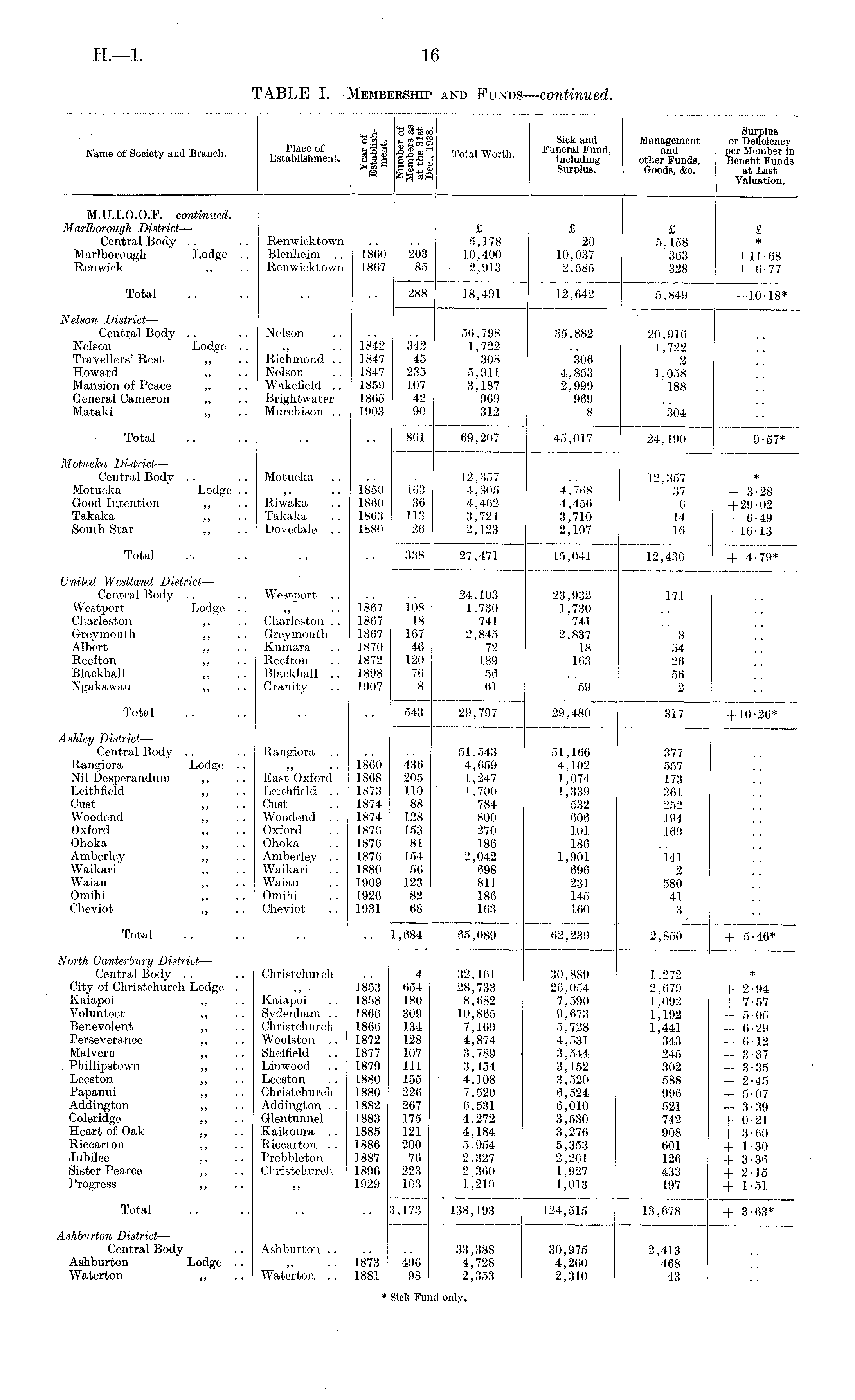 A "8 a ■£ oo I Surplus M»gg Sick and Management or Deficiency Kamfi of Sm>lptv ind Brnni-li 1 lace oi !s 3 9 aS« ri Tnfni Wnrfh Funeral Fund, and per Member in JName oi Society and .Branch. Establishment. 1«S sfgj lotal Wortn - including other Funds, Benefit Funds "*& $&■*% Surplus. Goods, *c. at Last Valuation. M.U.I.O.O.F.— continued, Marlborough District— £ £ £ £ Central Body .. .. Renwiektown .. .. 5,178 20 5,158 * Marlborough Lodge .. Blenheim .. 1860 203 10,400 10,037 363 +11-68 Renwir-k „ .. Renwicktown 1867 85 2,913 2,585 328 + 6-77 Total .. .. .. .. 288 18,491 12,642 5,849 +10-18* Nelson District — Central Body .. .. Nelson 56,798 35,882 20,916 Nelson Lodge .. „ .. 1842 342 1,722 .. 1,722 Travellers' Rest ,, .. Riehmond .. 1847 45 308 306 2 Howard „ .. Nelson .. 1847 235 5,911 4,853 1,058 Mansion of Peace „ .. Wakeficld .. 1859 107 3,187 2,991) 188 General Cameron „ .. Brightwater 1865 42 969 969 Mataki „ .. Murchison .. 1903 90 312 8 304 Total .. .. .. .. 861 60,207 45,017 24,190 + 9-57* Motueka District — Central Body .. .. Motueka .. .. .. 12,357 .. 12,357 * Motueka Lodge.. ,, .. 1850 11)3 4,805 4,768 37 _ 3-28 Good Intention ,, .. Riwaka .. 1860 30 4,462 4,456 6 +29-02 Takaka „ .. Takaka .. 1803 113. 3,724 3,710 14 +6-49 South Star „ .. Dovedalo .. 1880 26 2,123 2,107 16 +16-13 Total .. .. .. .. 338 27,471 15,041 12,430 +4-79* United Westland District — Central Body .. .. Westport 24,103 23,932 171 Westport Lodge .. „ .. 1807 108 1,730 1,730 Charleston ,, .. Charleston .. 1867 18 741 741 Greymouth „ .. Grcymouth 1867 167 2,845 2,837 8 Albert ,, . . Kumara .. 1870 46 72 18 54 Reefton „ .. Reefton . . 1872 120 189 163 26 Blackball „ .. Blackball .. 1898 76 56 . , 56 Ngakawau ,, .. Granity .. 1907 8 01 59 2 Total .. .. .. .. 543 29,797 29,480 317 +10-26* Ashley District — Central Body .. .. Rangiora' 51,543 51,166 377 Rangiora Lodge; .. ,, .. 1860 436 4,659 4,102 557 Nil Besperandum ,, .. East Oxford 1868 205 1,247 1,074 173 Leithfleld „ .. Leithfleld .. 1873 110 ' 1,700 1,339 361 Cuat „ .. Oust .. 1874 88 784 532 252 Woodend ,, .. Woodend .. 1874 128 800 000 194 Oxford ,, .. Oxford .. 1876 153 270 101 L69 Ohoka „ .. Ohoka .. 1876 81 186 180 Amberley „ .. Amborley .. 1876 154 2,042 1,901 141 Waikari „ .. Waikari' .. 1880 56 698 696 2 Waiau „ .. Waiau .. 1909 123 811 231 580 Omihi ,, .. Omihi .. 1920 82 186 145 41 Cheviot „ .. Cheviot .. 1981 68 163 160 3 Total .. .. .. .. 1,684 65,089 62,239 2,850 + 5-46* North Canterbury District — Central Body .. .. Christchincli .. 4 32,161 30,889 1,272 * City of Christchurch Lodge .. „ 1853 654 28,733 26,054 2,679 + 2-94 Kaiapoi ,, .. Kaiapoi .. 1858 180 8,682 7,590 1,092 + 7-57 Volunteer ,, .. Sydenham .. 1860 309 10,865 9,673 1,192 + 5-05 Benevolent ,, .. Christchurch 1866 131 7,169 5,728 1,441 + 6-29 Perseverance „ .. Woolston .. 1872 128 4,874 4,531. 343 + 0-12 Malvcrn „ .. Sheffield .. 1877 107 3,789 3,544 245 + 3-87 Phillipstown „ .. Linwood .. .1879 111 3,454 3,152 302 + 3-35 Leeston ,, .. Leeston .. 1880 155 4,108 3,520 588 + 2-45 Papanui „ .. Christchurch 1880 226 7,520 6,524 996 + 5-07 Addington ,, .. Addington .. 1882 267 6,531 6,010 521 + 3-39 Coleridge „ .. Glentunnel 1883 175 4,272 3,530 742 +0-21 Heart of Oak ,, .. Kaikoura .. 1885 121 4,184 3,276 908 + 3-60 Riccarton ,, .. Riecarton .. 1886 200 5,954 5,353 601 + 1-30 Jubilee ,, .. Prebbleton 1887 76 2,327 2,201 126 + 3-36 Sister Pearco ,, .. Christohuroh 1896 223 2,360 1,927 433 +2-15 Progress „ „ 1929 103 1,210 1,013 197 + 1-51 Total .. .. .. .. 3,173 138,193 124,515 13,078 +3-63* Ashburton District — Central Body .. Ashburton .. .. .. 33,388 30,975 2,413 Ashburton Lodge .. „ .. 1873 496 4,728 4,200 468 Waterton ,, .. Watcrton .. 1881 98 2,353 2,310 43 • Slcli Fund only.