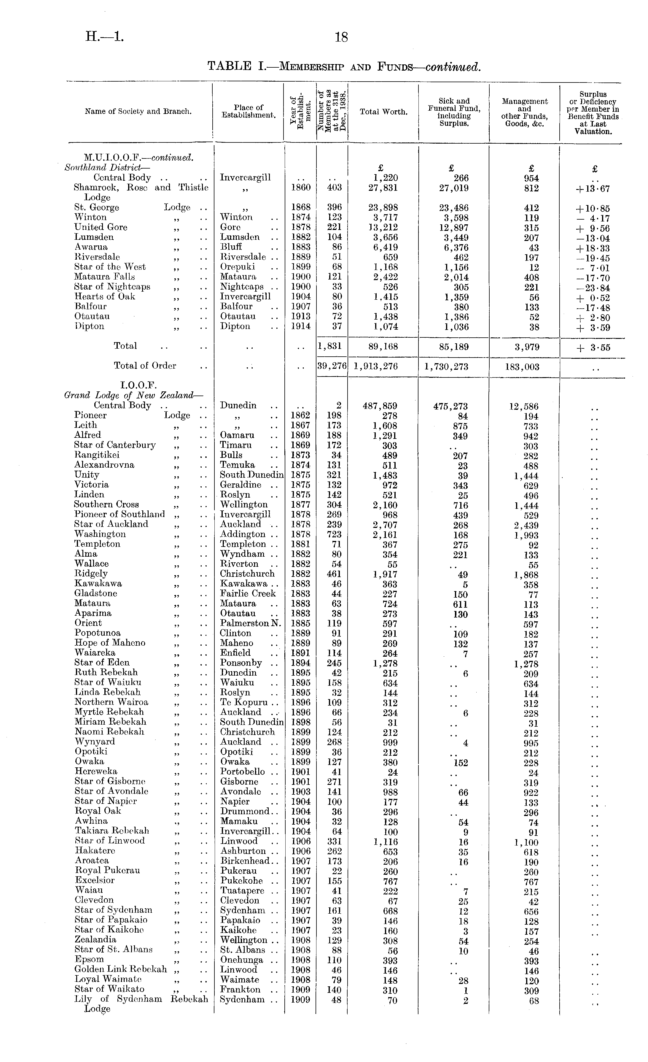 *S S "S od Surplus ° M +j «* S cc eS Sick and i Management oi* Deficiency Name of Society and Branch. "Lt Sll %%i~- Total Worth. i'luicral Fund, and prr Member in .Establishment. ■»$% S g3 o including other Funds, Heneflt Funds **a Surplus. Goods, &c. at last *H«H Valuation. M.U.I.O.O.F.— continued. Southland District — £ £ £ £ Central Body .. .. Iaveroargill .. .. 1,220 266 954 Shamrock, Rose and Thistle „ 1860 403 27,831 27,019 812 +13-67 Lodge St. George Lodge .. „ 1868 396 23,898 23,486 412 +10-85 Winton „ .. Winton .. 1874 123 3,717 3,598 119 -4-17 United Gore „ .. Gore .. 1878 221 13,212 12,897 315 + 9-56 Lumsden „ .. Lurasden .. 1882 104 3,656 3,449 207 —13-04 Awarua „ .. Bluff .. 1883 86 6,419 6,376 43 +18-33 Riversdale ,, .. Riversdale .. 1889 51 659 402 197 —19-45 Star of the West ,, .. Orepuki .. 1899 68 1,168 1,156 12 — 7-01 Mataura Falls ,, .. Mataura .. 1900 121 2,422 2,014 408 —17-70 Star of Nightcaps ,, .. Nightcaps .. 1900 33 526 305 221 —23-84 Hearts of Oak ,, .. Invercargill 1904 80 1.415 1,359 56 +0-52 Balfour „ .. Balfour .. 1907 36 513 380 133 -17-48 Otautau „ .. Otautau .. 1913 72 1,438 1,386 52 + 2-80 Dipton „ .. Dipton .. 1914 37 1,074 1,036 38 + 3-59 Total .. .. .. .. 1,831 89,168 85,189 3,979 + 3-55 Total of Order .. .. .. 39,276 1,913,276 1,730,273 183,003 I.O.O.F. Grand Lodge of New Zealand — Central Body .. .. Dunedin .. .. 2 487,859 475,273 12,586 Pioneer Lodge .. „ .. 1862 198 278 84 194 .. Lcith „ .. „ .. 1867 173 1,608 875 733 Alfred „ .. Oamaru .. 1869 188 1,291 349 942 Star of Canterbury „ .. Timaru .. 1869 172 303 .. 303 Rangitikei „ .. Bulls . . 1873 34 489 207 282 Alexandrovna „ .. Temuka .. 1874 181 511 23 488 Unity ,, .. South Dunedin 1875 321 1,483 39 1,444 '.'. Victoria „ .. Geraldine .. 1875 132 972 343 629 Linden „ . . Roslyn .. 1875 142 521 25 496 Southern Cross „ .. Wellington 1877 304 2,160 716 1,444 Pioneer of Southland „ .. Invercargill 1878 269 968 439 529 Star of Auckland „ .. Auckland .. 1878 239 2,707 268 2,439 .. Washington „ .. Addington .. 1878 723 2,161 168 1,993 .[ Templeton „ .. Tompleton .. 1881 71 367 275 92 .. Alma „ .. Wyndham .. 1882 80 354 221 133 Wallace „ . . Rivorton .. 1882 54 55 .. 55 Ridgely „ .. Christehurch 1882 461 1,917 49 1,868 Kawakawa „ . . Kawakawa . . 1883 46 363 5 358 Gladstone „ . . Fairlie Creek 1883 44 227 150 77 '. [ Mataura „ .. Mataura .. 1883 63 724 611 113 Aparima „ . . Otautau .. 1883 38 273 130 143 Orient „ .. PalmerstonN. 1885 119 597 .. 597 Popotunoa „ .. Clinton .. 1889 91 291 109 182 '.'. Hope of Mahono ,, . . Maheno .. 1889 89 269 132 137 Waiareka „ . . Enfield .. 1891 114 264 7 257 '.'. Star of Eden „ .. Ponsonby .. 1894 245 1,278 .. 1,278 ". Ruth Rebekah „ .. Dunedin .. 1895 42 215 6 209 Star of Waiuku „ . . Waiuku .. 1895 158 634 .. 634 Linda Rebekah „ .. Roslyn .. 1895 32 144 .. 144 Northern Wairoa „ .. Te Kopuru .. 1896 109 312 .. 312 Myrtle Rebekah „ .. Auckland ..- 1896 66 234 6 228 Miriam Rebekah „ .. South Dunedin 1898 56 31 .. 31 Naomi Rebekali ,, . . Christchureh 1899 124 212 212 Wynyard „ .. Auckland . . 1899 268 999 4 995 Opotiki ,, .. Opotiki . . 1899 36 212 .. 212 Owaka „ .. Owaka .. 1899 127 380 152 228 '. \ Hcreweka ,, .. Portobello .. 1901 41 24 .. 24 Star of Gisborne „ . . Gisbornc .. 190.1 271 319 319 Star of Avondale „ . . Avondalc .. 1903 141 988 66 922 Star of Napier ,, . . Napier .. 1904 100 177 44 133 Royal Oak „ .. Drummond.. 1904 36 296 .. 296 Awhiria „ . . Mamaku .. 1904 32 128 54 74 Takiara Rebekah „ .. Invercargill.. 1904 64 100 9 91 Star of Liawood ,, .. Linwood .. 1906 331 1,116 16 1,100 Hakatere „ .. Ashlrarton .. 1900 262 653 35 '618 Aroatea ,, .. Birkenhead.. 1907 173 206 16 190 Royal Pukerau „ .. Pukerau .. 1907 22 260 .. 260 Excelsior „ .. Pukekohe .. 1907 155 767 767 Waiau ,, .. Tuatapere . . 1907 41 222 7 215 Clevedon „ .. Clevcdon .. 1907 63 67 25 42 .. Star of Sydenham „ .. Sydenham .. 1907 161 668 12 656 Star of Papakaio „ .. Papakaio .. 1907 39 146 18 128 Star of Kaikohe „ .. Kaikohe .. 1907 23 160 3 157 Zealandia ,, .. Wellington .. 1908 129 308 54 254 Star of St, Albans „ .. St. Albans .. 1908 88 56 .10 46 Epsom „ .. Onehunga .. 1908 110 393 .. 393 Golden Link Rebekah ,, . . Linwood .. 1908 46 146 .. 146 Loyal Waimate „ .. Waimate .. 1908 79 148 28 120 '.'. Star of Waikato ,, . . Frankton .. 1909 140 310 1 309 Lily of Sydenham Rebekah Sydenham .. 1909 48 70 2 68 ,', Lodge