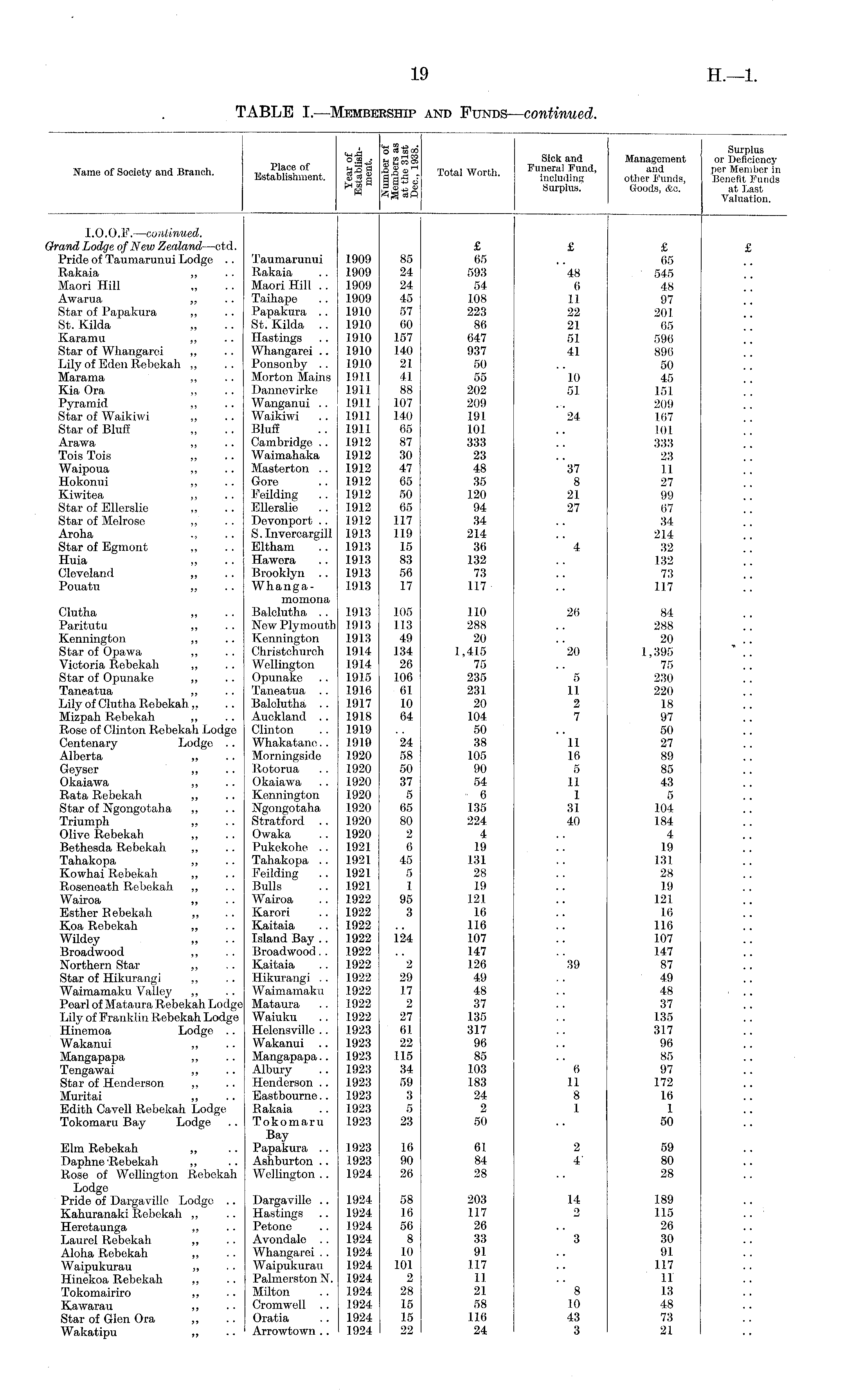 'o ce "m od Surplus °£*3 SiSSS Sick and Management or Deficiency Name of Society and Branch. v*t!hH$,™ m t S*8 H . Total Worth. Funeral Fund, and pm Member In JibtaWislinient. •jjS 9 s≤ d including other i< unds, Benefit Funds ""h s?S«o Surplus. Goods, &o. at Last W fl S'fi Valuation. i.0.0.If. — continued, Orand Lodge of New Zealand —ctd. £ £ £ £ Pride of Taumarunui Lodge .. Taumarunui 1909 85 65 .. 65 Rakaia „ .. Rakaia .. 1909 24 598 48 545 Maori Hill „ .. Maori Hill .. 1909 24 54 6 48 Awarua „ .. Taihape .. 1909 45 108 11 97 Star of Papakura „ .. Papakura .. 1910 57 223 22 201 St. Kilda „ .. St. Kilda .. 1910 60 86 21 65 Karamu „ .. Hastings .. 1910 157 647 51 596 Star of Whangarei „ .. Whangarei .. 1910 140 937 41 896 Lily of Eden Rebekah „ .. Ponsonby .. 1910 21 50 .. 50 Marama „ .. Morton Mains 1911 41 55 10 45 Kia Ora „ .. Dannevirke 1911 88 202 51 151 Pyramid „ .. Wanganui .. 1911. 107 209 .. 209 Star of Waikiwi „ .. Waikiwi .. 1011 140 191 24 167 Star of Bluff „ .. Bluff .. 1911 65 101 .. 101 Arawa „ .. Cambridge .. 1912 87 333 .. 333 Tois Tois „ .. Waimahaka 1912 30 23 .. 2.'! Waipoua „ .. Masterton .. 1912 47 48 37 11 Hokonui „ . . Gore .. 1912 65 35 8 27 Kiwitea ,, .. Feilding .. 1912 50 120 21 99 Star of Ellerslie „ .. Ellerslie .. 1912 65 94 27 67 Star of Melrose „ .. Devonport .. 1912 117 34 .. 34 Aroha ., .. S. Invercargill 1913 119 214 .. 214 Star of Egtnont „ .. Eltham .. 1913 15 36 4 32 Huia „ .. Hawera .. 1913 83 132 . . 132 Cleveland „ .. Brooklyn .. 1913 56 73 .. 73 Pouatu „ .. Whanga- 1913 17 117 .. 117 momona Clutha „ .. Balclutha .. 1913 105 110 2<i 84 Paritutu „ .. Now Plymouth 1913 113 288 .. 288 Kennington ,, .. Kennington 1913 49 20 .. 20 StarofOpawa „ .. Christchurch 1914 134 1,415 20 1,395 Victoria Rebekah „ .. Wellington 1914 26 75 .. 75 Star of Opunako „ .. Opunake .. 1915 106 235 5 230 Taneatua „ .. Taneatua .. 1916 61 231 11 220 Lily of Clutha Rebekah,. .. Balclutha .. 1917 10 20 2 18 Mizpah Rebekah „ .. Auckland .. 1918 64 104 7 97 Rose of Clinton Rebokah Lodge Clinton .. 1919 .. 50 .. 50 Centenary Lodge .. Whakatane.. 1910 24 38 11 27 Alberta ,, .. Morningside 1920 58 105 16 89 Geyser „ .. Rotorua . . 1920 50 90 5 85 Ok'aiawa „ .. Okaiawa . . 1920 37 54 11 43 Rata Rebekah „ .. Kennington 1920 5-6 1 5 Star of Ngongotaha „ .. Ngongotaha 1920 65 135 31 104 Triumph „ .. Stratford .. 1920 80 224 40 184 Olive Robekah „ .. Owaka .. 1920 2 4 .. 4 Bethosda Rebekah „ .. Pukekohe .. 1921 6 19 .. 19 Tahakopa „ .. Tahakopa .. 1921 45 131 .. 131 Kowhai Rebokah „ .. Feilding .. 1921 5 28 .. 28 Rosenoath Rebekah „ .. Bulls .. 1921 1 19 .. 19 Wairoa „ .. Wairoa .. 1922 95 12.1 .. 121 Esther Rebekah „ .. Karori .. 1922 3 16 .. 16 Koa Rebekah „ .. Kaitaia .. 1922 .. 116 .. 116 Wildey „ .. Island Bay .. 1922 124 107 .. 107 Broadwood „ .. Broadwood. . 1922 .. 147 .. 147 Northern Star ,, .. Kaitaia .. 1922 2 126 39 87 Star of Hikurangi „ .. Hikurangi .. 1922 29 49 . . 49 Waimamaku Valley „ .. Waimamaku 1922 17 48 .. 48 Pearl of Mataura Rebekah Lodge Mataura .. 1922 2 87 .. 37 Lily of Franklin Robekah Lodge Waiuku .. 1922 27 135 .. 135 Hinemoa Lodge .. Hclonsville .. 1923 61 317 .. 317 Wakanui „ .. Wakanui .. 1923 22 96 .. 96 Mangapapa „ .. Mangapapa.. 1923 115 85 .. 85 Tengawai „ .. Albury .. 1923 34 103 6 97 Star of Henderson „ .. Henderson .. 1923 59 183 11 172 Muritai „ .. Eastbourne.. 1923 3 24 8 16 Edith Cavell Rebekah Lodge Rakaia .. 1923 5 2 1 1 Tokomaru Bay Lodge .. Tokomaru 1923 23 50 .. 50 Bay Elm Rebekah „ .. Papakura .. 1923 16 61 2 59 Daphne'Rebekah „ .. Ashburton .. 1923 90 84 4' 80 Rose of Wellington Rebekah Wellington .. 1924 26 28 .. 28 Lodge Pride of Dargaville Lodge .. Bargaville .. 1924 58 203 14 189 Kahuranaki Rebekah „ .. Hastings .. 1924 16 117 2 115 Herotaunga „ .. Petone .. 1924 56 26 .. 26 Laurel Rebekah „ .. Avondalo .. 1924 8 33 3 30 Aloha Rebekah „ .. Whangarei . . 1924 10 91 .. 91 Waipukurau „ .. Waipukurau 1924 101 117 .. 117 Hinekoa Rebekah „ .. Palmerston N. 1924 2 11 .. 11 Tokomairiro „ .. Milton .. 1924 28 21 8 18 Kawarau „ .. Cromwell .. 1924 15 58 10 48 Star of Glen Ora „ .. Oratia .. 1924 15 116 43 73 Wakatipu „ .. Arrowtown.. 1924 22 24 3 21