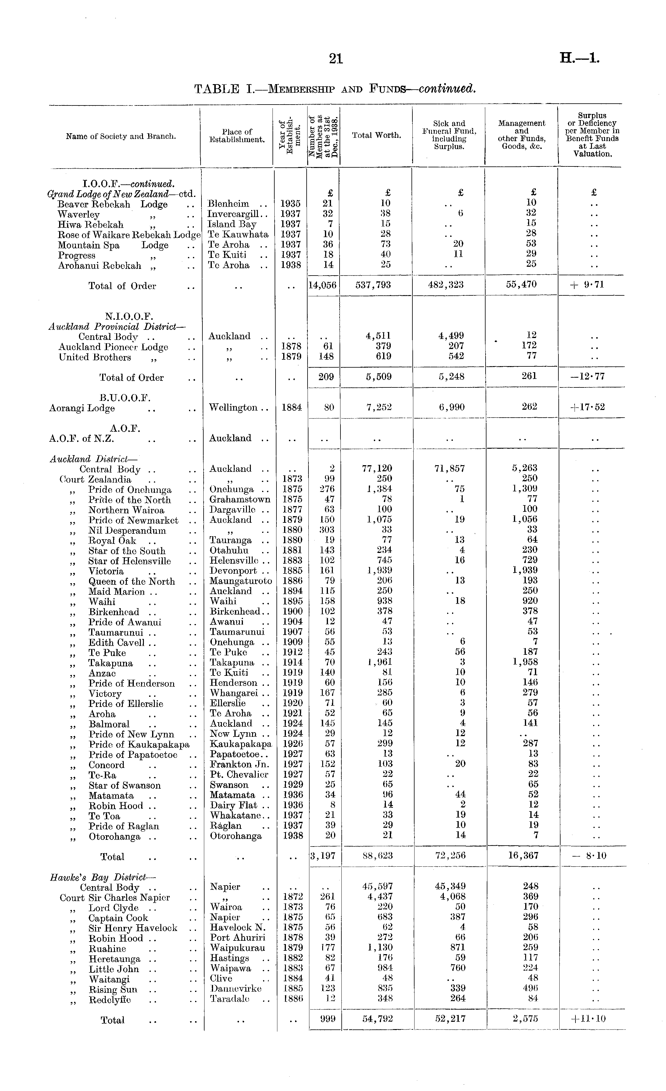 i <w m ±> • Surplus "ow . °S™" Sick and Management or Deficiency ,. ~ . i , „ , Place of n ? "§ B m 2 r r f ■ w™«. Funeral Fund. and per Member in Name of bociety and Branch. Establishment. Sβ 8 f|,g - lotal Worth. including other Funds, Benefit Funds p*fl 3g e SJ Surplus. Goods, &c. at Last M Valuation. I.O.O.F. — continued. Gyand Lodge of New Zealand —ctd. £ £ £ £ £ Beavor Rebekah Lodge .. Blenheim .. 1935 21 10 .. 10 Waverley „ .. Invorcargill.. 1937 32 38 6 32 Hiwa Rebekah „ .. Island Bay 1937 7 15 .. 15 Rose of Waikare Rebekah Lodge Te Kauwhata 1937 10 28 .. 28 Mountain Spa Lodge .. Te Aroha .. 1937 36 73 20 53 Progress „ .. Te Kuiti .. 1937 18 40 11 29 Arohanui Rebekah „ .. To Aroha .. 1938 1.4 25 .. 25 Total of Order .. .. .. 14,056 537,793 482,323 55,470 +9-71 N.I.O.O.F. Auckland Provincial District — Central Body .. .. Auckland 4,511 4,499 12 Auckland Pioneer Lodge .. „ .. 1878 61 379 207 172 United Brothers „ . . „ .. 1879 148 619 542 77 Total of Order .. .. .. 209 5,509 5,248 261 -12-77 B.U.O.OJ , . Aorangi Lodge .. .. Wellington.. 1884 80 7,252 6,990 262 +17-52 A.O.F. A.O.F. of N.Z. .. .. Auckland Auckland District — Central Body .. .. Auckland .. .. 2 77,120 71,857 5,263 Court Zealandia .. .. „ .. 1873 99 250 .. 250 „ Pride of Onchunga .. Onehunga .. 1875 276 1,384 75 1,309 „ Pride of the North .. Grahamstown 1875 47 78 1 77 „ Northern Wairoa .. Dargavillo .. 1877 63 100 .. 100 „ Pride of Newmarket .. Auckland .. 1879 150 .1,075 19 1,056 „ Nil Desperandmn .. „ ..1880 303 33 ... 38 „ Royal Oak .. .. Tauranga .. 1880 19 77 18 64 „ Star of the South .. Otahuhu .. 1881 143 234 4 230 „ Star of Holensville .. Helensvillo .. J 883 102 745 16 729 „ Victoria .. .. Devonport .. 1885 161 1,939 .. 1,939 „ Queen of the North .. Maungaturoto 1886 79 206 13 193 „ Maid Marion.. .. Auckland .. 1894 115 250 .. 250 „ Waihi .. .. Waihi .. 1895 If>8 938 18 920 „ Birkenhead .. .. Birkonhead.. 1900 102 378 .. 378 „ Pride of Awanui .. Awanui .. 1904 12 47 .. 47 „ Taumarunui .. .. Taumarunui 1907 56 53 .. 53 ... „ Edith Cavell .. .. Onehunga .. 1909 55 13 6 7 „ TePuke .. .. Te Puke .. 1912 45 243 56 187 „ Takapuna .. .. Takapuna .. 1914 70 1,961 3 1,958 „ Anzac .. .. Te Kuiti .. 1919 140 81. 10 71 „ Pride of Henderson .. Henderson .. 1919 60 156 .10 146 „ Victory .. .. Whangarei .. 1919 167 285 8 279 „ Pride of Eilerslie .. Eilerslie .. 1920 71 60 3 57 „ Aroha .. .. To Aroha .. 1921 52 65 9 56 „ Balmoral .. .. Auckland .. 1924 145 145 4 141 „ Pride of New Lynn .. New Lynn .. 1924 29 12 12 „ Pride of Kaukapakapa Kaukapakapa. 1926 57 299 12 287 ,, Pride of Papatoetoc .. Papatoetoe.. 1927 63 13 .. 13 „ Concord .. .. Frankton Jn. 1927 152 103 20 83 „ Tc-Ra .. .. Pt. Chevalier 1927 57 22 .. 22 „ Star of Swanson .. Swanson .. 1929 25 t>5 .. 65 „ Matamata .. .. Matamata .. 1936 34 96 44 52 „ Robin Hood .. .. Dairy Flat .. 1936 8 14 2 12 „ TeToa .. .. Whakatane.. 1937 21 33 19 14 „ Pride of Raglan .. Raglan .. 1937 39 29 10 19 „ Otorohanga .. .. Otorohanga 1938 20 21 14 7 Total .. .. .. .. 3,197 88,623 72,256 16,367 - 8-10 Hawke's Bay District — Central Body .. .. Napier 45,597 45,349 248 Court Sir Charles Napier .. „ .. 1872 261 4,437 4,068 369 „ Lord Clyde .. .. Wairoa .. 1873 76 220 50 170 „ Captain Cook .. Napier .. 1875 65 683 387 296 „ Sir Henry Havelock .. Havelock N. 1875 56 62 4 58 Robin Hood .. .. Port Ahuriri 1878 39 272 66 206 „ Ruahine .. .. Waipukurau 1879 177 1,130 871 259 Heretaunga .. .. Hastings .. 1882 82 176 59 117 „ Little John .. .. Waipawa .. 1883 67 984 760 224 Waitangi .. .. Clive .. 1884 41 48 .. 48 Rising Sun .. .. Dannevirke 1885 123 835 339 496 „ Kedolyffo .. .. Taradale .. 1886 12 348 264 84 Total .. .. .. ■• 999 54,792 52,217 2,575 +11-10