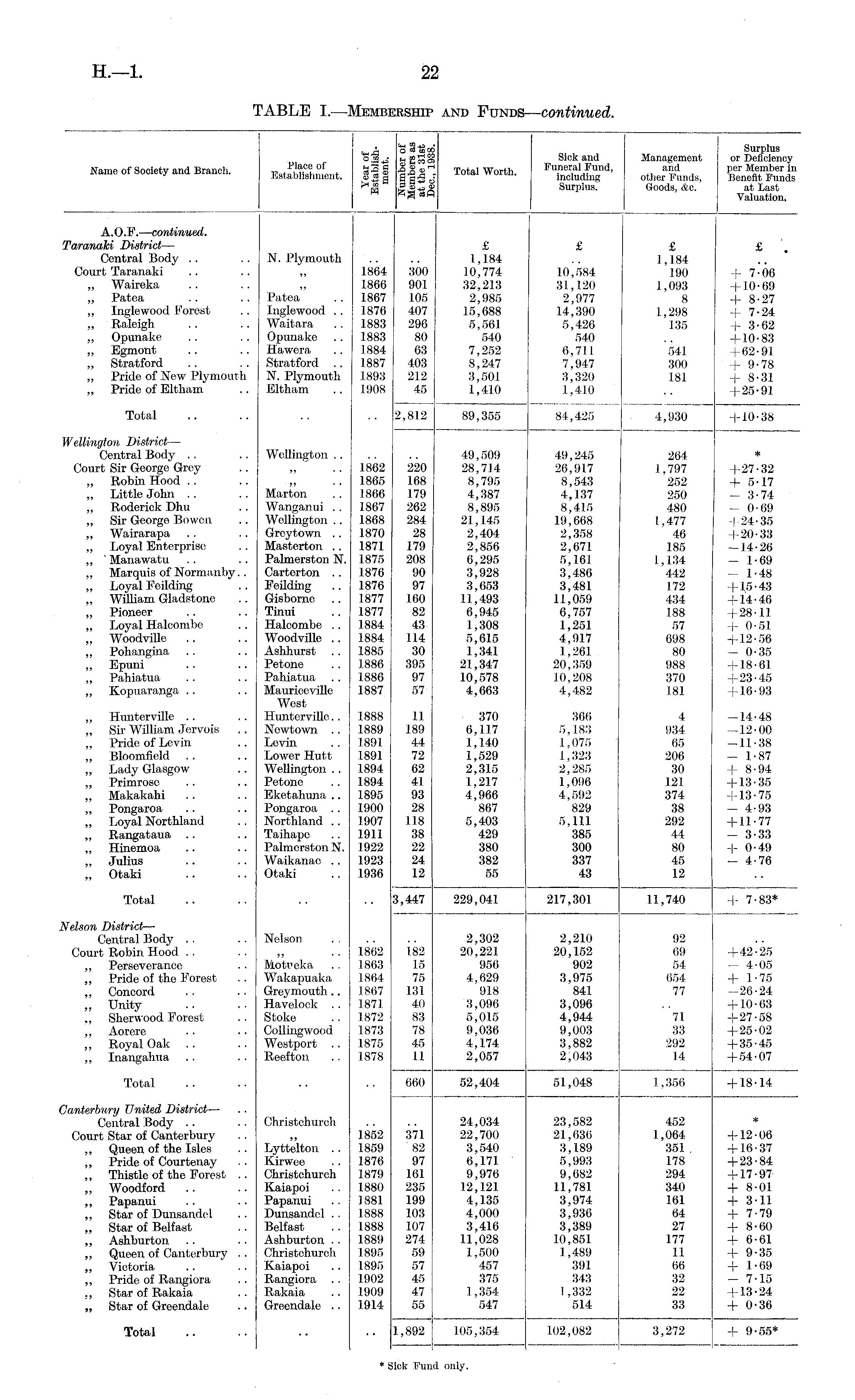 ■ 'o §"goo Surplus °£*s "£m§ Sick and Management or Deficiency Wnmo nfSnfiptv nnH Tirnnnli Place of t,3 a w 'M.i Wnrti, Funeral Fund, and per Member in Name ot Society and Branch. Establishment. 8«g ||| r J™*1 Worth, including other Funds, Benefit, Funds *& Surplus. Goods, &c. at Last "S aH Valuation. , j A.O.F. — continual. Taranalci District — £ £ £ £ Central Body .. .. N.Plymouth .. .. 1,184 .. 1,184 Court Taranaki .. .. „ 1864 300 10,774 10,584 190 + 7-06 „ Waireka .. .. „ 1866 001 32,218 31,120 1,093 +10-69 „ Patea .. .. Patea .. 1867 105 2,985 2,977 8 +8-27 „ Inglewood Forest .. Inglewood .. 1876 407 15,688 14,390 1,298 + 7-24 „ Raleigh .. .. Waitara .. 1883 296 5,561 5,426 138 + 3-62 „ Opunake .. .. Opunako .. 1883 80 540 540 .. +10-83 „ Egmont .. .. Hawora .. 1884 63 7,252 0,711 541 +62-91 „ Stratford .. .. Stratford .. 1887 403 8,247 7,947 300 + 9-78 „ Pridoof New Plymouth N. Plymouth 1893 212 3,501 3,320 181 + 8-31 „ Pride of Eltham .. Ultham .. 1908 45 1,410 1,410 .. +25-91 Total .. .. .. .. 2,812 89,355 84,425 4,930 +10-38 Wellington District — Central Body .. .. Wellington 49,509 49,245 264 * Court Sir George Grey .. „ .. 1862 220 28,714 26,917 1,797 +27-32 „ Robin Hood .. .. ,, .. 1865 168 8,795 8,543 252 + 5-17 „ Little John .. .. Marton .. 1866 179 4,387 4,137 250 - 3-74 „ Roderick Dhu .. Wanganui .. 1867 262 8,895 8,415 480 - 0-69 „ Sir George Bowou .. Wellington.. 1868 284 21,145 19,668 1,477 +24-35 „ Wairarapa .. .. Greytown .. 1870 28 2,404 2,358 46 +20-33 „ Loyal Enterprise .. Masterton .. 1871 179 2,856 2,671 185 -14-26 ,, 'Manawatu .. .. Palmerston N. 1875 208 6,295 5,161 1,134 — 1-69 „ Marquis of Normanby.. Carterton .. 1876 90 3,928 3,486 442 — 1-48 „ Loyal Feilding .. Peilding .. 1876 97 3,653 3,481 172 +15-43 „ William Gladstone .. Gisbomc .. 1877 160 11,493 11,059 434 +14-46 „ Pioneer .. .. Tinui .. 1877 82 6,945 6,757 188 +28-11 „ Loyal Haloombe .. Halcombe .. 1884 43 1,308 1,251 57 + 0-51 „ Woodvillo ., .. Woodville .. 1884 114 5,615 4,917 098 +12-56 „ Pohangiua .. .. Ashhurst .. 1885 30 1,341 1,261 80 - 0-35 „ Epuni .. .. Petone .. 1886 395 21,347 20,359 988 +18-61 „ Pahiatua .. .. Pahiatua .. 1886 97 10,578 10,208 370 +23-45 „ Kopuaranga .. .. Maurioeville 1887 57 4,663 4,482 181 +16-93 West „ Hunterville .. .. Huntorvillo.. 1888 11 370 366 4 -14-48 „ Sir William J ervoiK .. Newtown .. 1889 189 6,117 5,183 934 -12-00 „ Pride of Levin .. Levin .. 1891 44 1,140 1,075 65 -11-38 „ Bloomfield .. .. Lower Hutt 1891 72 1,529 1,323 206 - 1-87 „ Lady Glasgow .. Wellington.. 1894 62 2,315 2,285 30 +8-94 „ Primrose .. .. Petone .. 1894 41 1,217 1,096 121 +13-35 „ Makakahi .. .. Eketahuna .. 1895 93 4,966 4,592 374 +13-75 „ Pongaroa .. .. Pongaroa .. 1900 28 867 829 38 — 4-93 „ Loyal Northland .. Northland .. 1907 118 5,403 5,111 292 +11-77 „ Rangataua .. .. Taihapc .. 1911 38 429 385 14 - 3-33 „ Hinemoa .. .. Palmerston N. 1922 22 380 300 80 + 0-49 „ Julius .. .. Waikanac .. 1923 24 382 337 45 - 4-76 „ Otaki .. .. Otaki .. 1936 12 55 43 12 Total .. .. .. .. 3,447 229,041 217,301 11,740 | 7-83* Nelson District — Central Body .. .. Nelson 2,302 2,210 92 Court Robin Hood .. .. „ .. 1862 182 20,221 20,152 69 +42-25 „ Perseverance .. Motveka .. 1863 15 956 902 54 -4-05 „ Pride of the Forest .. Wakapuaka 1864 75 4,629 3,975 654 + 1-75 „ Concord .. .. Greymouth.. .1867 131 918 841 77 -26-24 „ Unity .. .. Havelock .. 187.1 40 3,096 3,096 .. +10-63 ., Sherwood Forest .. Stoke .. 1872 83 5,015 4,944 71 +27-58 „ Aorere .. .. CoUingwood 1873 78 9,036 9,003 33 +25-02 ,, Royal Oak .. .. Westport .. 1875 45 4,174 3,882 292 +35-45 „ Inangahua .. .. Reofton .. 1878 11 2,057 2,043 14 +54-07 Total .. .. .. .. 660 52,404 51,048 1,356 +18-14 Canterbury United District — Central Body .. .. Christchurch .. .. 24,034 23,582 452 * Court Star of Canterbury .. „ 1852 371 22,700 41,636 1,064 +12-06 „ Queen of the Isles .. Lyttelton .. 1859 82 3,540 3,189 351. +16-37 „ Pride of Courtenay .. Kirwee .. 1876 97 6,171 5,993 178 +23-84 „ Thistle of the Forest .. Christchureh 1879 161 9,976 9,682 294 + 17-97- „ Woodford .. .. Kaiapoi .. 1880 235 12,121 11,781 340 +8-01 „ Papanui .. .. Papanui .. 1881 199 4,135 3,974 161 +311 „ Star of Dunsandel .. Dunsandel . . 1888 103 4,000 3,936 64 + 7-79 „ Star of Belfast .. Belfast .. 1888 107 3,416 3,389 27 + 8-60 „ Ashburton .. .. Ashburton . . 1889 274 11,028 10,851 177 + 6-61 „ Queen of Canterbury .. Christehurch 1895 59 1,500 1,489 11 +9-35 „ Victoria .. .. Kaiapoi .. 1895 57 457 391 66 + 1-69 „ Pride of Rangiora .. Rangiora .. 1902 45 375 343 32 - 7-15 ., Star of Rakaia .. Rakaia .. 1909 47 1,354 1,332 22 +13-24 „ Star of Greendale .. Grcendale .. 1914 55 547 514 33 +0-36 Total .. .. .. .. 1,892 105,354 102,082 3,272 +9-55* * Sick Fund only.