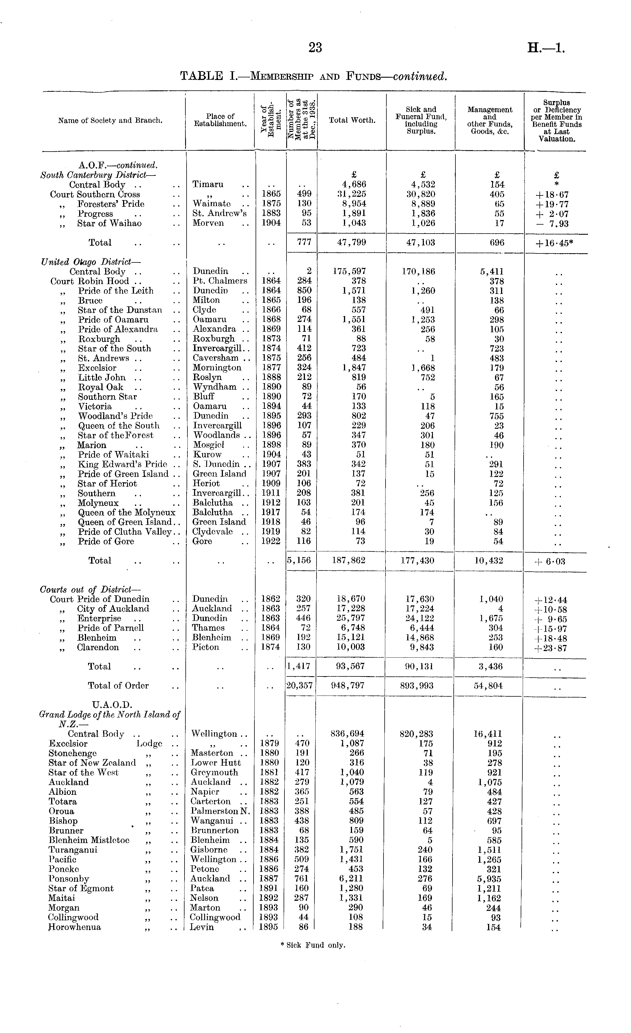 ,i "3 3 to oo I Surplus o« • n «S § sick aml Management or Deficiency „„.„, q n ,.irfv i.n,i Brnnfh Place of %£ R MS « rt Totnl Wnrth Funeral Fund, and per Member In Name of Society and Branch. Establishment. S«S S ■§•=:? including other Funds, Benefit Funds '"m £&■>*% Surplus. Goods, Ac. at Last Valuation. A.O.F. — continued. South Canterbury District — £ £ £ £ ContralBody .. .. Timaru 4,686 4,532 154 * Court Southern Cross .. „ .. 1865 499 .'{1,225 30,820 405 +18-67 „ Foresters'Pride .. Waimato .. 1875 130 8,954 8,889 65 +19-77 „ Progress .. .. St. Andrew's 1883 95 1,891 1,836 55 +2-07 „ StarofWaihao .. Morvcn .. 1904 53 1,043 1,026 17 - 7.93 Total .. .. .. .. 777 47,799 47,103 696 +16 -46* United Otago District — Central Body .. .. Dunedin .. .. 2 175,597 170,186 5,411 Court Robin Hood .. .. Pt. Chalmers 1864 284 378 .. 378 „ Pride of the Leith .. Dunedin .. 1864 850 1,571 1,260 311 „ Bruce .. . . Milton .. 1865 196 138 .. 138 „ Star of the Dunstan .. Clyde . . 1866 68 557 491 66 „ Pride of Oamaru .. Oamaru .. 1868 274 1,551 1,253 298 „ Pride of Alexandra .. Alexandra .. 1869 114 361 256 105 „ Roxburgh .. .. Roxburgh .. 1873 71 88 58 80 „ Star of the South .. Invercargill.. 1874 412 723 .. 723 „ St. Andrews . . .. Caversham .. 1875 256 484 1 483 „ Excelsior .. .. Mornington 1877 324 1,847 1,668 179 „ Little John . . . . Roslyn . . 1888 212 819 752 67 „ Royal Oak .. . . Wyndham .. 1890 89 56 .. 56 „ Southom Star .. Bluff . . 1890 72 170 5 165 „ Victoria .. .. Oamaru .. 1894 44 133 118 15 „ Woodland's Pride .. Dunedin .. 1895 293 802 47 755 „ Queen of the South .. Invercargill 1896 107 229 206 23 „ Star of theForest .. Woodlands.. 1896 57 347 301 46 „ Marion .. .. Mosgiel . . 1898 89 370 180 190 „ Pride of Waitaki .. Kurow .. 1904 43 51 51 „ King Edward's Pride .. 8. Dunedin .. 1907 383 342 51 291 „ Pride of Green Island .. Green Island 1907 201 137 1.5 122 „ StarofHeriot .. Horiot .. 1909 106 72 .. 72 „ Southern .. .. Invorcargill. . 1911 208 381 256 125 „ Molyneux .. .. Balolutha .. 1912 103 201 45 156 „ Queen of the Molyneux Balolutha .. 1917 54 174 174 „ Queen of Green Island.. Green Island 1918 46 96 7 89 „ Prido of Clutha Valley.. Clydnvalo .. 1919 82 114 30 84 „ Pride of Gore '.. Gore .. 1922 116 73 19 54 Total .. .. .. .. 5,156 187,862 177,430 10,432 +6-03 Courts out of District — Court Pride of Dunedin .. Dunedin .. 1862 320 18,670 1.7,630 1,040 +12-44 „ City of Auckland .. Auckland .. 1863 257 .17,228 17,224 4 +10-58 „ Enterprise .. .. Dunedin .. 1863 446 25,797 24,122 1,675 -|- 9-65 „ Pride of Parnell .. Thames .. 1864 72 6,748 6,444 304 +15-97 „ Blenheim .. .. Blenheim .. 1869 192 15,121 14,868 253 +18-48 „ Clarendon .. .. Picton .. 1874 130 10,003 9,843 160 +23-87 Total .. .. .. .. 1,417 93,567 90,131 3,436 Total of Order .. .. .. 20,357 948,797 893,993 54,804 U.A.O.D. Grand Lodge of the. North Island of N.Z.— Central Body .. .. Wellington 836,694 820,283 16,411 Excelsior Lodge .. „ .. 1879 470 1,087 175 912 Stonehenge ,, .. Masterton .. 1880 191 266 71 195 Star of New Zealand „ .. Lower Hutt 1880 120 316 38 278 Star of the West „ .. Greymouth 1881 417 1,040 119 921 Auckland „ .. Auckland .. 1882 279 1,079 4 1,075 Albion „ .. Napier .. 1882 365 563 79 484 Totara „ .. Carterton .. 1883 251 554 127 427 Oroua „ .. I'almerstonN. 1883 388 485 57 428 Bishop „ .. Wanganui .. 1883 438 809 112 697 Brunner ,, .. Brunnerton 1883 68 159 64 95 Blenheim Mistletoe „ .. Blenheim .. 1884 135 590 5 585 Turanganui „ .. Gisborne .. 1884 382 1,75.1 240 1,511 Pacific „ .. Wellington.. 1886 509 1,431 166 1,265 Ponoke „ .. Petone .. 1886 274 453 132 321 Ponsonby „ .. Auckland .. 1887 761 6,211 276 5,935 Star of Bgmont „ .. Patea .. 1891 160 1,280 69 1,211 Maitai „ .. Nelson .. 1892 287 1,331 169 1,162 Morgan „ .. Marton .. 1893 90 290 46 244 Collingwood „ .. Collingwood 1893 44 108 15 93 Horowhenua „ .. Levin ,. 1895 86 188 34 154 ♦ Sick Fund only.
